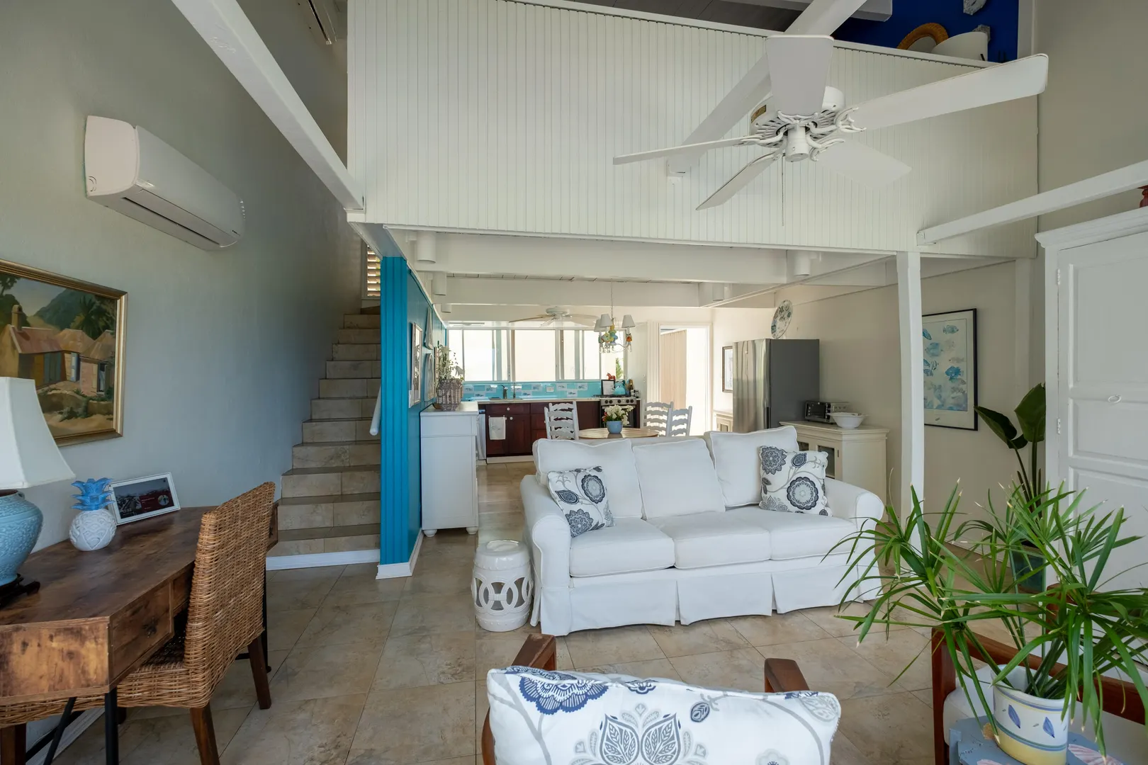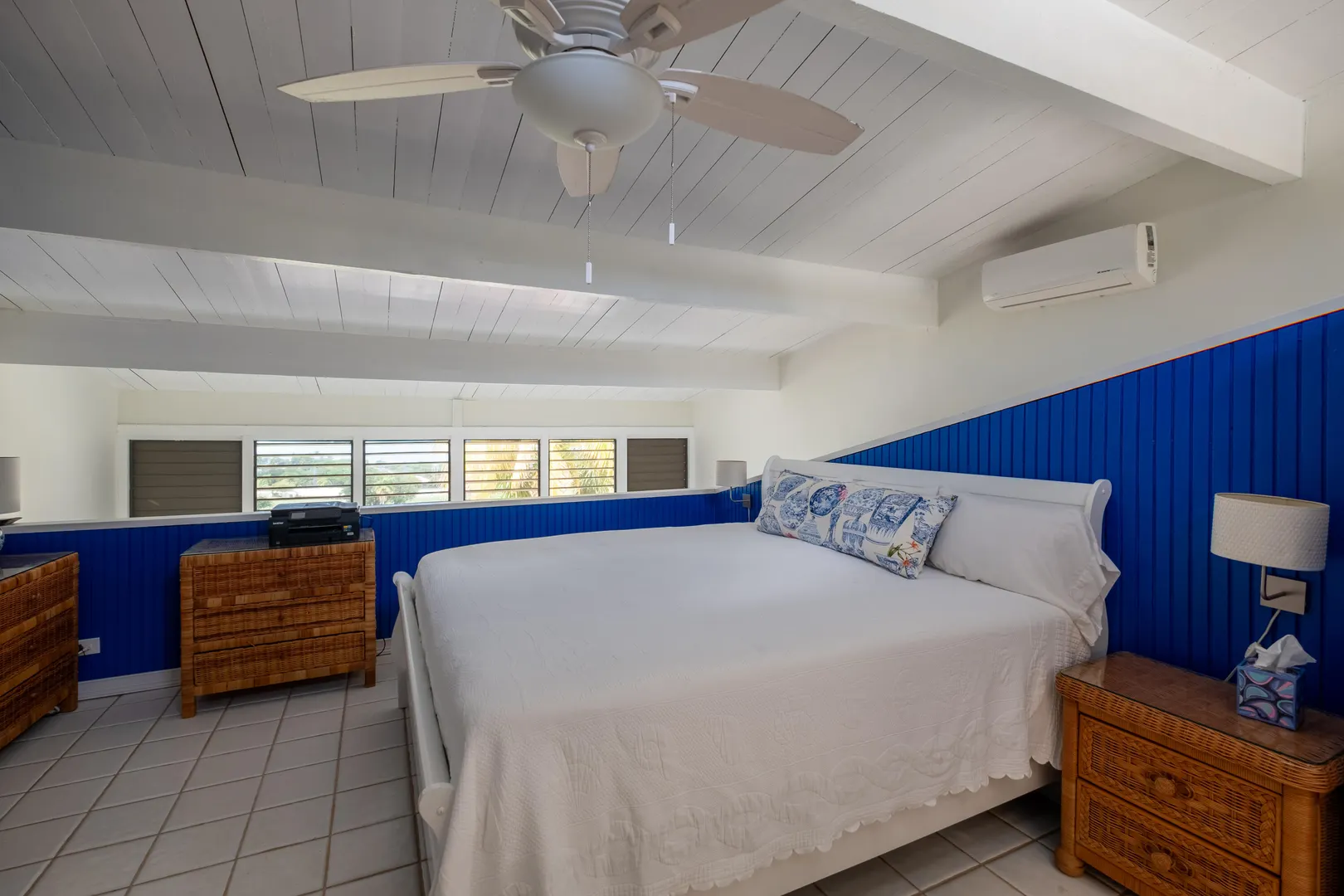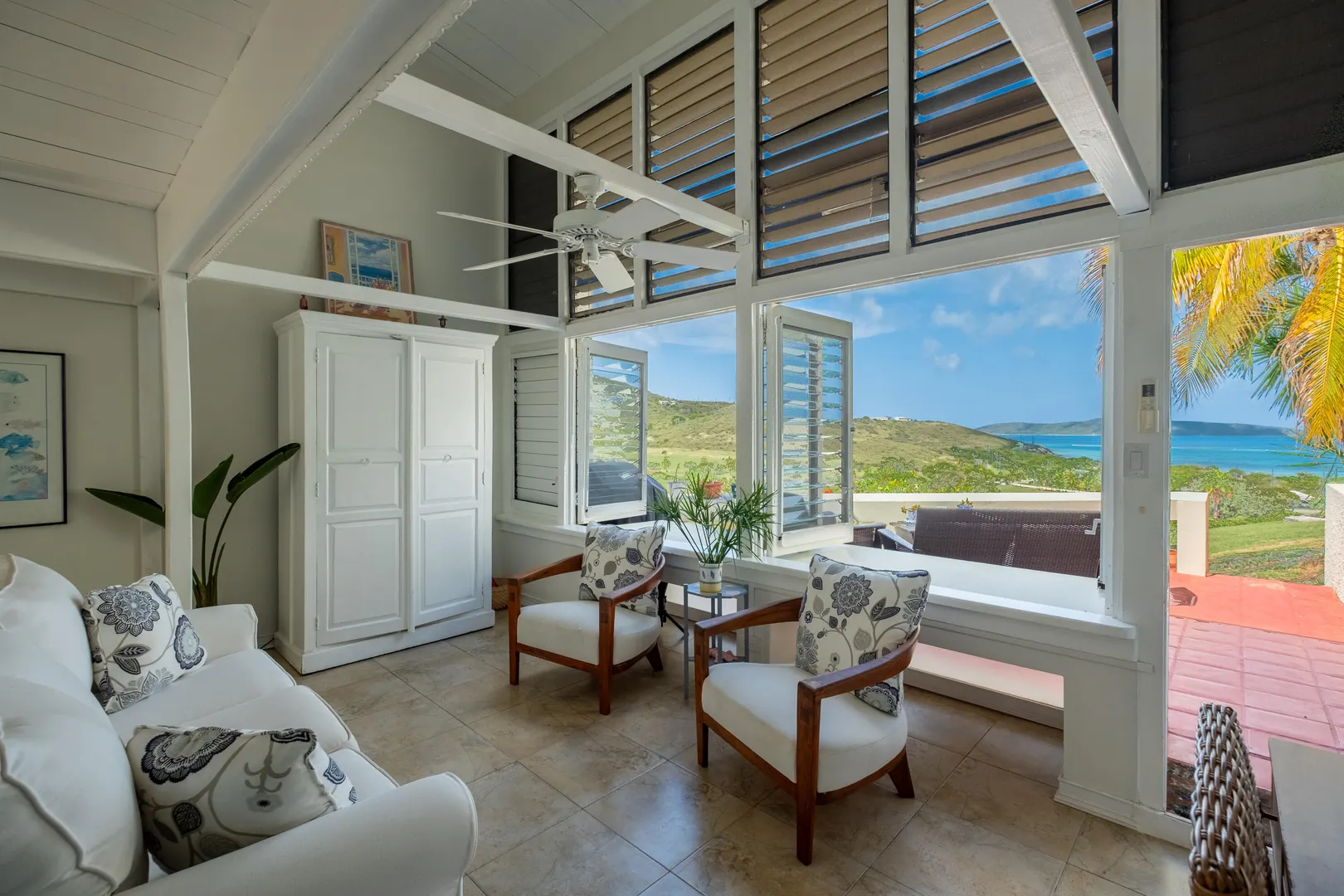 Picture perfect location - a knockout view of Buck Island surrounded by the hues of the Caribbean and framed with a palm tree! Appointed with soothing shades of blue and crisp white this beautiful stand-alone one-bedroom, one and a half bath condo on the golf course is a true island retreat, The open kitchen has a bonus gas stove and new refrigerator. There is a large retractable awning over the sea view patio nearly doubling the living space. Ceramic tile floors throughout, with a sunlit skylight and upgraded bathrooms. Amenities include large pool, golf course, a frisbee golf, tennis & pickle ball courts, a pro-shop, a sandy beach, Ollie's cafe, on-site office, & a gated entrance. Popular Duggan's Reef Restaurant is across the road, one of many eateries close by. See private remarks.