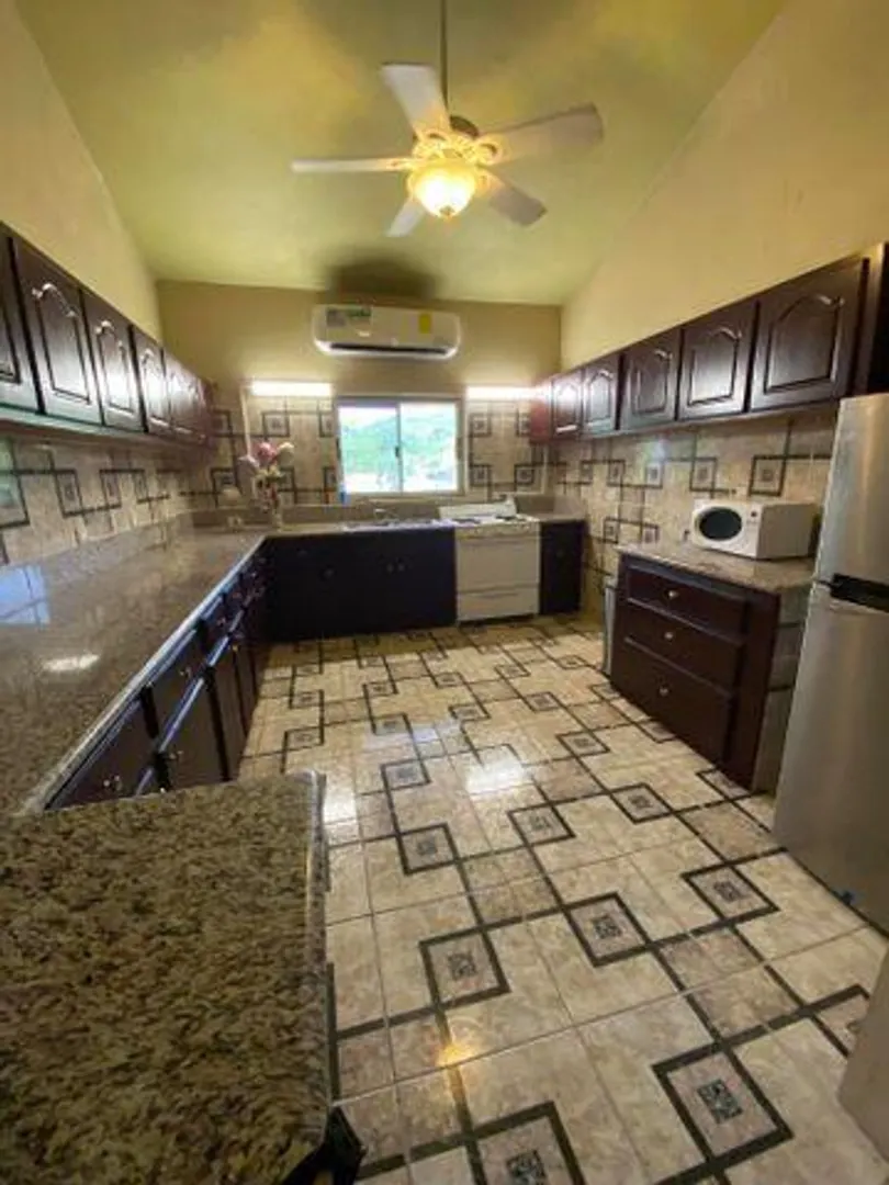 This 5 bedroom, 5 bathroom home is conveniently located--close to Sunny Isle, banks, a movie theatre, and shopping. Each bedroom is equipped with AC and en suite bathroom as well as access to the wraparound gallery. The outdoor kitchen is perfect for entertaining family and friends. There is a covered parking area for 2 cars. The flat yard is perfect for gardening and relaxing. The house has plenty of storage space below the main house. Perhaps the storage area could be converted to additional living space. Hurricane ready with a concrete roof and hurricane shutters for all windows