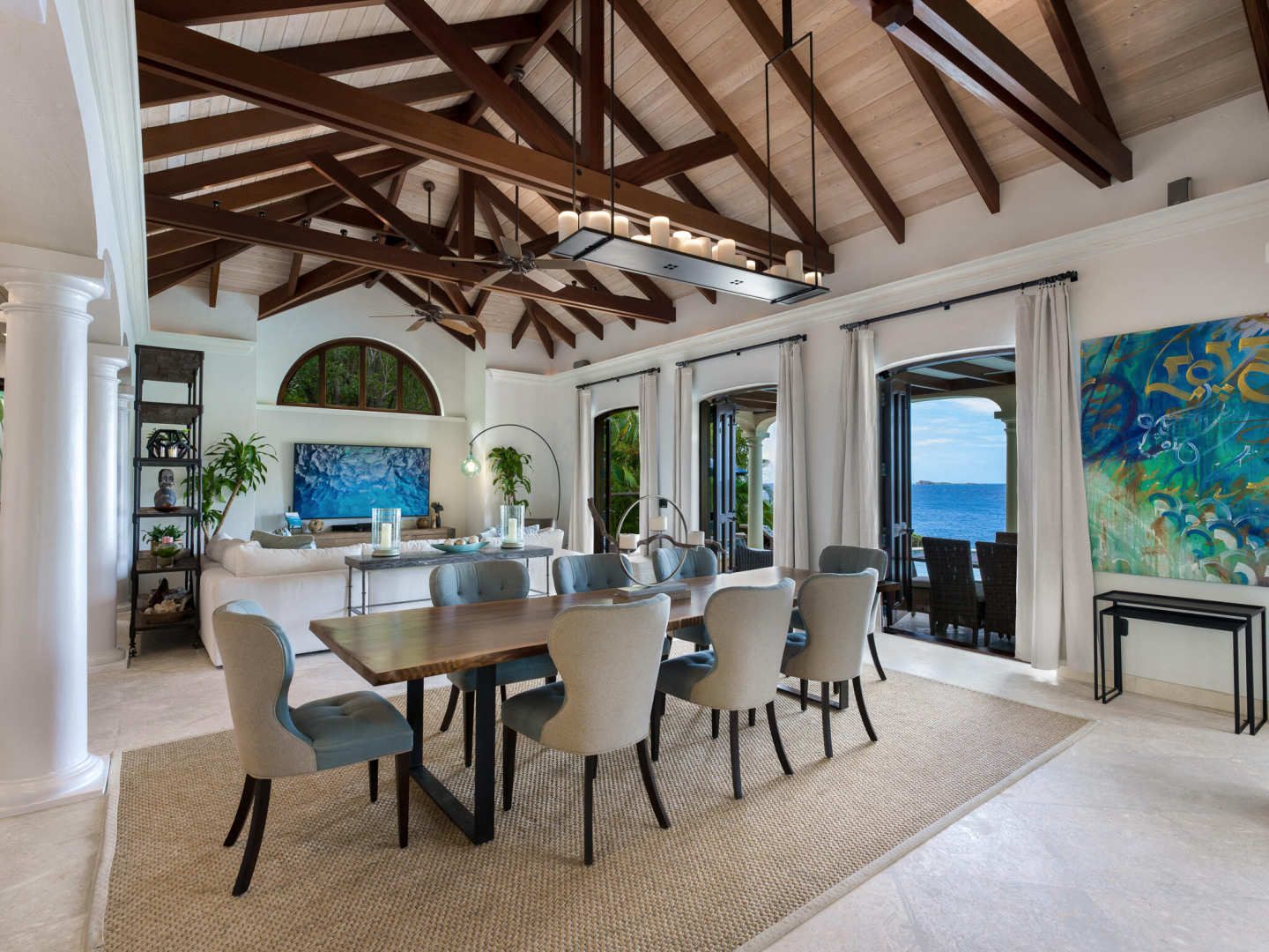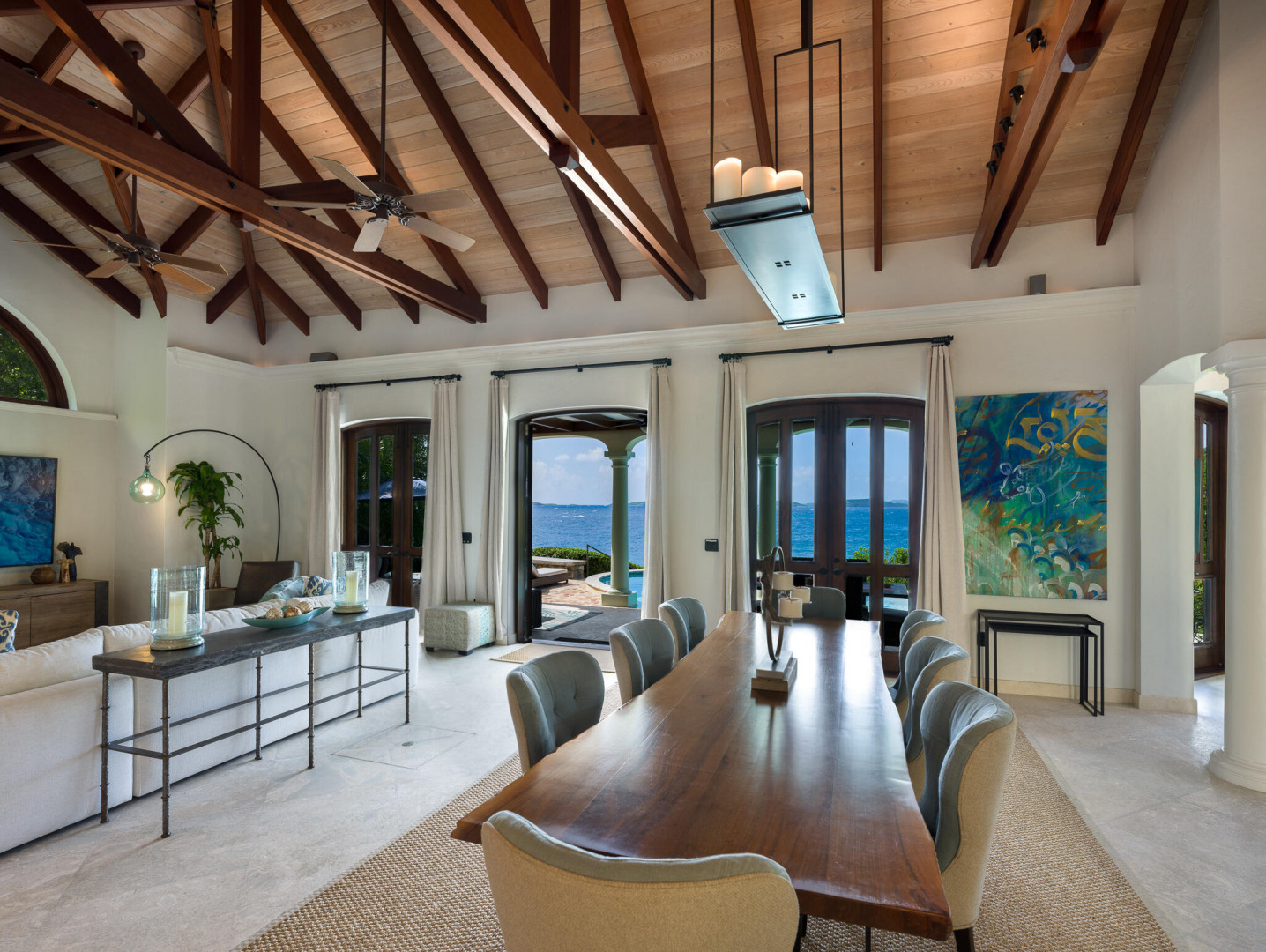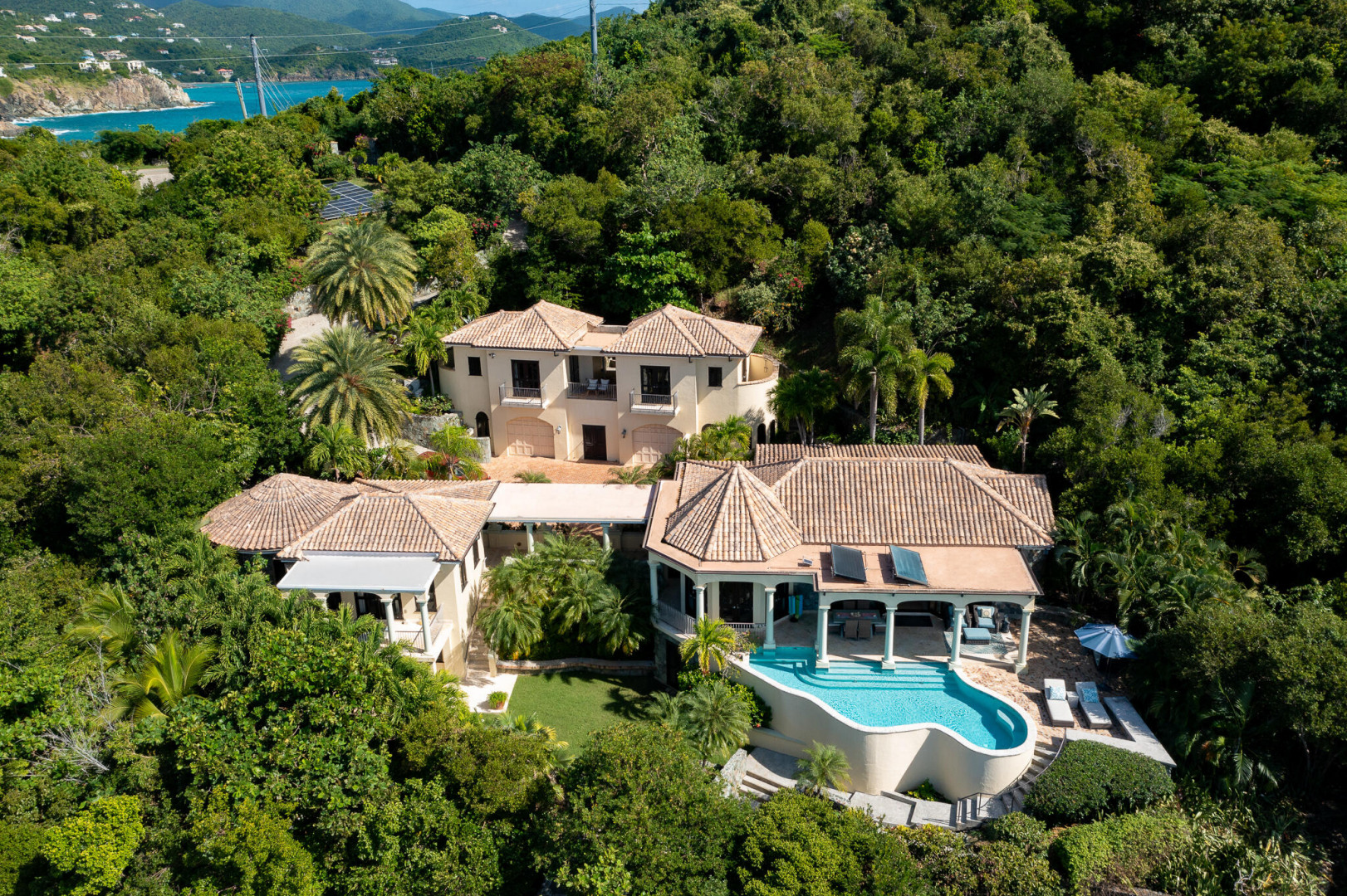 Rare Private Beachfront Beauty! Nestled on a lush acre this beautiful private villa takes your breath away with its charm & serenity. Located in the desirable Chocolate Hole neighborhood, only 5 minutes to town, TRANQUILITY VILLA provides 5+bedrooms, 5 bathrooms & boasts stunning ocean views. This gated home is steps away from your own white sand beach where you can enjoy paddle boarding, kayaking & snorkeling in the pristine bay, take an afternoon nap or watch spectacular sunsets. Beautifully appointed with numerous upgrades and benefits including: Newly remodeled kitchen, solar power, large capacity generator, new appliances, new high-end furniture, oversized two car garage, saltwater pool, private gym plus yoga deck overlooking the the Caribbean. Come live the dream at Tranquility!
