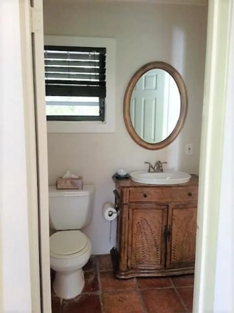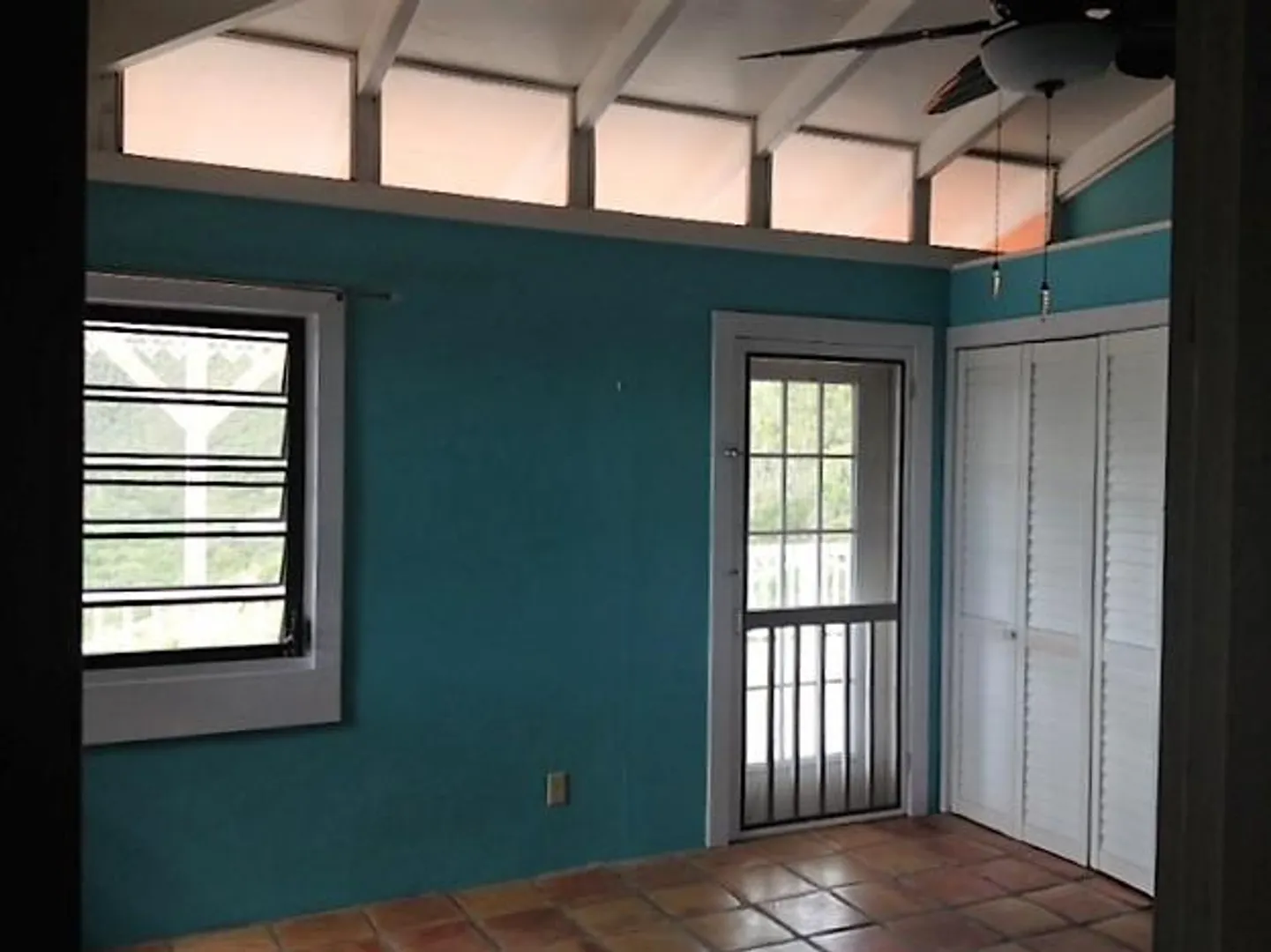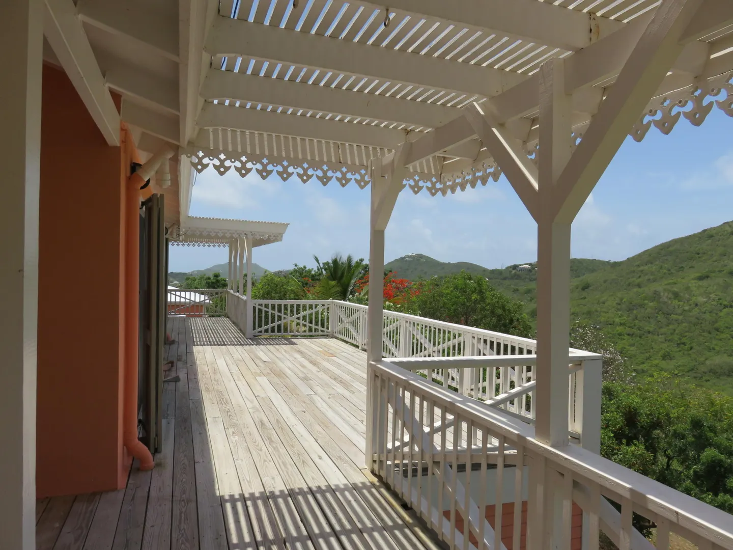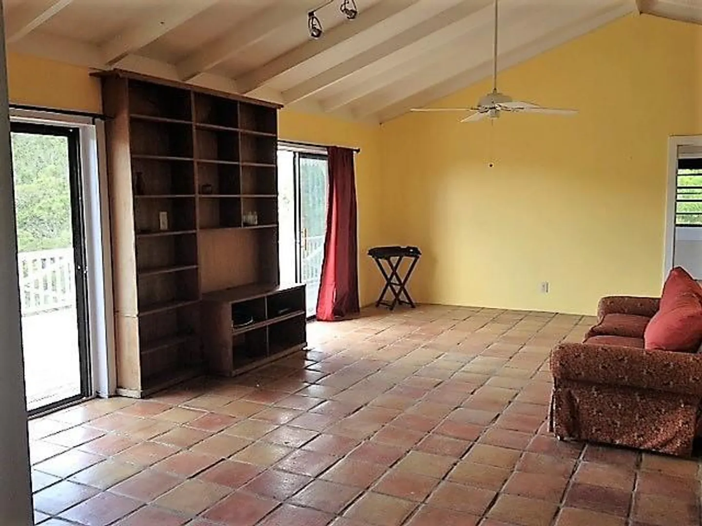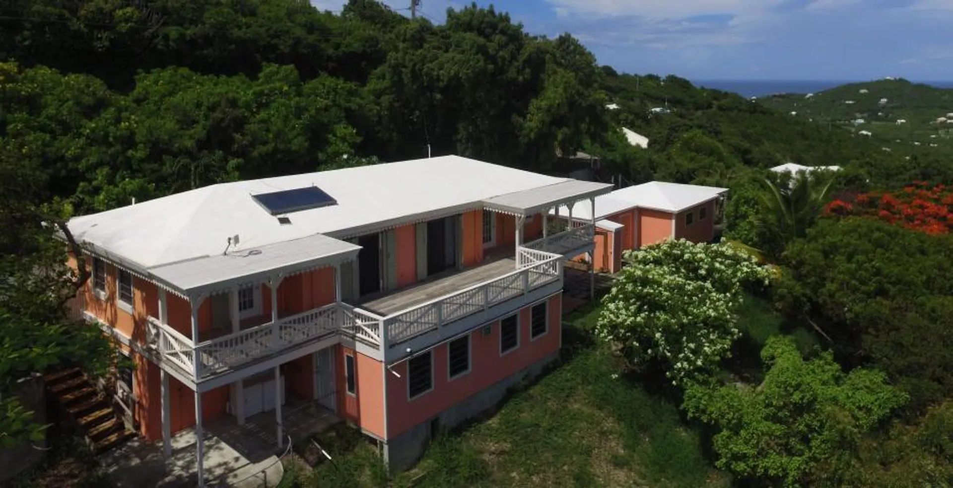 This house sustained minimal damage from hurricane Maria but has no generator. Breezy, 7 Flaggs Road. Pretty, perfectly sized family home set on 1.8 acres for plenty of privacy. Custom gingerbread trim; solar hot water; Danish hurricane shutters, Saltillo tile floors. Main house is 2 bedroom 2 en suite bathroom; large living room opening out to 650 sf deck atop the lush and unspoiled Cotton Valley from the hills of Catherine's Hope all the way to Goat Hill and the sea. Kitchen with granite countertops, dark wood cabinetry, French door Amana Fridge and gas range. Also in the lower level of the main house are 385 sf guest suite with tile patio and additional 325 sf shop/bonus room. 500sf separate rental cottage with its own parking and entrance.