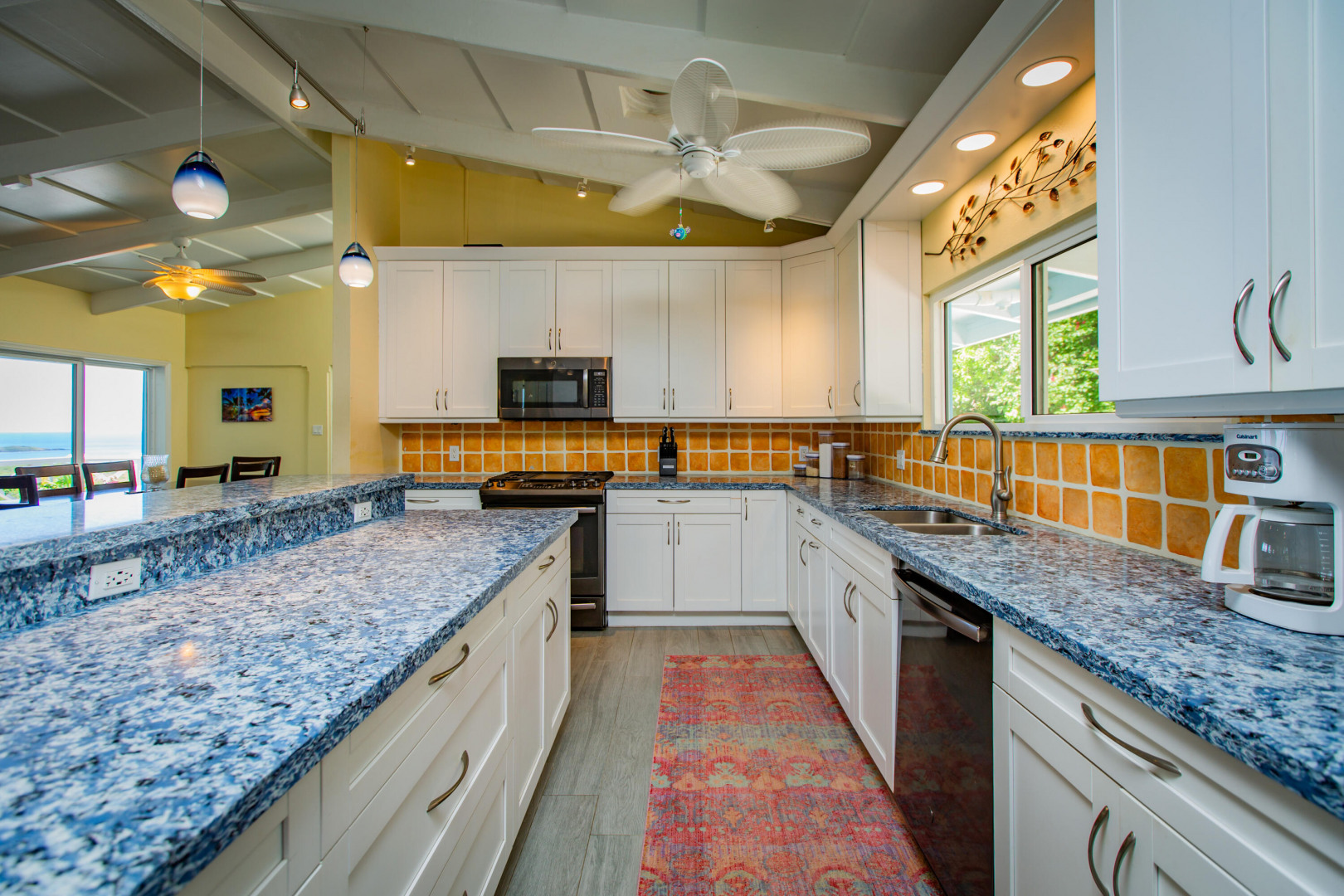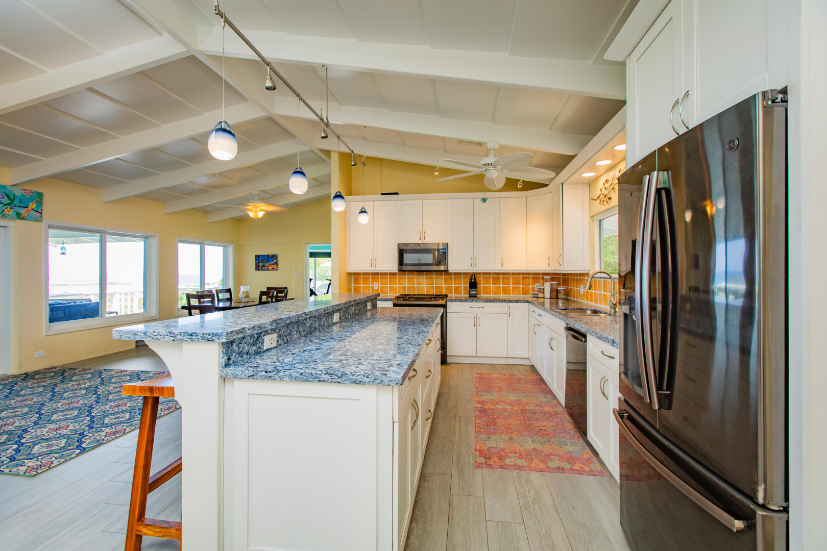Experience paradise in every corner! 3-Bedroom, 2-Bath recently remodeled tropical oasis that seamlessly blends modern luxury w/ the natural beauty of the tropics. Located in a East End residential neighborhood w/ a brand-new concrete driveway and automatic gate, this freshly painted home also features impact glass windows & doors, generator, cathedral ceilings, open floor plan, hand painted murals by local artists, custom tile work, all new flooring, new kitchen cabinets & quartz counter tops, new bathroom showers & cabinets, new skylight in guest bath, remodeled Diamond Bright pool, pool heater, new Travertine tile patios & walkways, new outdoor bar, split A/C's & private covered gallery for entertaining and soaking up those unobstructed Green Cay island and sea views!