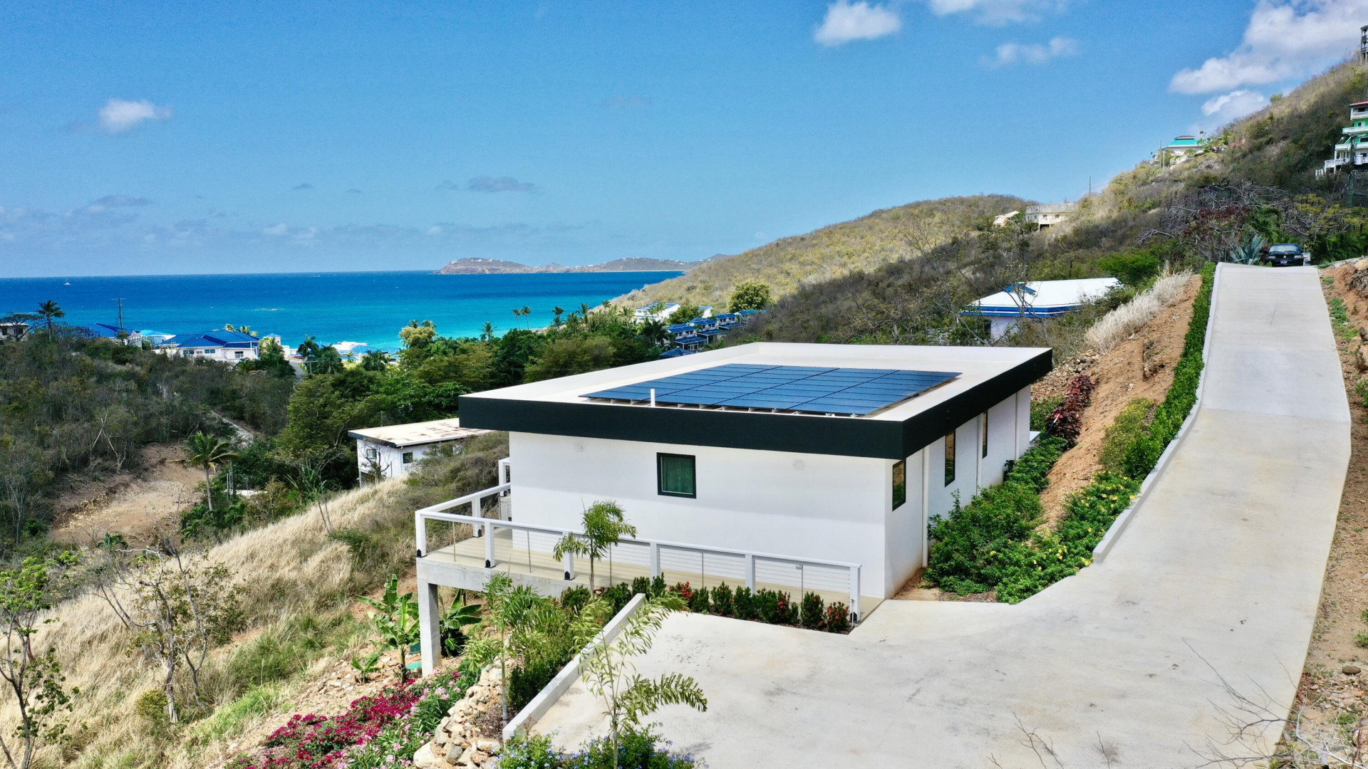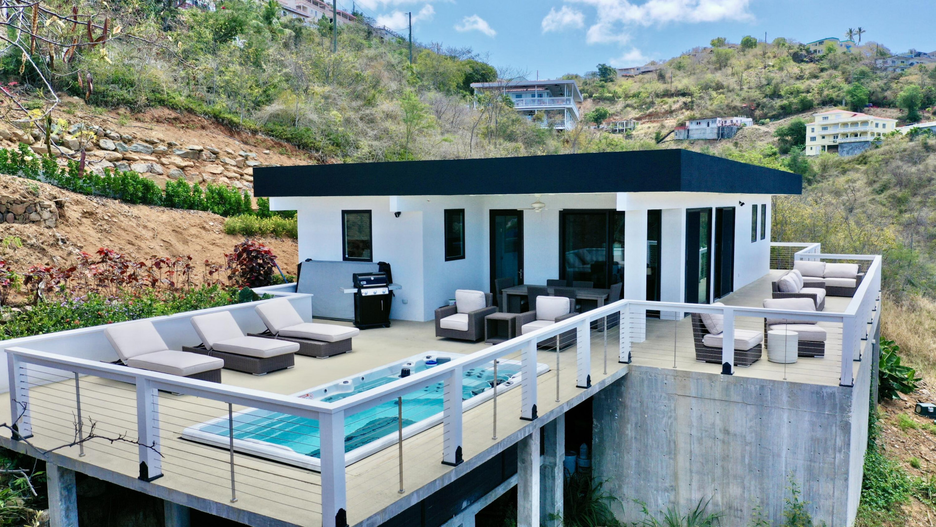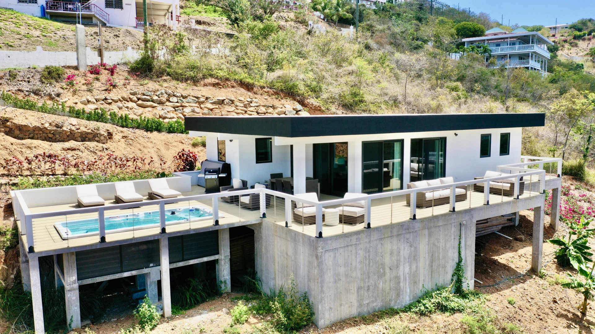 Modern Hygge (who-guh) Danish concept home with an emphasis on comfortable minimalism. High quality and eco friendly materials used. Engineered for 200mph wind speed and Pella hurricane shield windows rated for 180 mph winds. Synergy Fitness swim spa surrounded by a large deck with views towards Lime Tree. Minutes to Antilles School and Havensite. Short walk to beach and restaurant. Solar Panels and Tesla batteries!