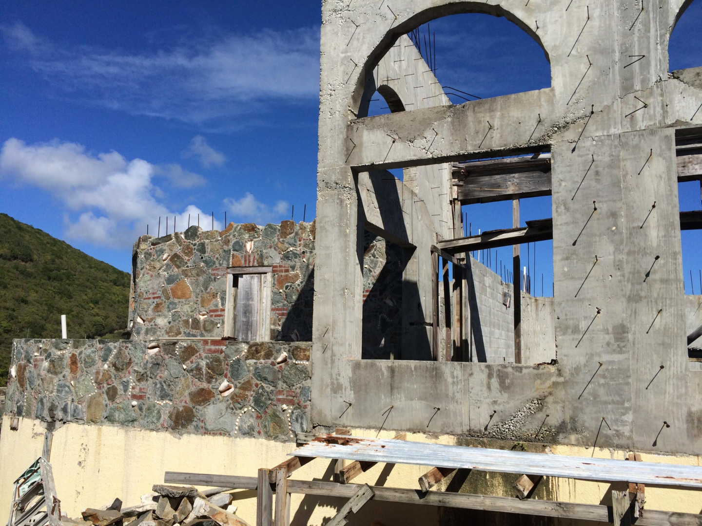A must see and priced to sell! Live in the finished downstairs 3 bedroom / 2 bath with kitchen dining and living room while completing the upper level to your taste! Multiple floor plan scenerios: there could also be two separate apartments in the lower level. Panoramic views of Rendezvous Bay, Ditleff Point, South Shore of St John and the Caribbean Sea and beyond. Property being sold as is / where as. Buyer to pay stamp tax.