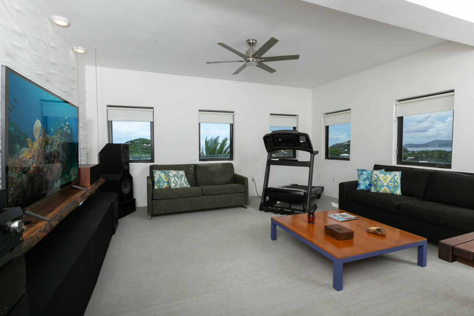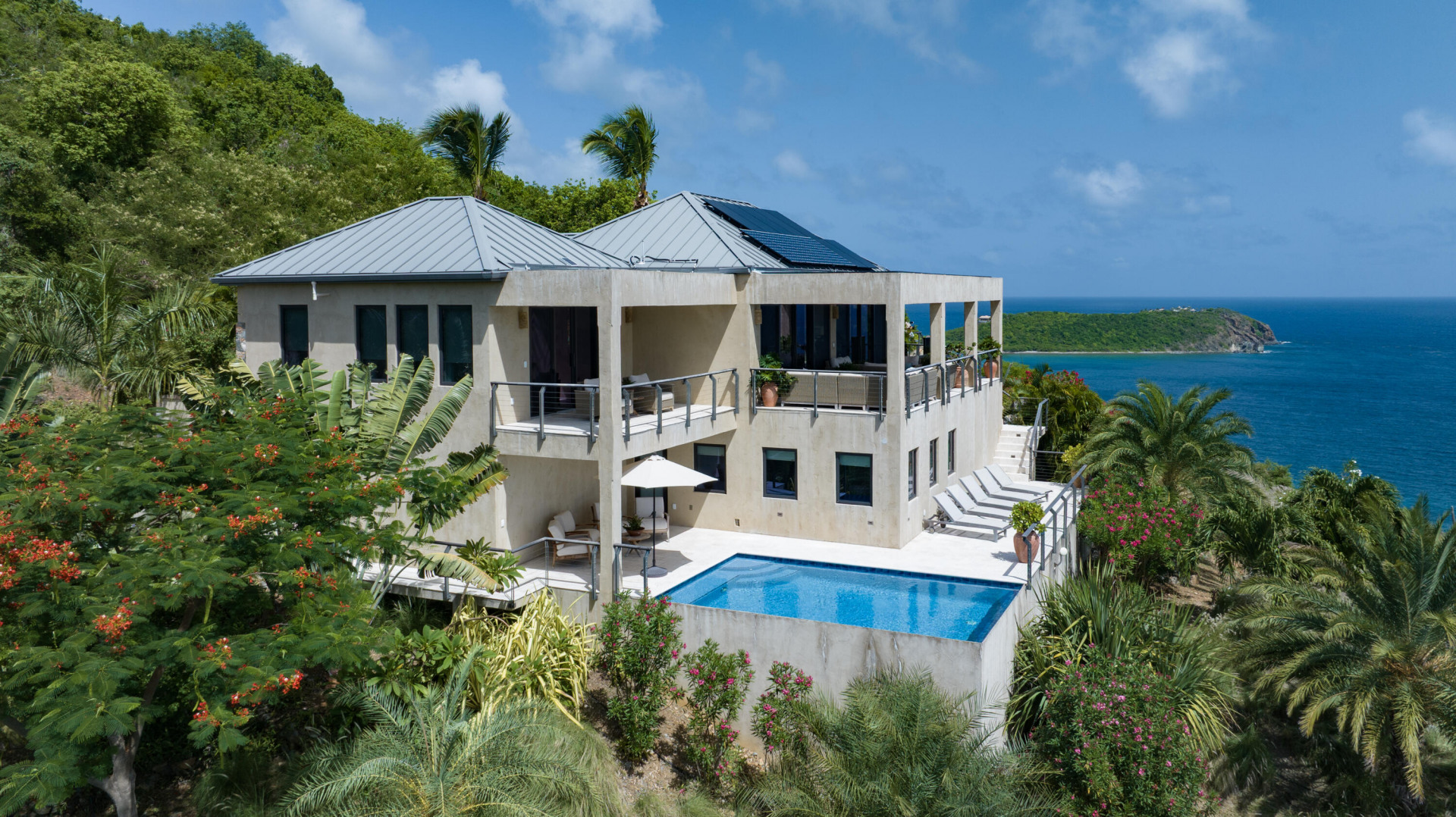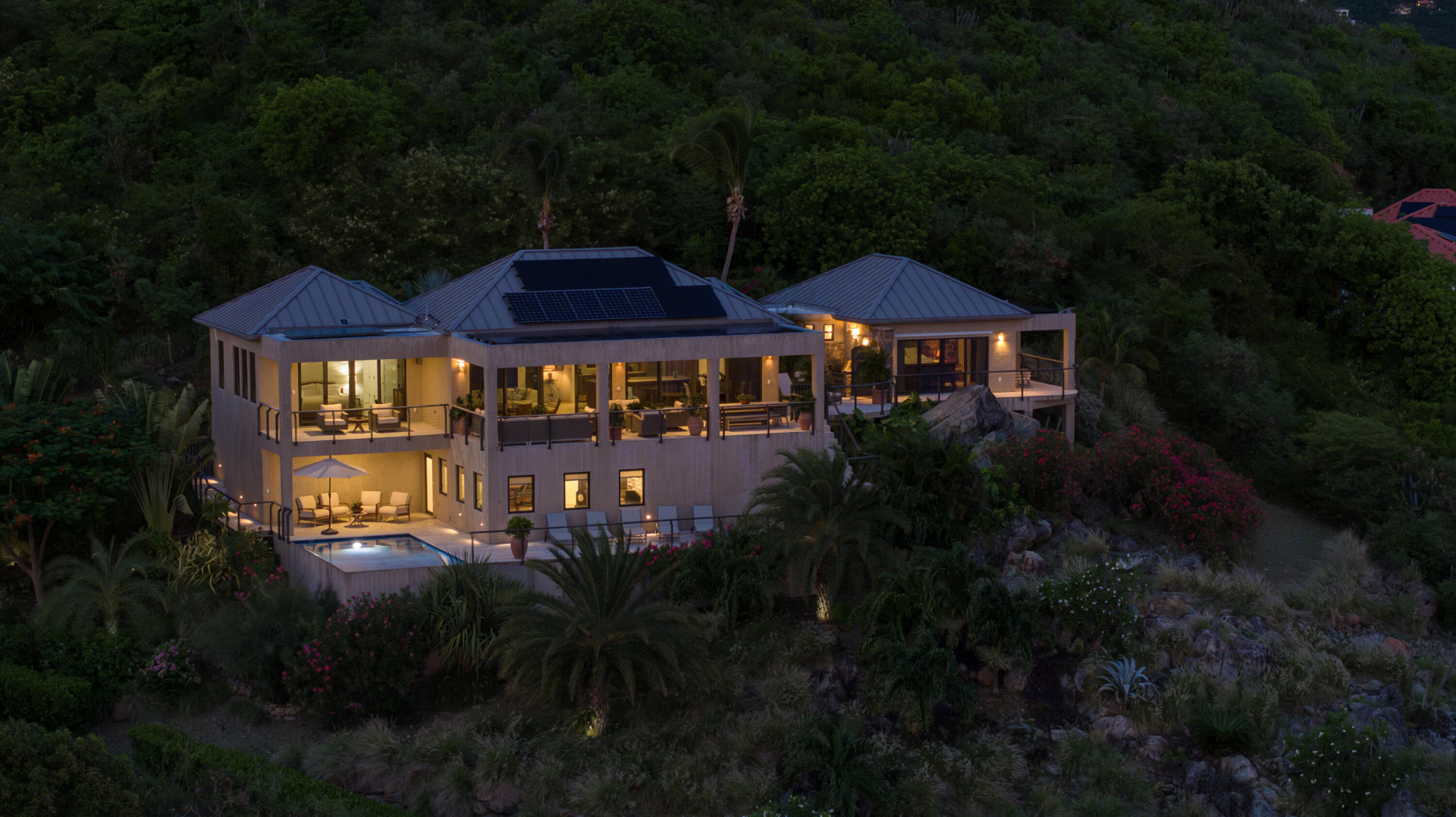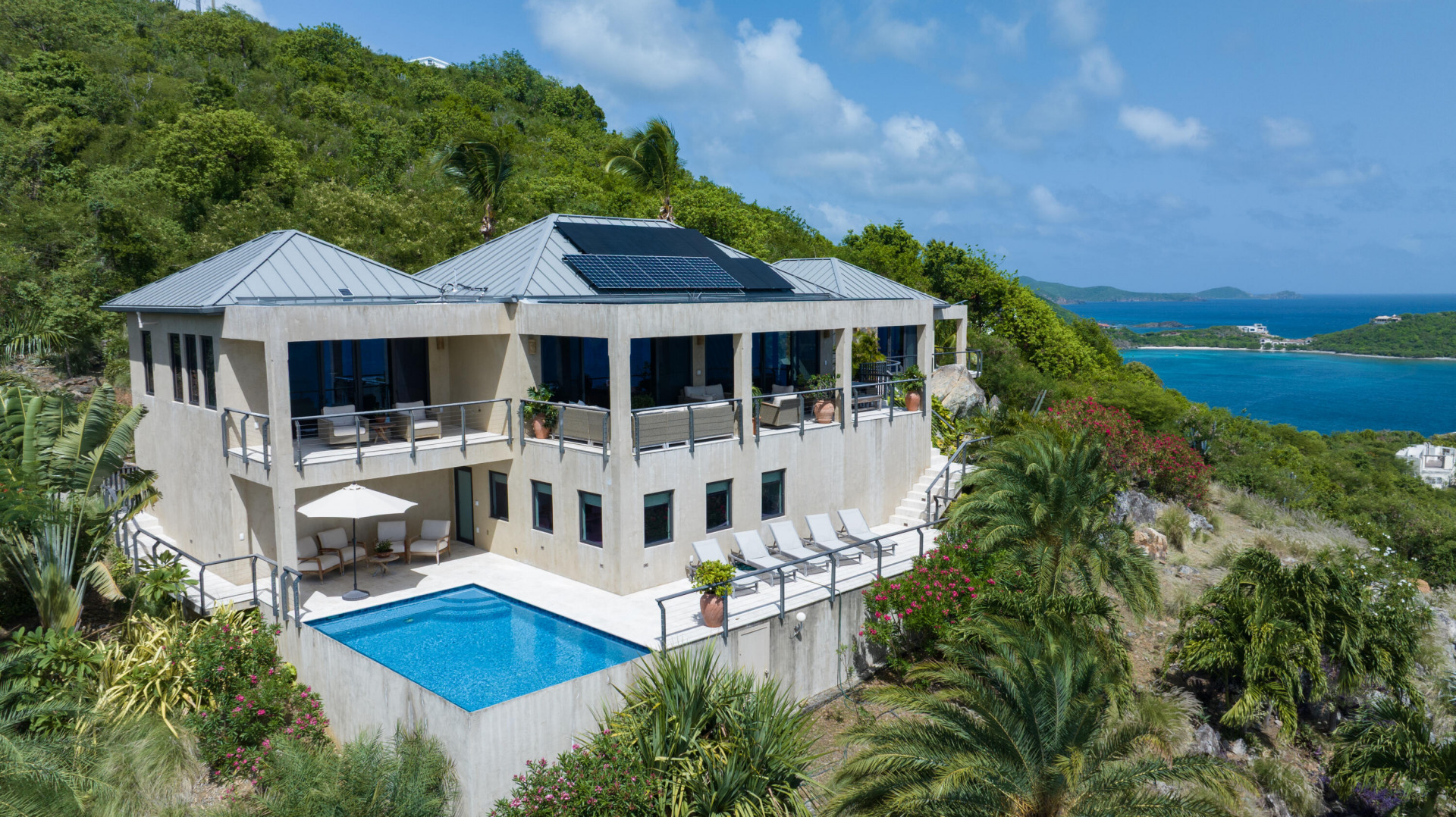 Blue View Villa, a stunning new property built in 2019, exuding a classic soft modern Caribbean style. This exceptional home is perched on a spacious plot, offering panoramic views from sunrise over the serene Ram's Head to sunset over the majestic St. Thomas. With three oversized bedrooms and en-suite bathrooms, each designed with ample space and the flexibility to convert to a 4 bedroom villa. Blue View Villa caters to both comfort and functionality, equipped with solar panels and Tesla Batteries. Located just minutes from Cruz Bay and with private neighborhood beach access within walking distance. Blue View Villa is ideally set up to operate as a vacation rental, though it is tempting to move right in!