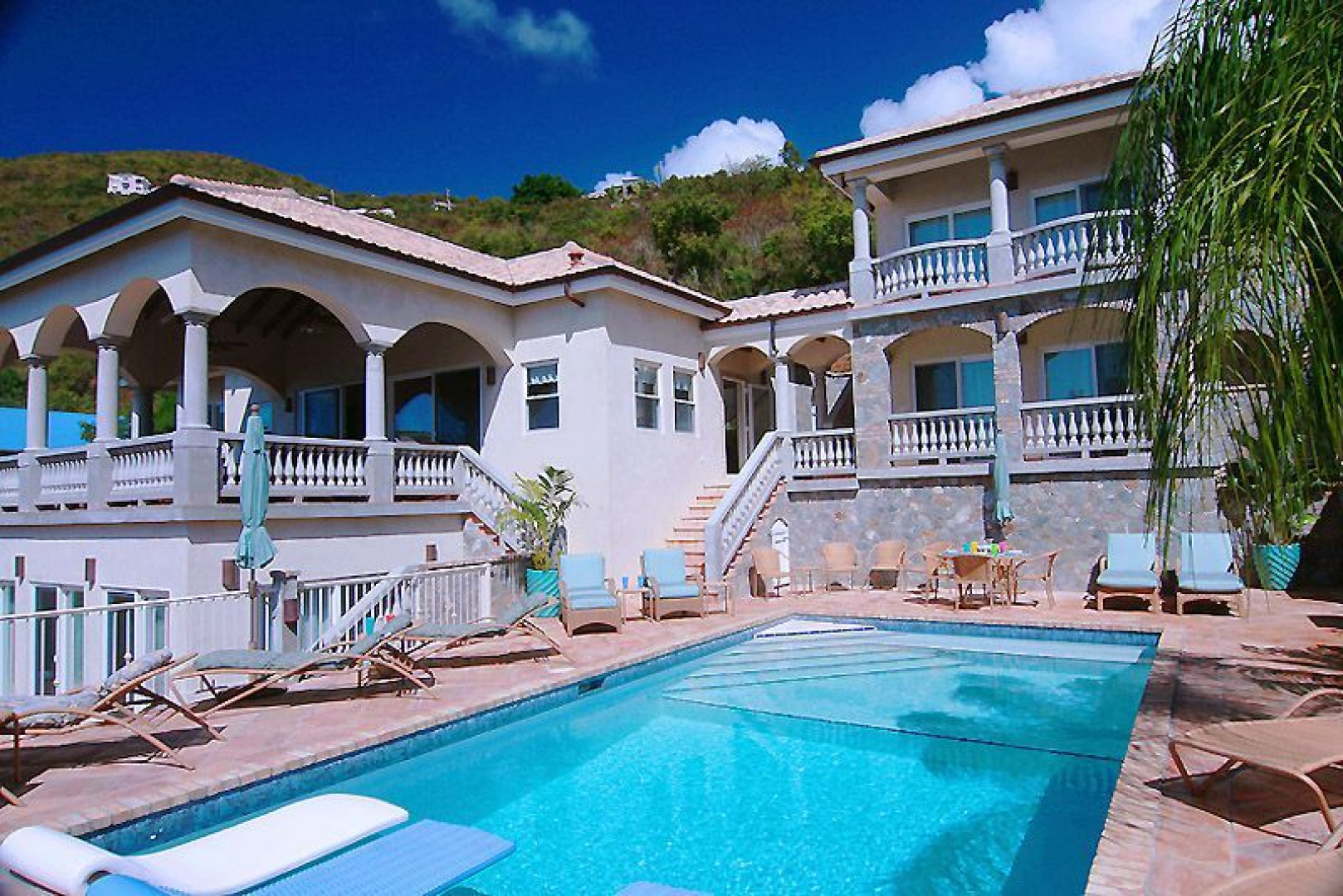 What I really loved about this place is you can snorkel from the beach (which is very easily accessible). And the snorkeling was fantastic! Better than any other place we snorkeled on the island. Both sides of Rendezvous Bay are rocky with coral reefs and had interesting and diverse fish and coral. We even saw a giant spotted eagle ray! I can't wait to go back and can't think of any place on the island I would rather stay!" Gorgeous pool villa located in one of the most desirable settings on the island Spectacular water views overlooking Ditleff Point & the Caribbean Sea Steps from the sparkling turquoise waters of Rendezvous Bay 5 bedrooms with baths en suite 6 zone climate control AC covers entire house Handcrafted mahogany kitchen cabinets, stainless appliances, granite countertops Custom mahogany interior doors Intricate stone & antique brick work Lush, professional landscaping Framed by imposing concrete arches & balustrades & a vaulted ceiling, an expansive loggia off the great room provides an additional comfortable living & dining area (450 sq. ft+/-). Mahogany cabinets in kitchen & baths, mahogany interior doors, granite bar (13 ft. long) & countertops in kitchen, baths have travertine counters, all floors are saltillo tiled, ALL rooms have AC. Offering lots of space for extended families & visiting friends, there are 4 spacious, equally sized bdrms with baths en suite & private balconies, PLUS a generously sized & very charming mstr suite highlighted by stone arches. All bdrms have outdoor stone showers & travertine vanities with double sinks. Huge pool deck with BBQ area & 15 x 30 pool, stacked water saver washer/dryer, waste treatment with grey water. Exterior features include French clay tile roof, stone exterior walls, copper gutters & light fixtures. Paved parking, wired for generator, paved estate roads & underground utilities. Living room furniture recovered 2014 Buyer to pay Tax Stamps, cooperate with 1031 exchange, & honor all confirmed rental reservations. This is an outstanding property in a truly one-of-a-kind setting on St. John. If you've been waiting for something very special to come along, please contact your agent to schedule a showing. Partial roof damage to upper bdrm pod, repair underway