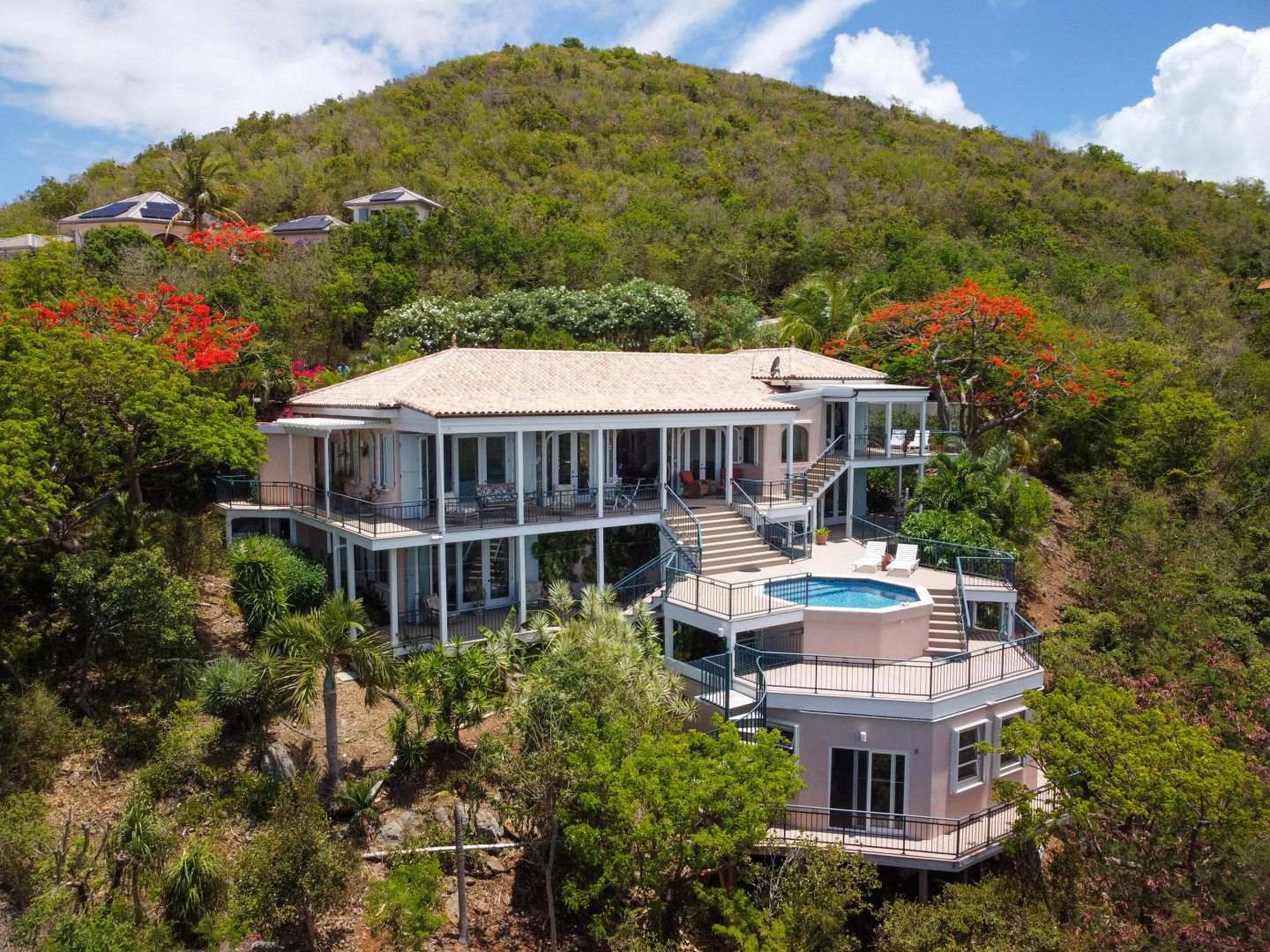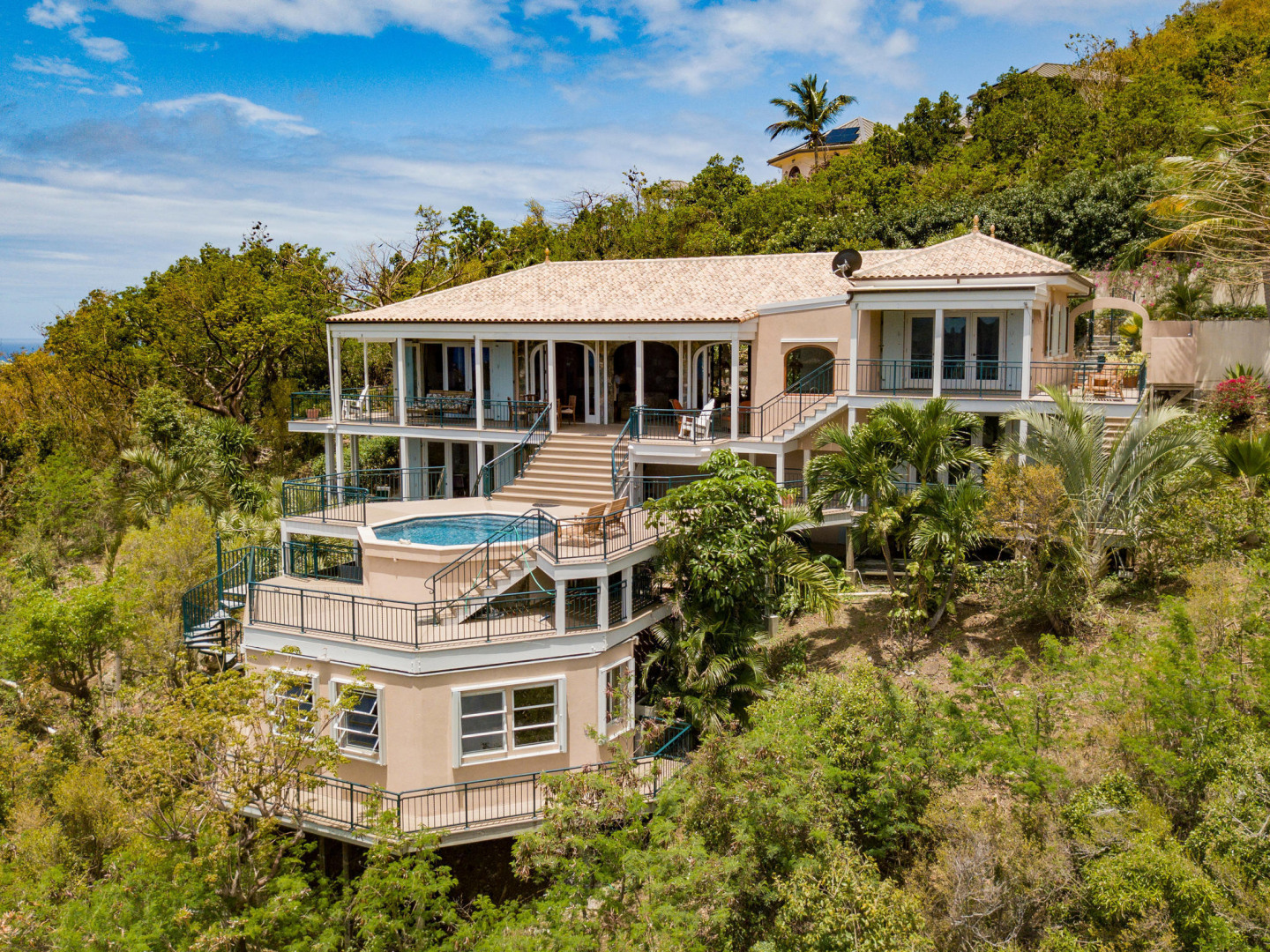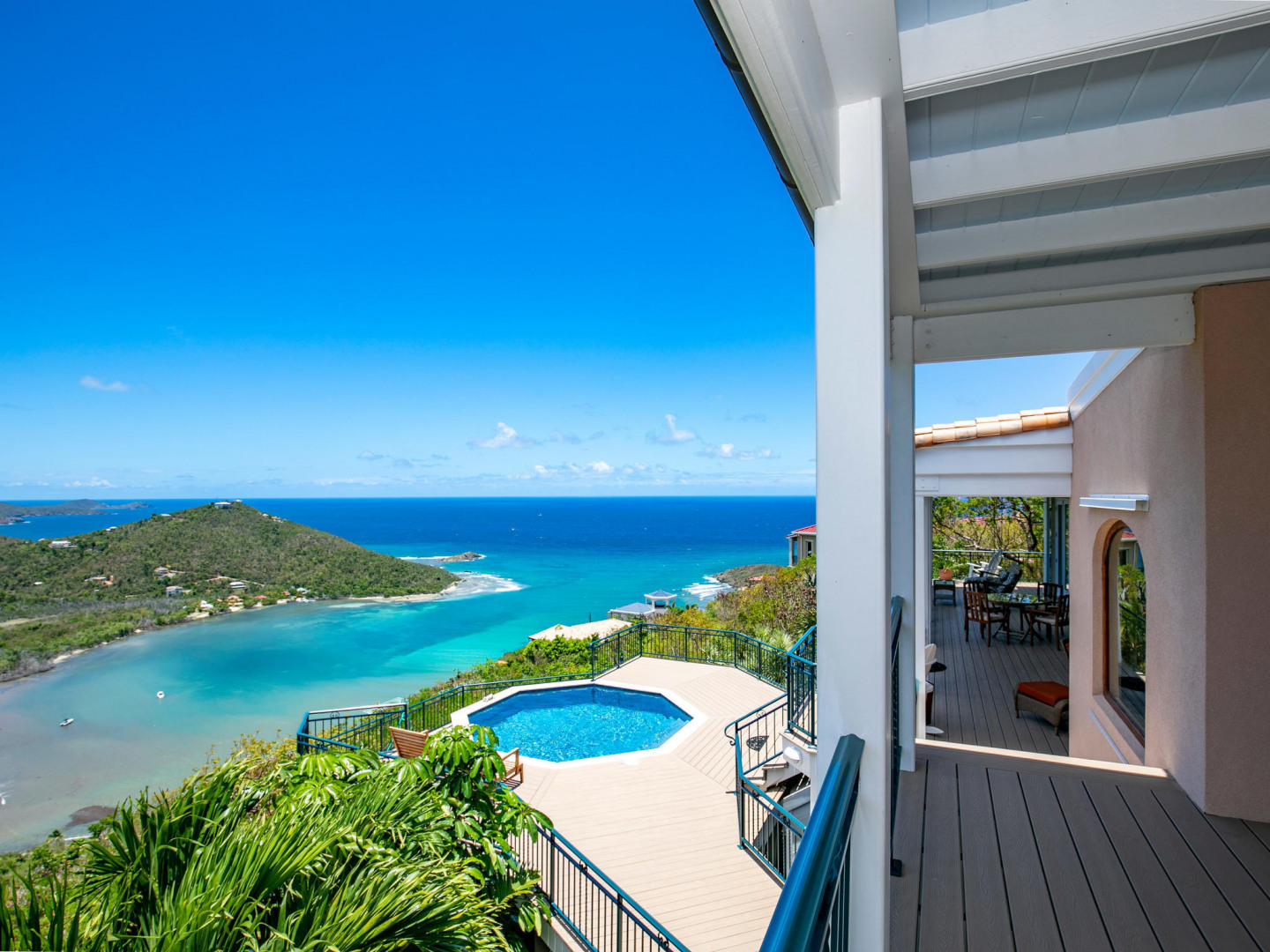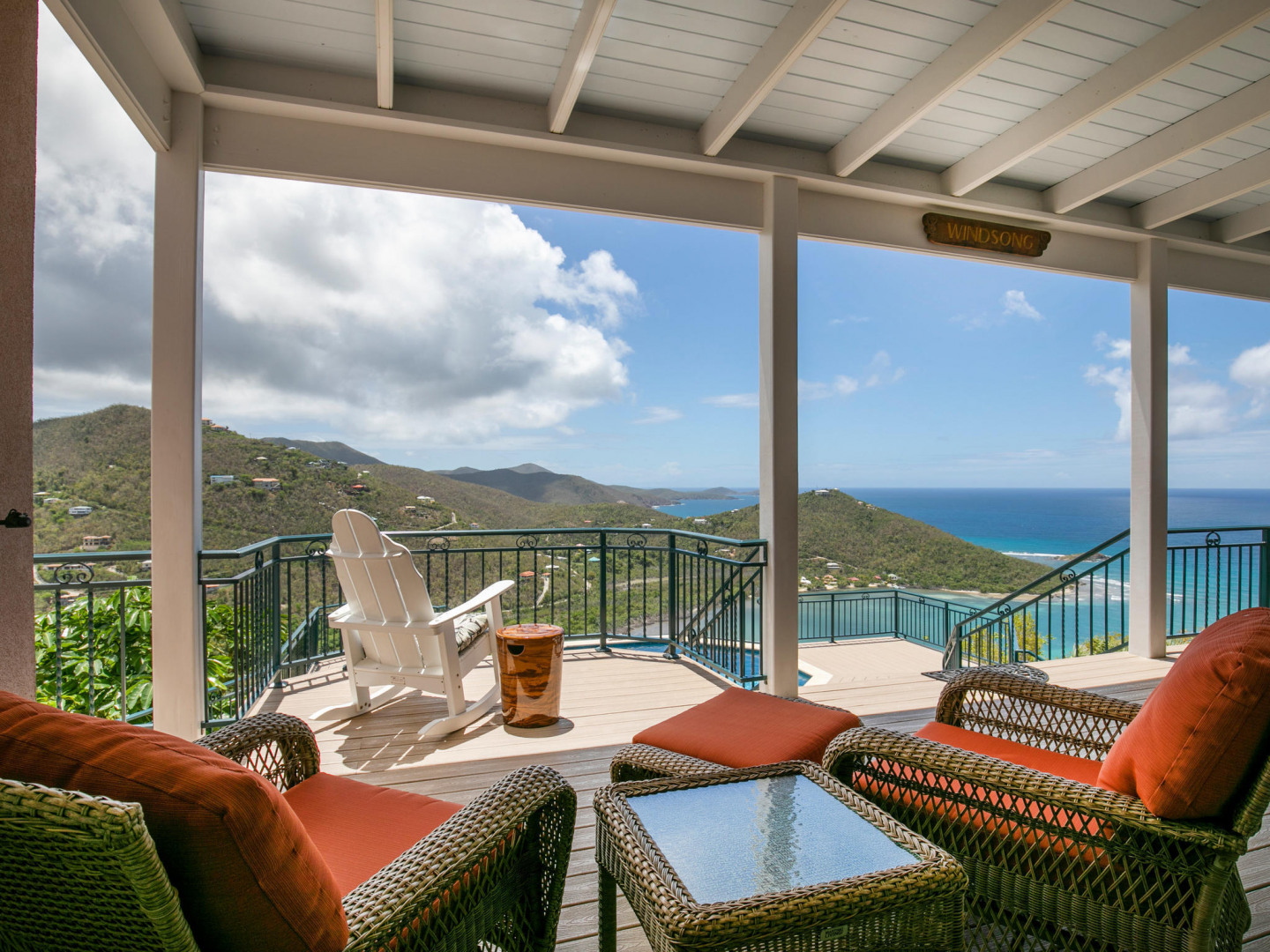 This beautifully-designed hillside villa offers stunning views, tropical breezes and relaxation for the whole family to enjoy. Enter the open-air great room with exquisite native stonework and mahogany/glass doors which open to the covered veranda, pool and pool deck, and enjoy the dramatic vistas beyond. Recent updates include new French tile roof, spacious decks with custom railings, a new kitchen with granite countertops and stainless appliances, and fresh paint throughout. Villa Windsong - 5 bedrooms, 4.5 baths, including a comfortable apartment - has most recently served as a much-loved private home, but could easily resume its former life as a comfortable high-end vacation rental