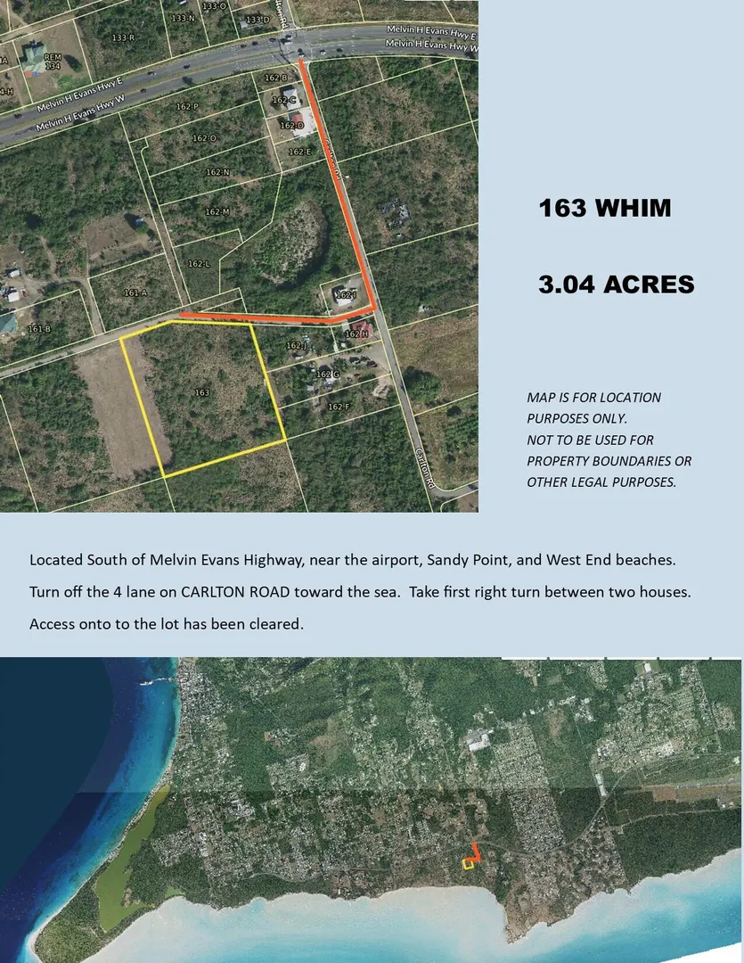 Over 3 acres of beautiful flat land with easy access to the highway. This nice lot offers great flexibility. You could easily build two homes and plant a garden and fruit trees between them. Road frontage and an access driveway have been cleared to help you appreciate the potential of this large tract. This is a great location just across the highway from Carlton Estate, only minutes from Sandy Point, beautiful West End beaches and the airport.