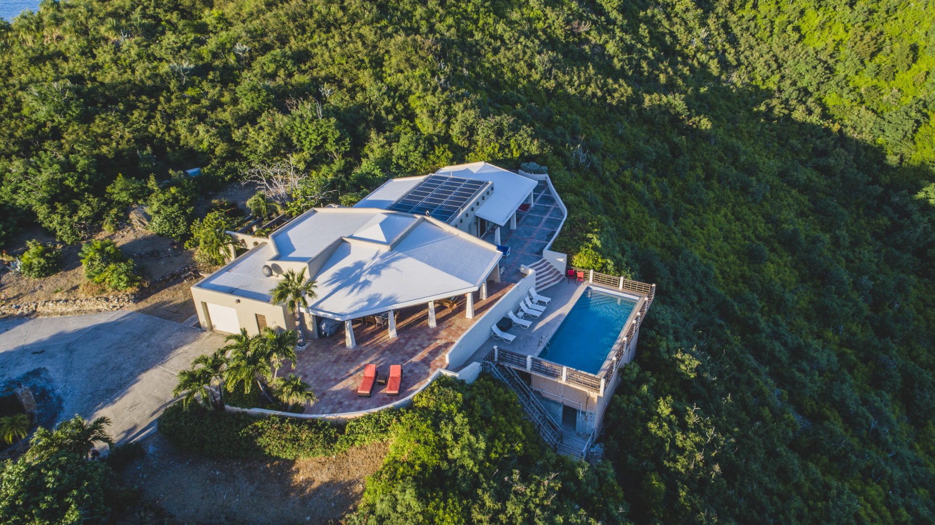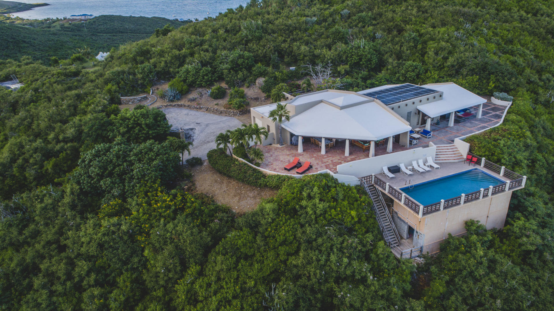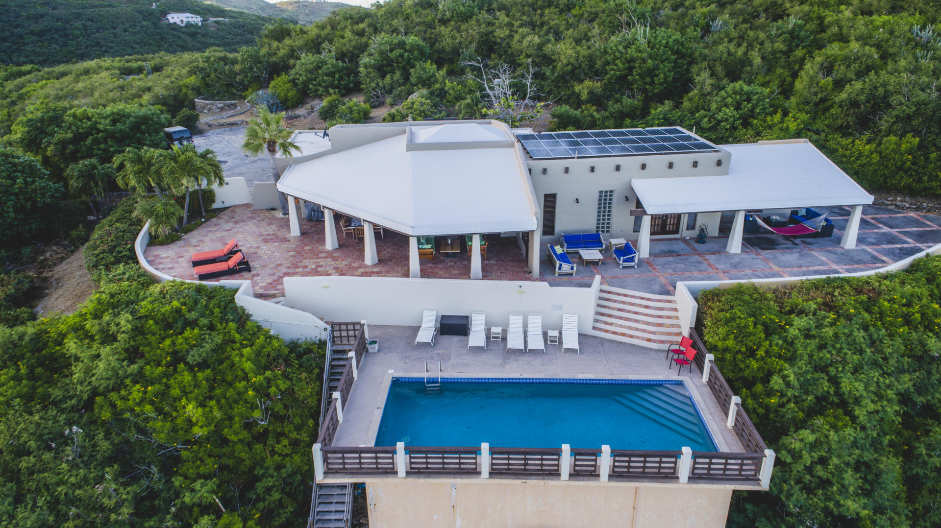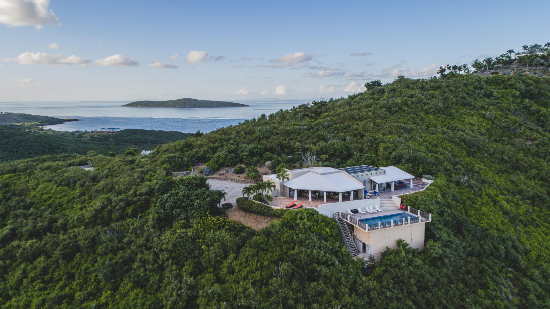 Welcome to the Crucian Hacienda! This sprawling 4/4 home on over 2 acres has a commanding view of the turquoise waters of the South shore. In addition to this stellar view, you will no doubt enjoy the privacy, amazing outdoor space, solar power, large pool, garage, and spacious living areas inside the home. The home has been a very successful vacation rental too! See docs