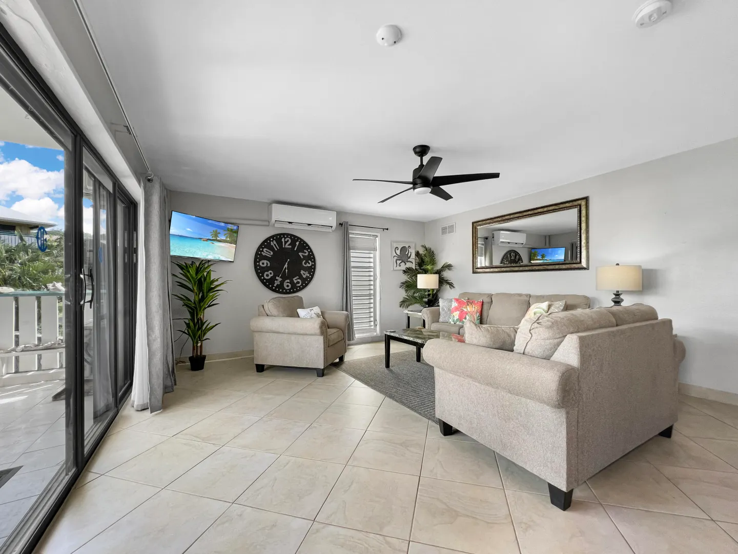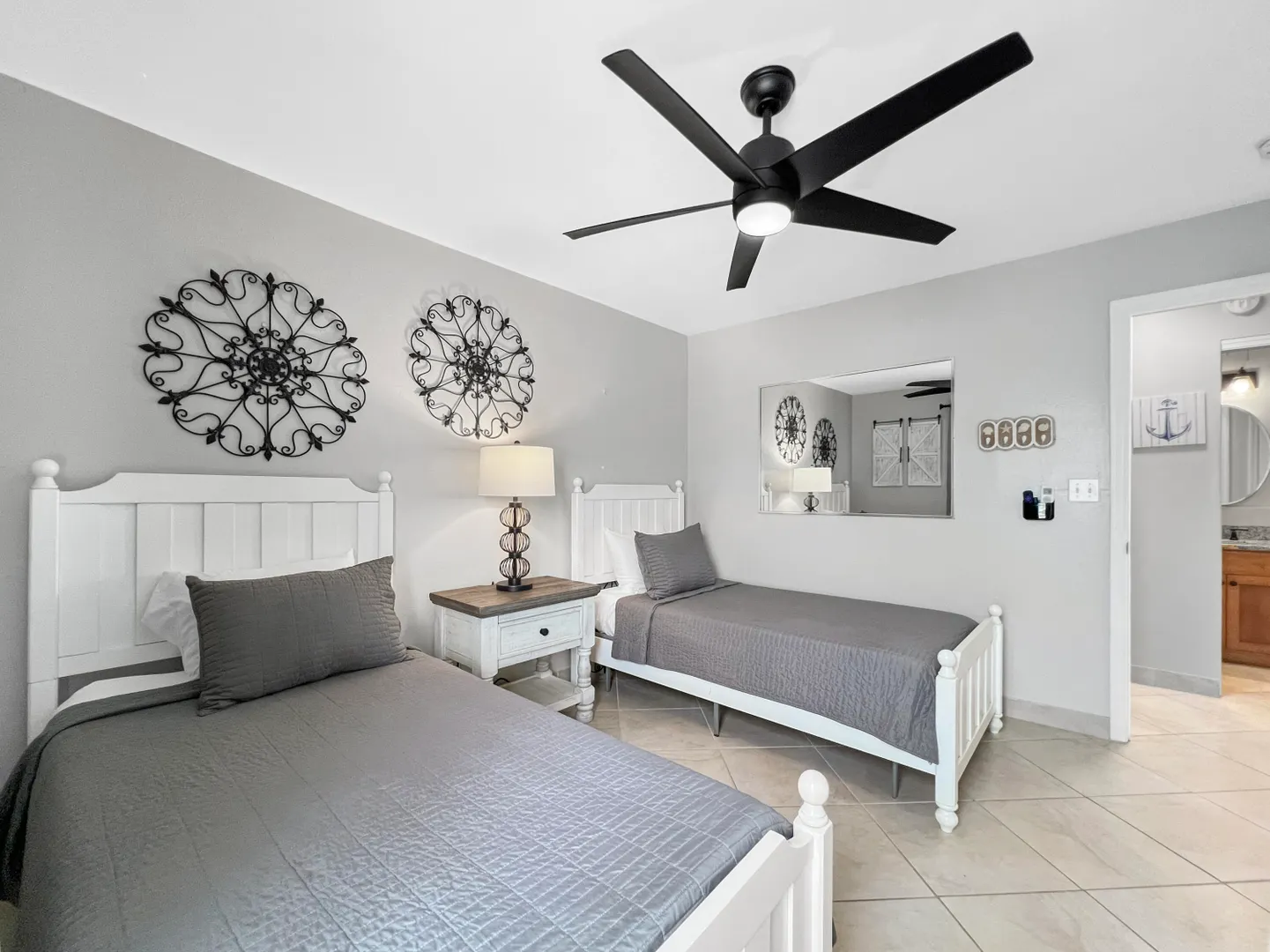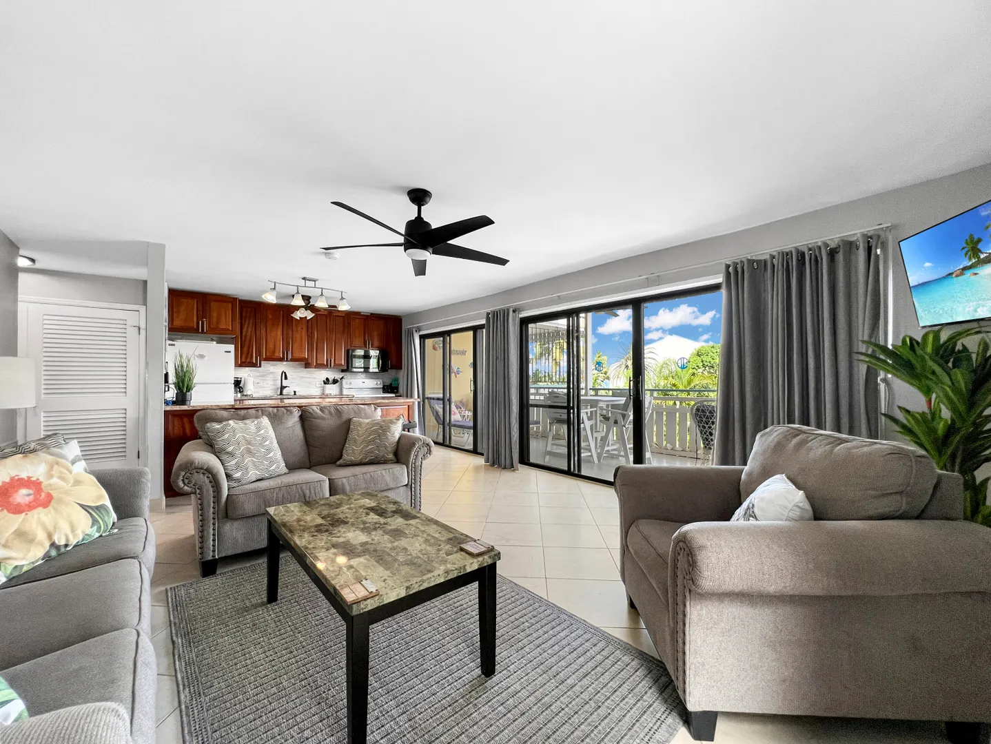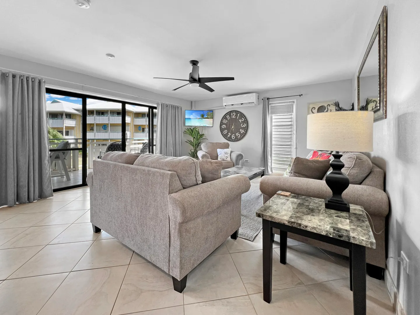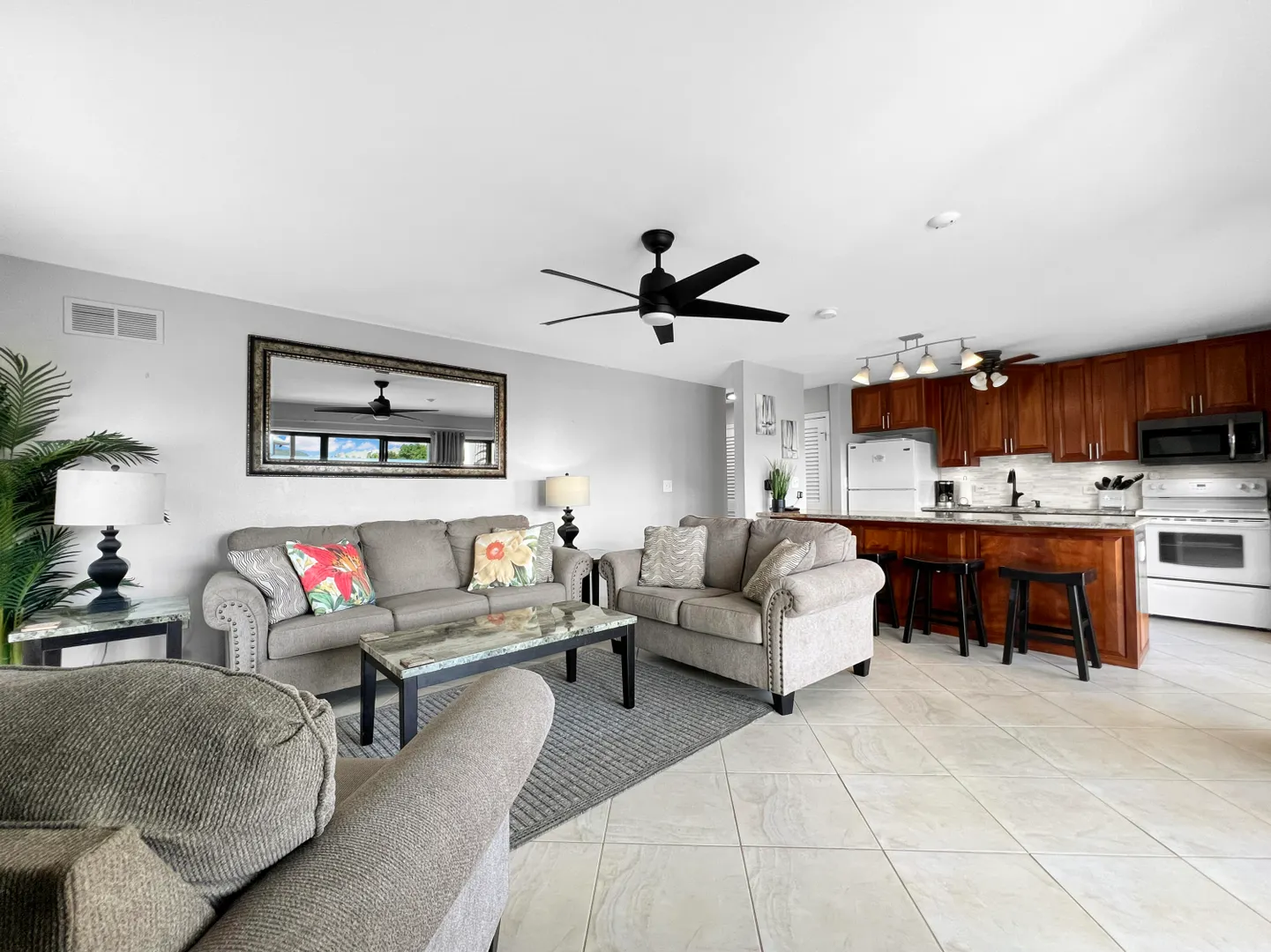 Fantastic breezes and sea views in this beautifully and tastefully remodeled 2nd floor 2 bed/2 bath condo in the beachside gated community of Colony Cove! Because it's an end unit, there are additional windows in the living room and main bedroom, plus a little more square footage than interior units! Remodeled in 2022, it features mahogany kitchen cabinets, pocket doors, Ashley furniture, new split AC units in bedrooms and living room, fresh paint, new light fixtures, ceiling fans, new faucets, some new appliances, new toilets, and new wall decorations (see list of improvements in Documents section). Colony Cove has a delightful pool, access to a sandy beach, and a lovely courtyard garden space to enjoy! This unit has been a successful vacation rental for people looking for an investment.