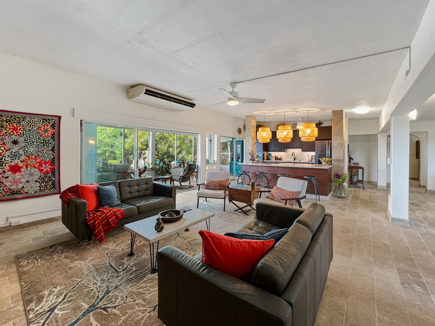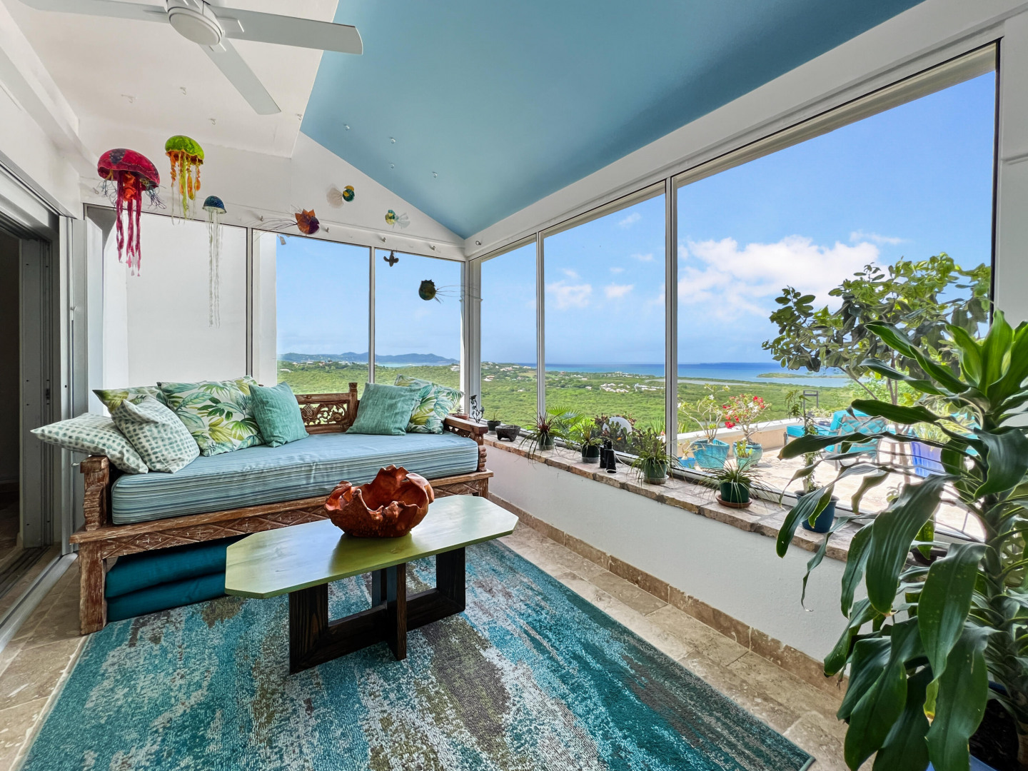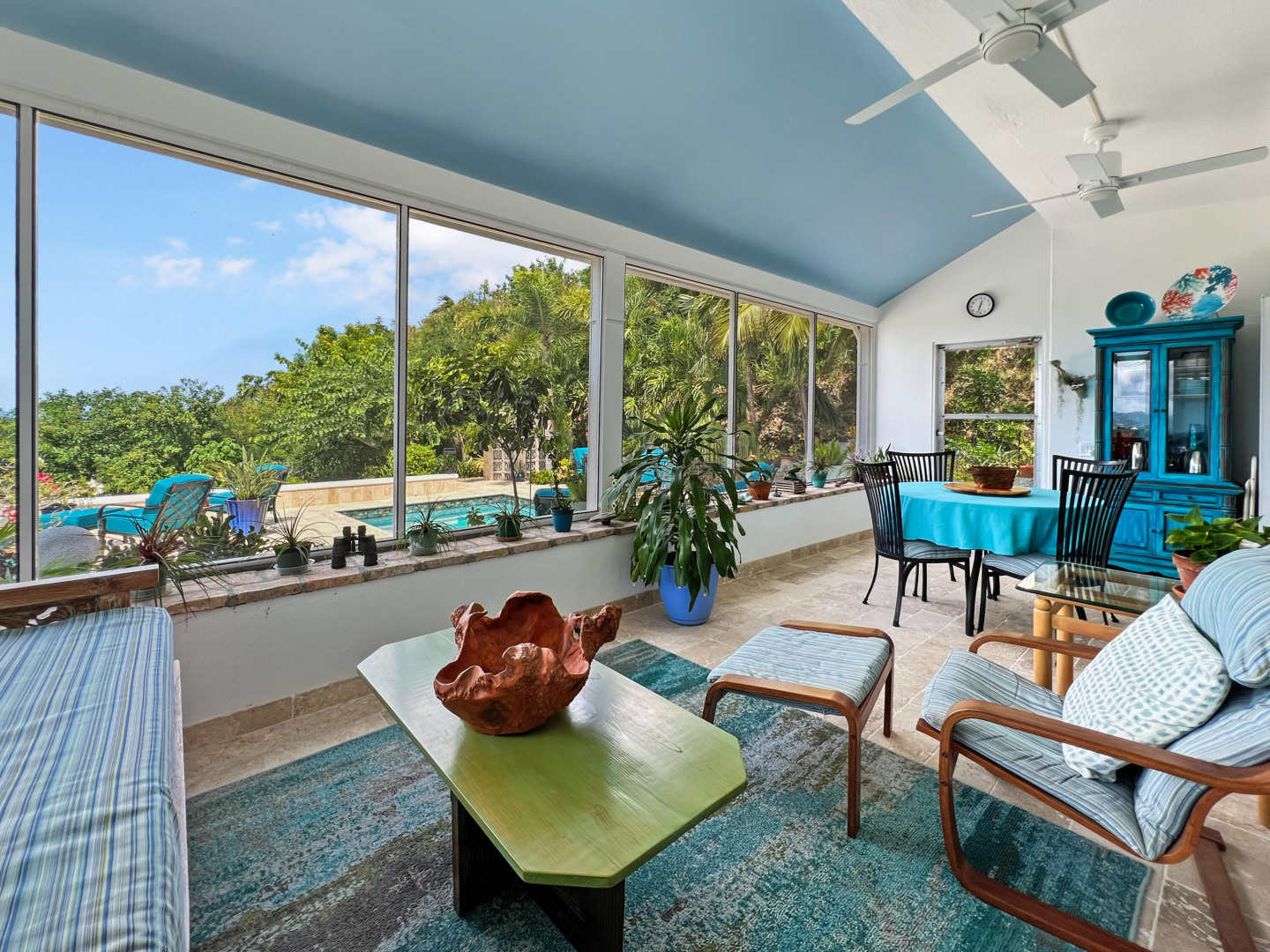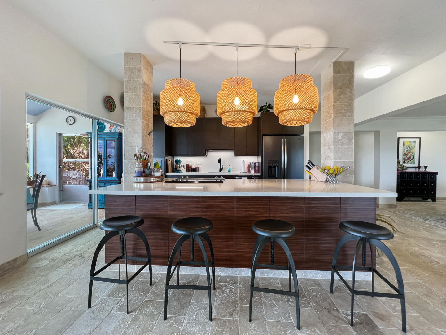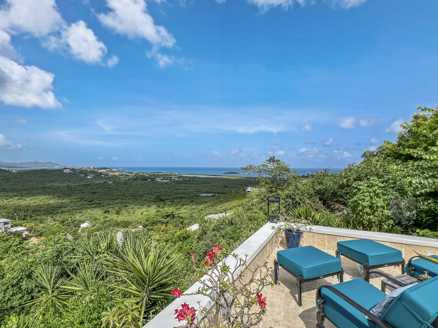 Perfectly situated to maximize the magnificent sea views and capture the tropical breezes, this 3/3 hillside home has been completely and beautifully remodeled, including the pool deck and outdoor shower! Travertine tile throughout, except laundry room. The open space concept of the large great room is perfect for entertaining, with gorgeous views from every window. Beautifully landscaped to create a tropical oasis! A chef's kitchen with stainless steel appliances, extensive storage throughout, split AC units in each room, 42 solar panels on net metering, UV filtration water system, 11.5 KW generator and automatic security gate all combine to make this home a delightful property to enjoy island living! Designed by renowned architect Sacha Thebaud. See improvements in Documents.