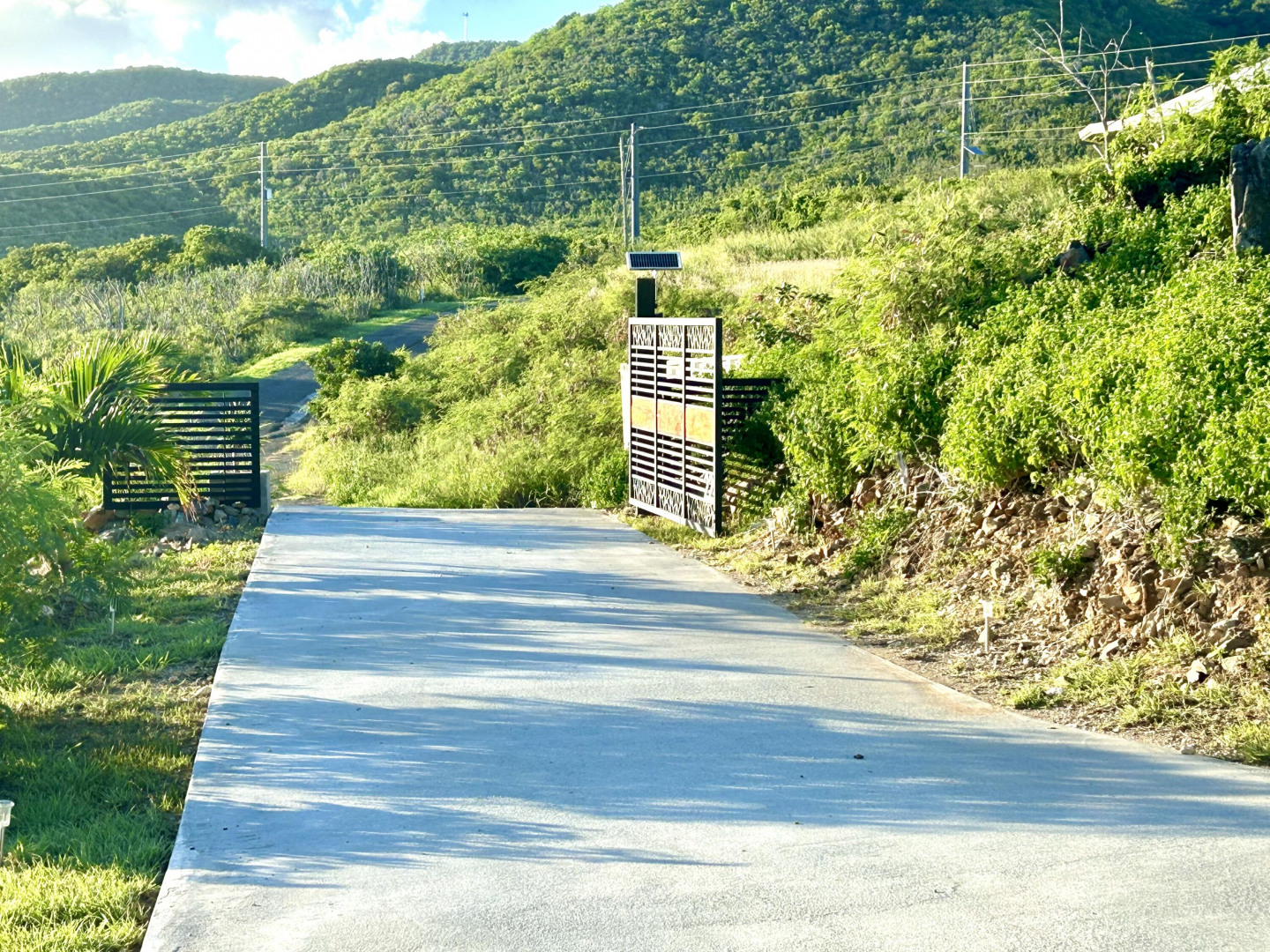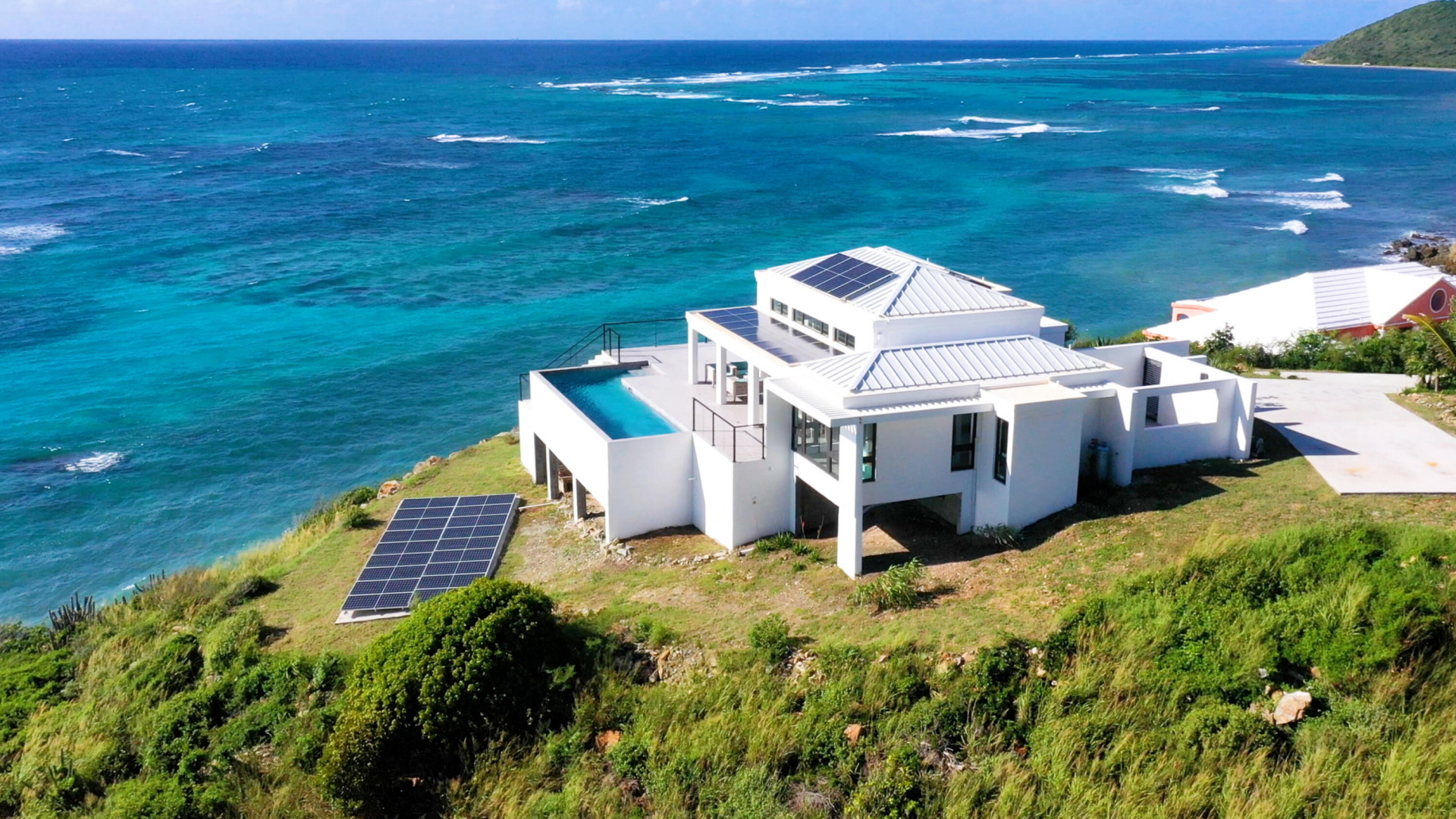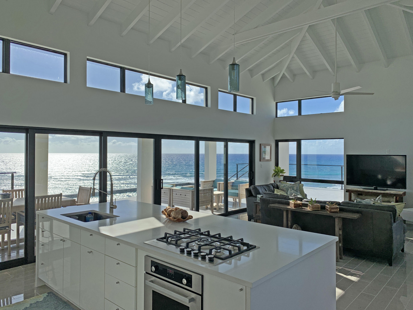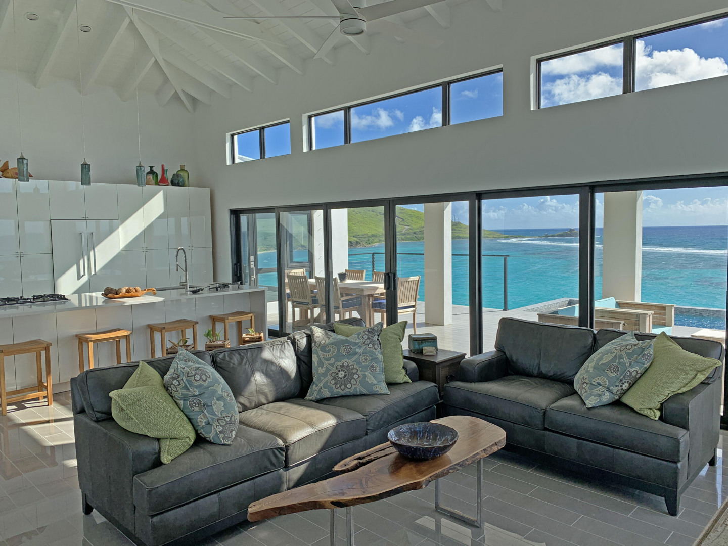 Luxury meets sustainability in this beautiful new build on St Croix's South Shore. Boasting an array of high end finishes and a thoughtful layout, this immaculate 2 bedroom 2 bath villa lays claim to unobstructed panoramic views of Rod Bay, the sparkling sapphire sea, and glorious sunsets. The gated concrete drive leads to a welcoming entrance featuring a custom walnut pivot door that reveals the breathtaking views of the location the minute you pass through. Inside you will find an open and airy living space and kitchen full of quality finishes such as Mod Cabinetry, Krause stainless sink and faucet, Fisher Paykel appliances, and a quartz covered waterfall island. The indoor living area blends seamlessly with the alluring outdoor veranda that gives center stage to