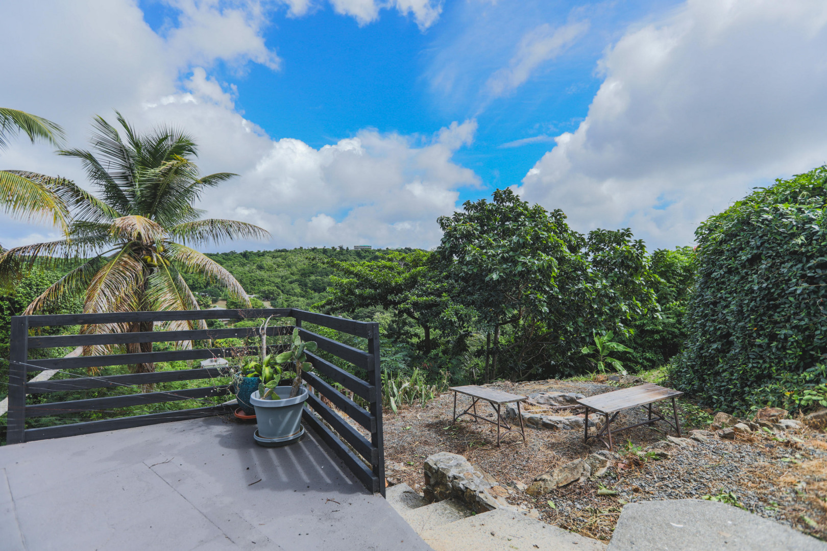 Beautiful, hillside property with spectacular valley and South shore views. This solid concrete home offers a spacious one bedroom upstairs (was 2 bedrooms, but current owners knocked down the wall to make one large bedroom). The updated kitchen opens up to a newly tiled living and dining room with expansive sea and valley views.The wrap around concrete patio provides many options to relax outdoors in privacy. The one bedroom, one bath lower level includes a second kitchen as well as a separate entrance, so it can be used as either a rental or an in-law suite.An energy saving solar system with net metering keeps your power bills low, and back up generator (6 KW) gives you peace of mind. The property is nearly an acre of lush landscape with a plethora of fruit trees. An island dream.