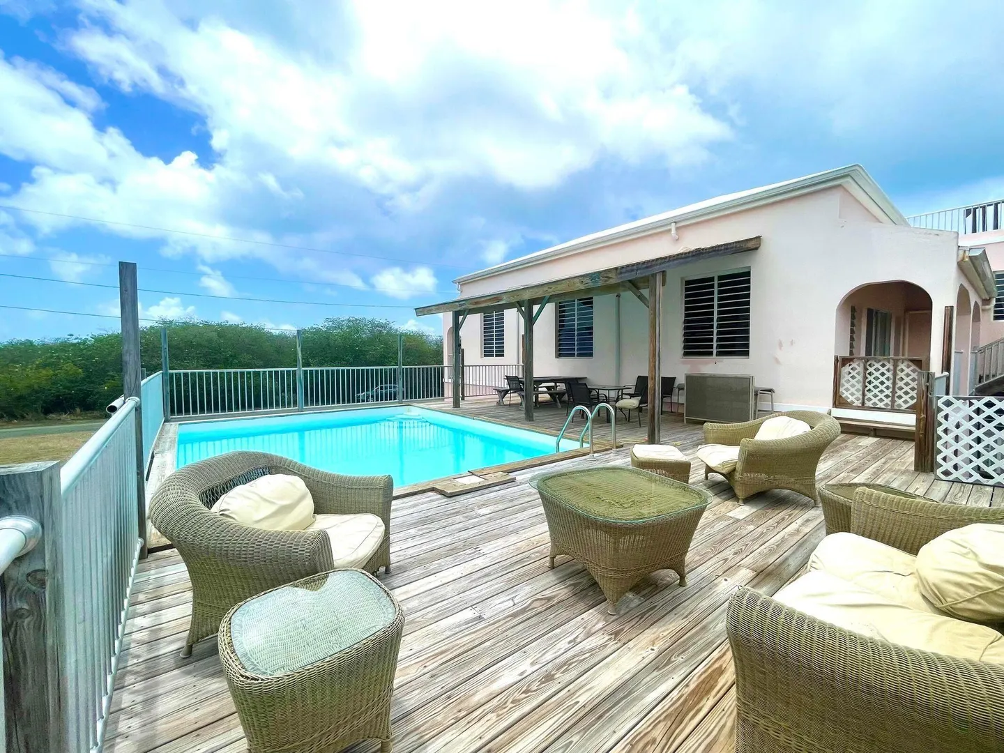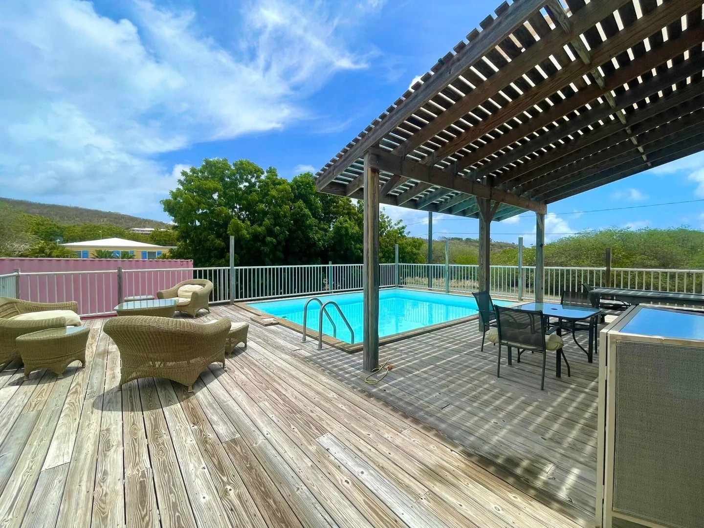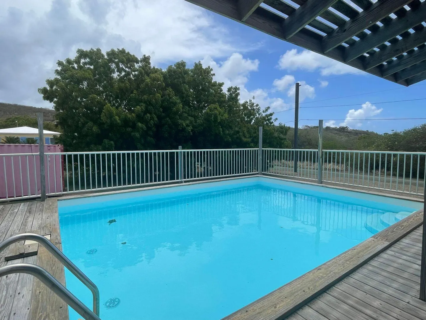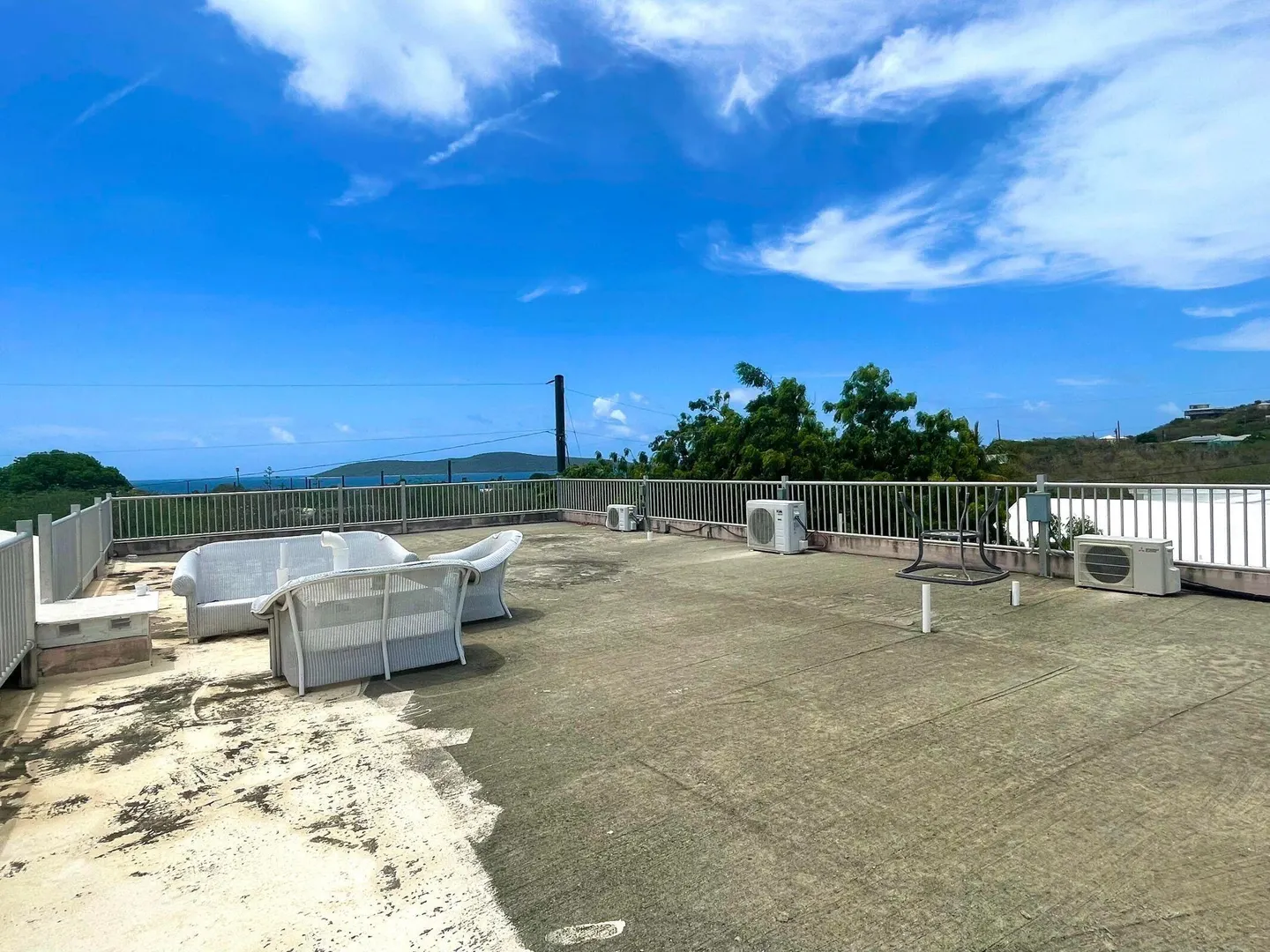Spacious three bedroom three bath unit on upper level of duplex features a large bright bonus space perfect for use as a den or game room. The home features a roomy deck and refreshing swimming pool, and has a bonus rooftop terrace where you can take in the Buck Island view. Beautiful finishes throughout the home, fans and split AC units in every room. Tenant responsible for electric, internet and cable. Landlord provides landscaping and pest control.