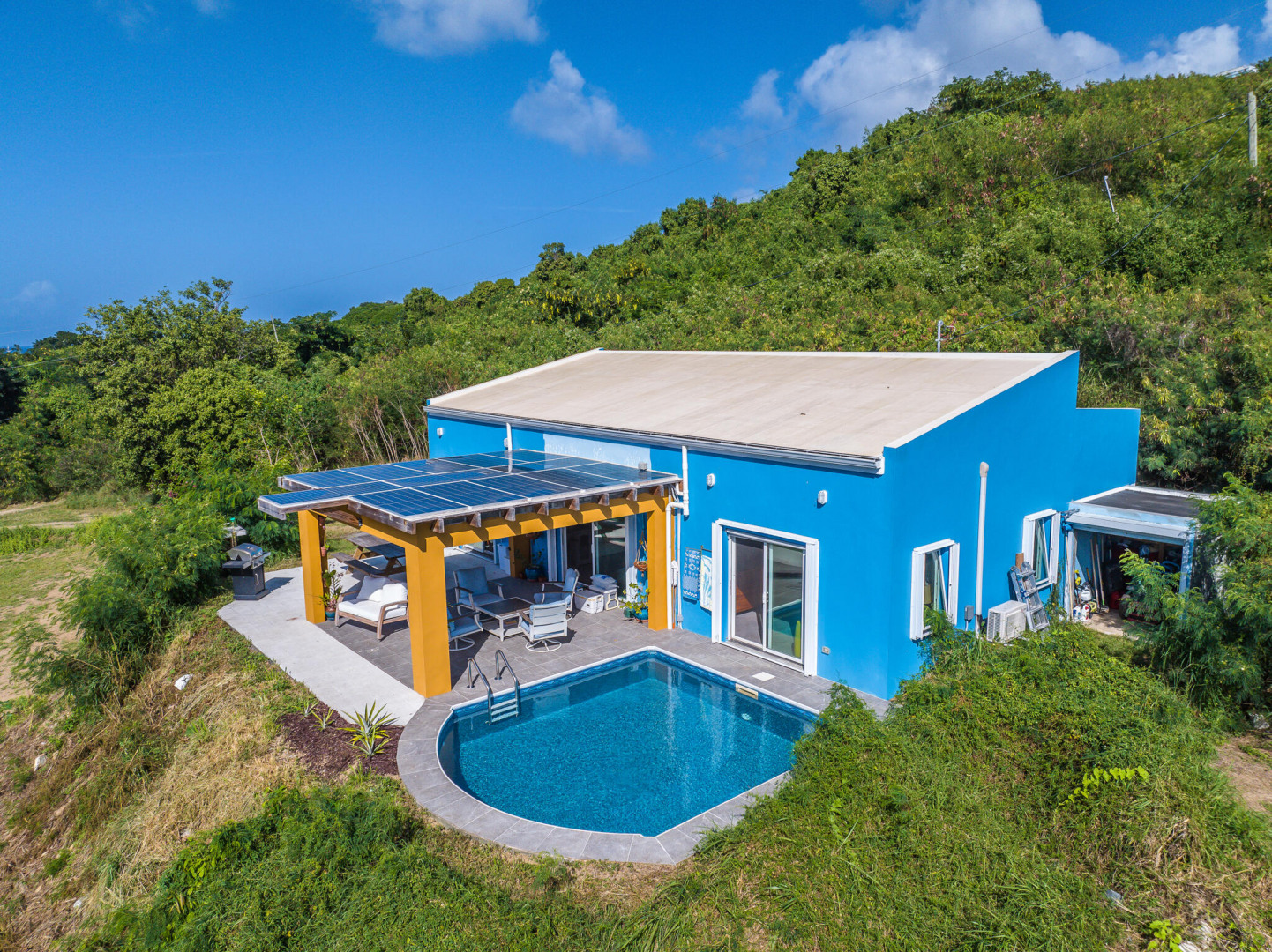 Gorgeous newly constructed 2-bedroom, 2-bathroom solar powered home on 2.45 acres in the picturesque west end of St. Croix, where modern design meets eco-conscious living. Situated near Butler Bay, this property offers breathtaking views, innovative features, and a seamless blend of luxury and sustainability, making it the perfect retreat, amazing investment or primary residence. Every detail of this home has been designed with comfort and style in mind. The open-concept layout creates a bright and inviting atmosphere of natural light with expansive windows framing stunning views of the Caribbean Sea and lush tropical surroundings. The living area flows effortlessly into the kitchen and dining space, perfect for relaxing after a day of island exploration.This home is a showcase of sustainable living, featuring a solar-powered fresh-water pool with an oxygen pump system. The pool is strategically positioned to offer uninterrupted views of the Carribbean Sea, providing the perfect backdrop for a morning swim or evening relaxation under the stars. The patio is a great space for entertaining, grilling and complete outdoor living.