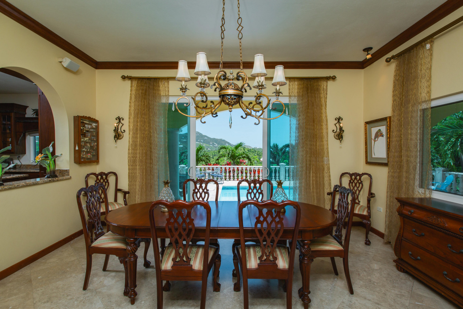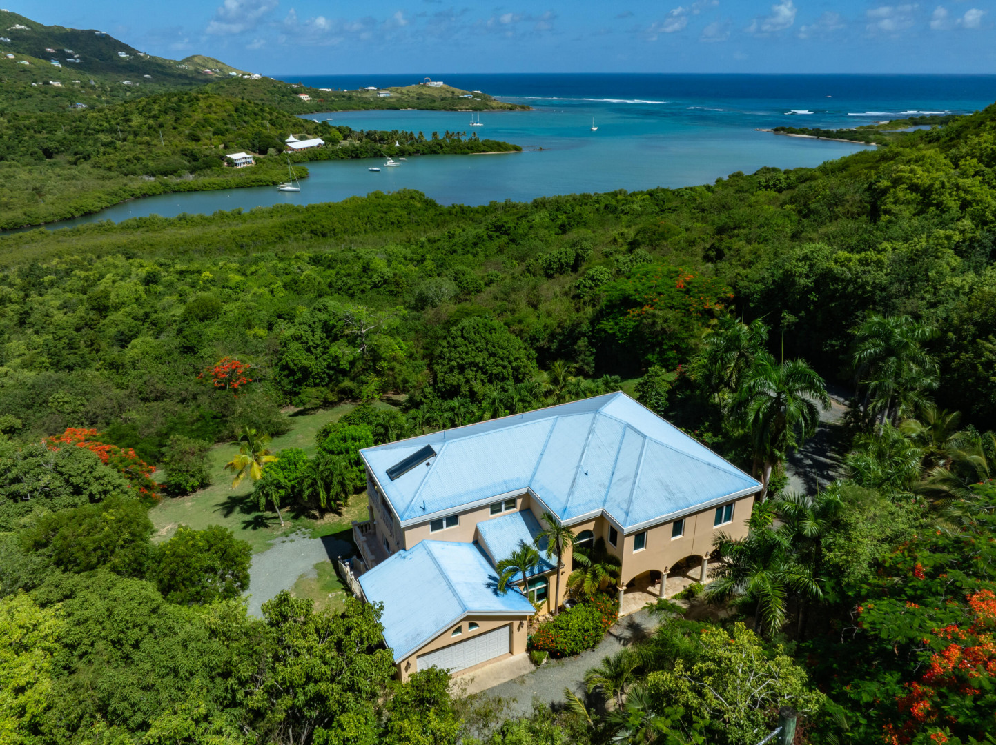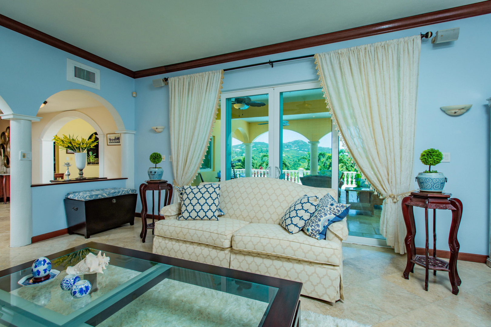 Tucked in the secluded northwest corner of Judith's Fancy overlooking Salt River Bay, sits this meticulously designed and maintained, furnished 3 bed, 3 bath (and 2 half baths) Caribbean Villa with one bed, one bath apartment and a climate controlled two-car garage. Set on just over an acre and filled with palm and fruit trees. This residence is thoughtfully planned and executed with no detail left to chance. Traditional in size and layout, the home has a formal dining room and sitting room, foyer, Media Room & office (both could become bedrooms), laundry room, 2 upstairs patios; a 2,200 sq ft pool deck, crown moulding throughout and ample storage. It is an entertaining home complete with a chef's kitchen, granite countertops, state-of-the-art sound system piped throughout the home.There is only one other home in this secluded part of the gated Judith's Fancy community, making the home private, and the sounds of birds chirping your only distraction. As you drive onto the property you are greeted by Royal Palms flanking the driveway. Caribbean style planters' chairs sit on the patio. Dramatic arches as you enter the foyer and formal sitting room, the gorgeously decorated Blue Room. The furnishings are so beautiful you may be distracted from the sea views outside the impact resistant sliders that open onto a bright and comfy seating area above the pool, kept cool by 4 ceiling fans. The formal dining room has seating for 8 and easy access to the kitchen through a pass-through arch. A gorgeous glass sideboard and antique dresser house all your table linens and serving pieces. Your dinner guests seated on the east side of the table, will see the twinkling lights of Salt River and Clairmont while they dine.