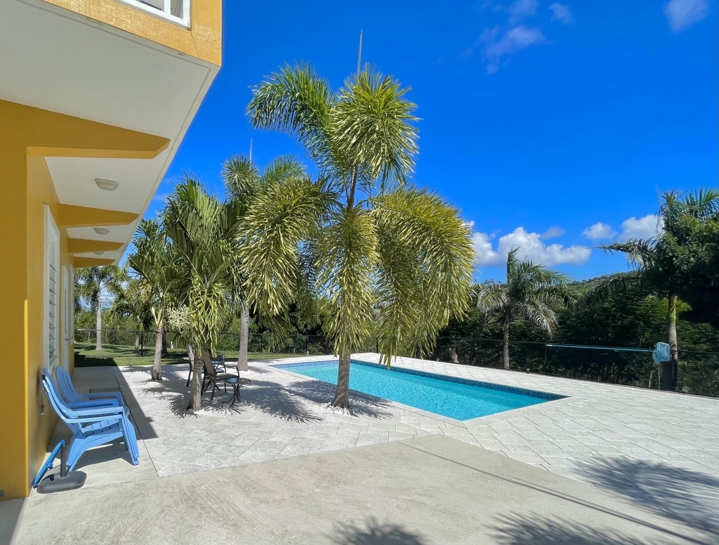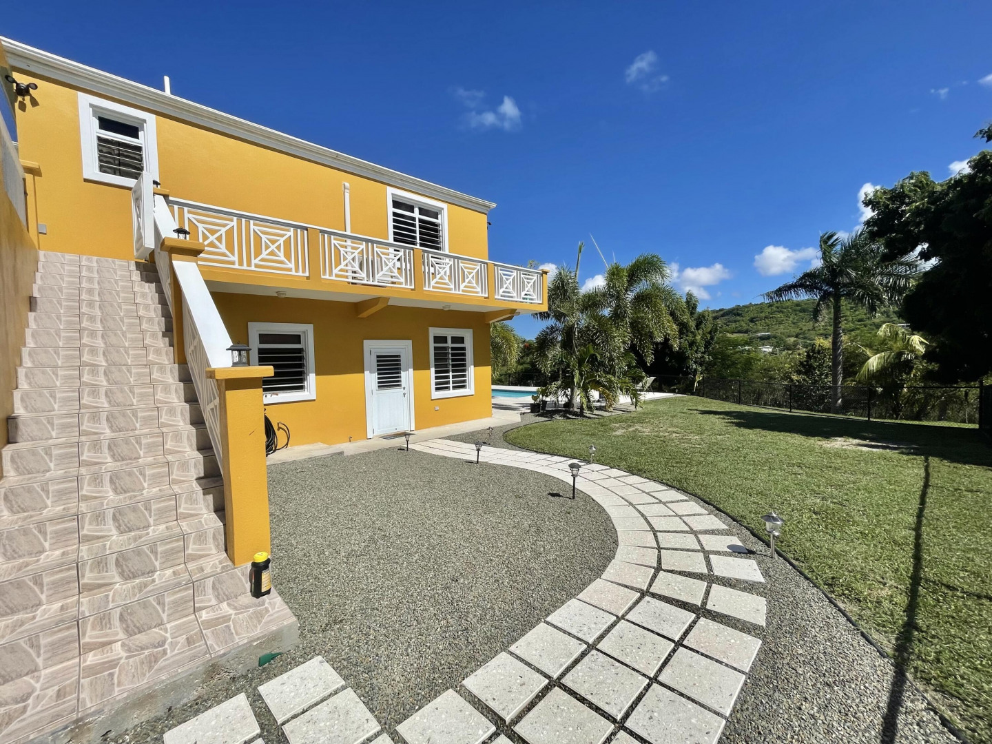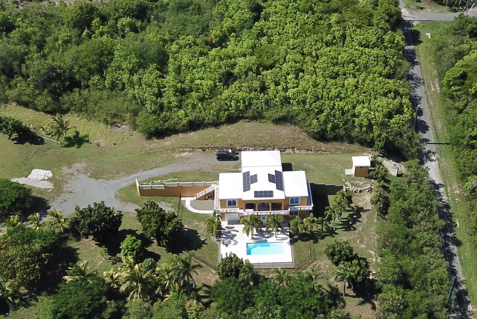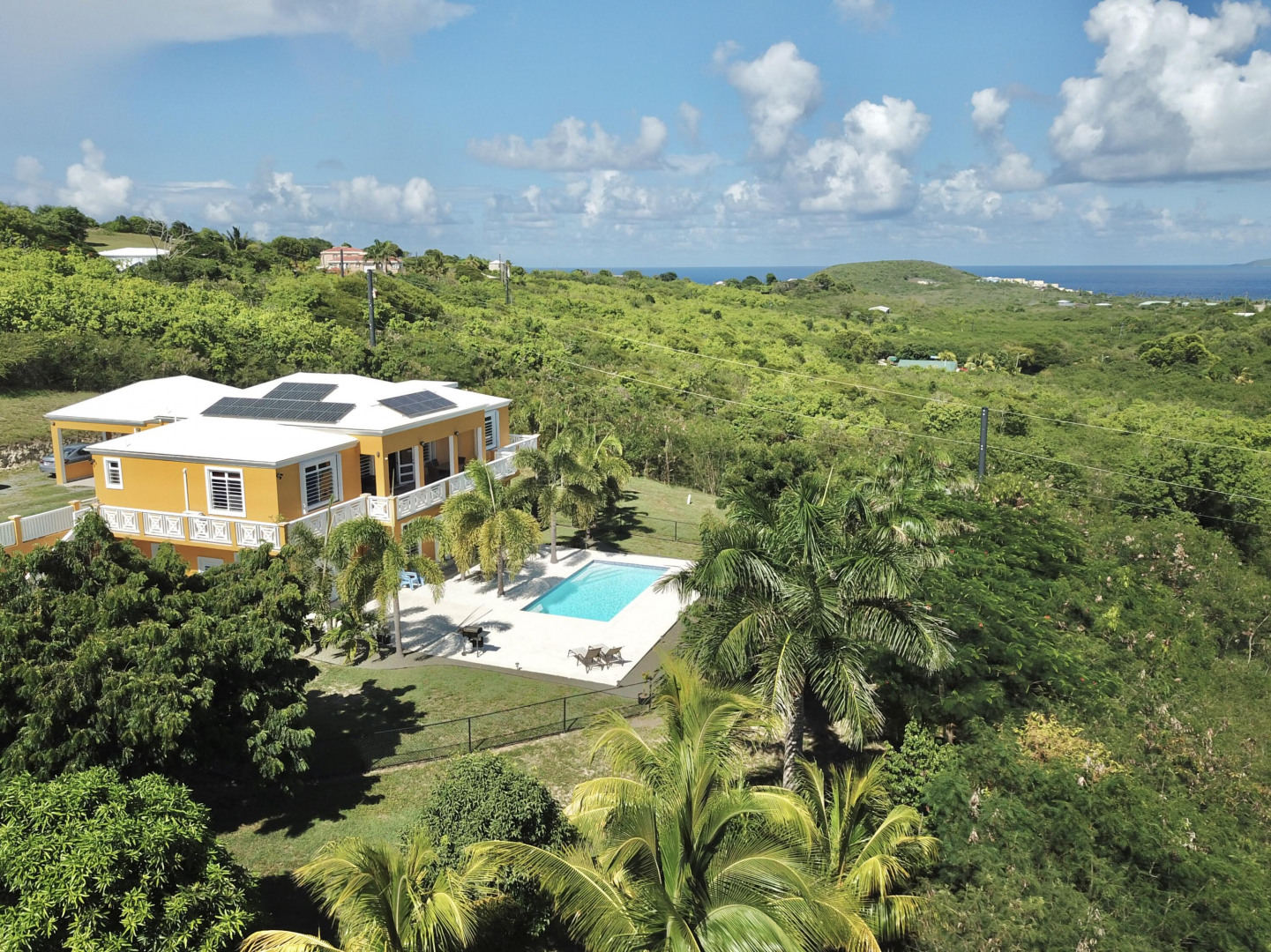 TURN-KEY PROPERTY! Nestled along a quiet hillside, this meticulously maintained home has a lot of great features! The upstairs consists of a spacious open floor plan with vaulted ceilings, two bedrooms and two bathrooms. Open the double doors to a wraparound balcony where you can sip your morning coffee with a view of Buck Island. Downstairs is a spacious studio as well as a large space that is set up as a media/entertaining space and opens up to the pool. You may be able to add a staircase for easy accessibility to the upper level. The house is situated on over an acre of land and the area surrounding the house and pool is beautifully landscaped.Features include: 7.8 KW solar system with batteries, UV filtration system, 22K propane generator, hurricane shutters.