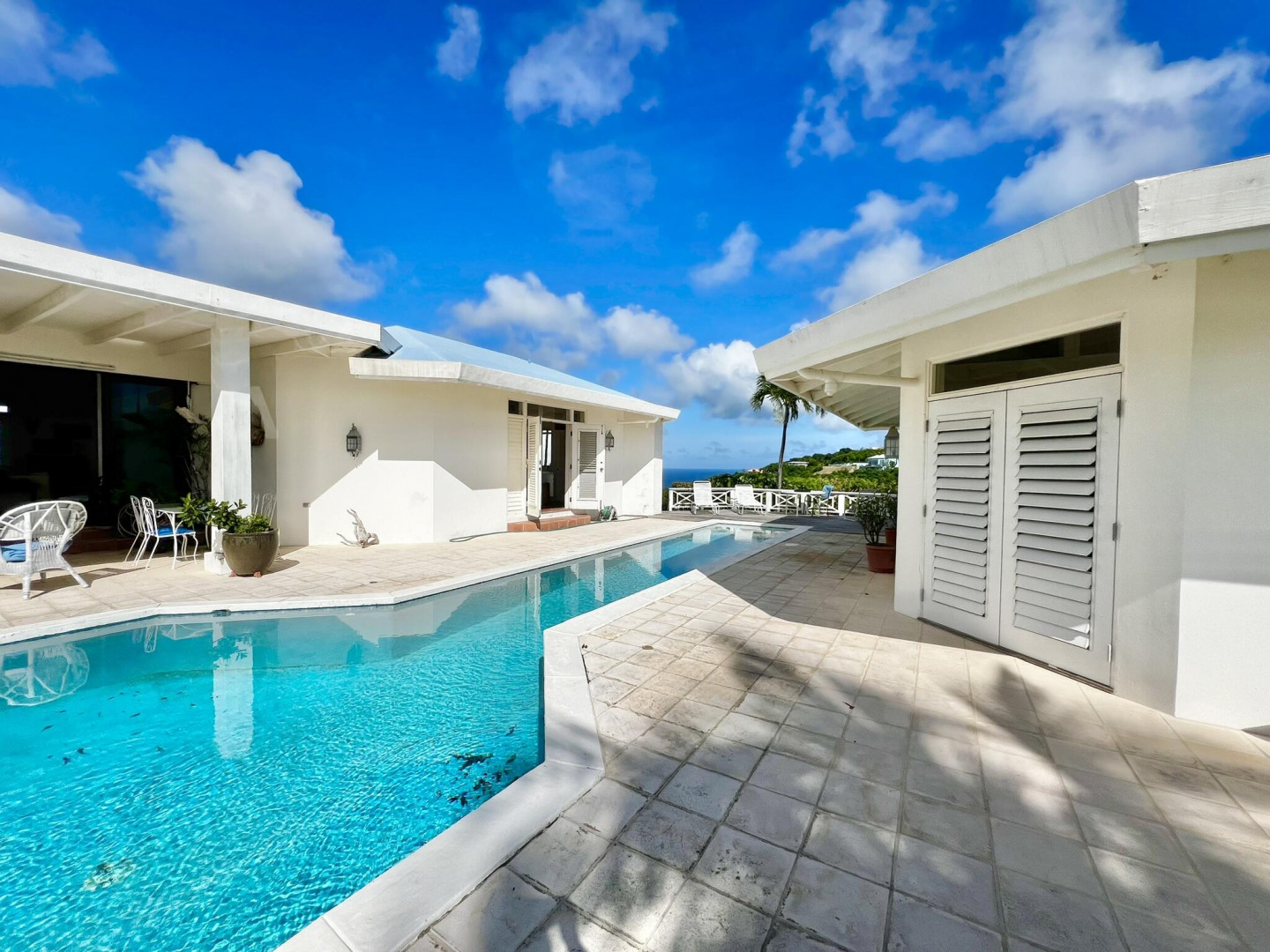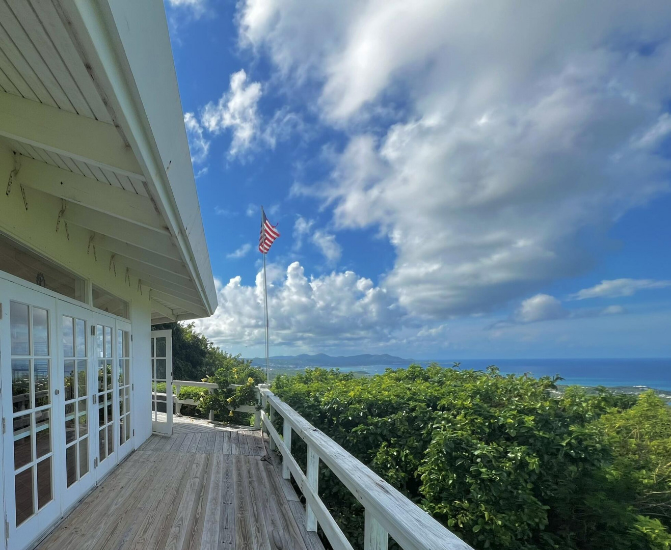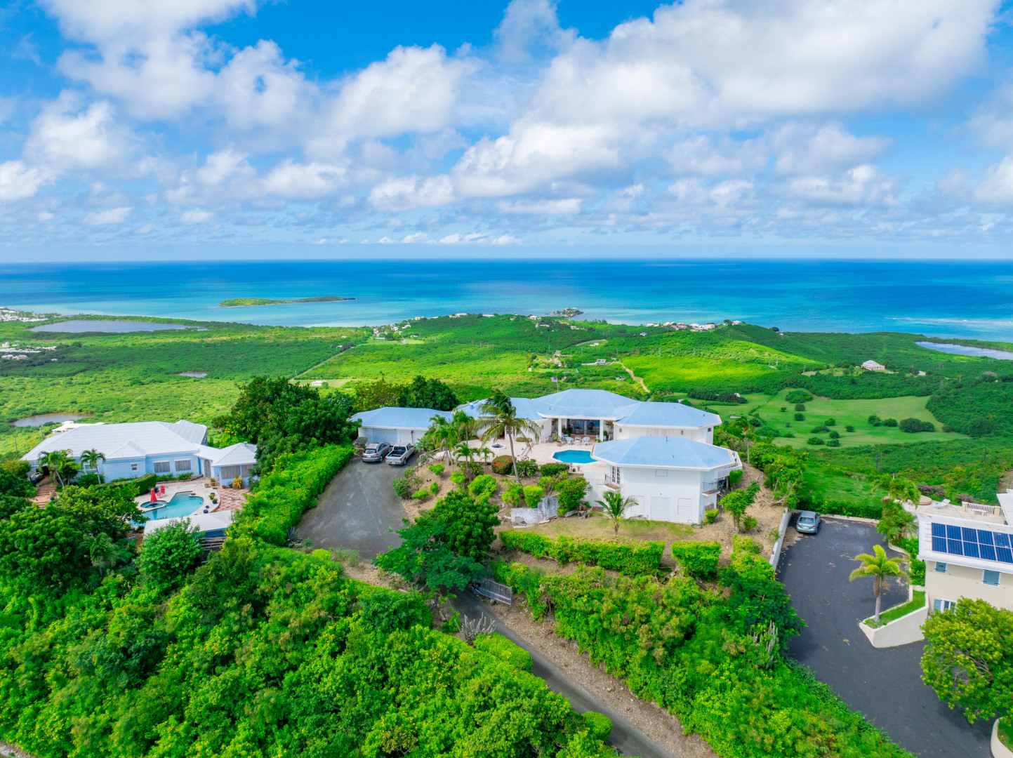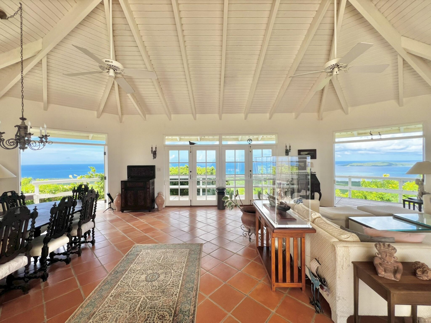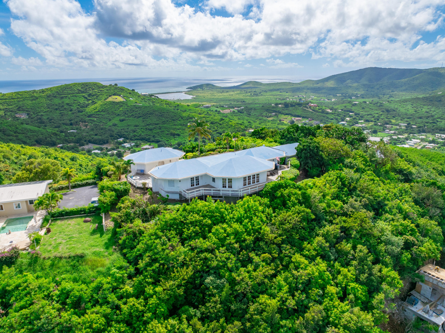 This incredible four-bedroom estate sits on the highest hill in Seven Hills, offering almost 360-degree views of the Caribbean Sea. From the iconic Buck Island to the Southshore and westward to Judith's Fancy and downtown Christiansted, every vantage point captures stunning natural beauty, including breathtaking sunsets. Custom-designed to maximize these vistas, the home features a unique layout with a central pool taking center stage, surrounded by uninterrupted views and an expansive pool deck. The estate is thoughtfully designed with two distinct living pods flanking the pool. The main pod is a bright and spacious retreat, highlighted by an open great room that blends the dining and large seating area.Wrapped in doors with 1/4-inch glass on the seaside & custom sliding impact glass doors on the poolside that pocket out of view, the space offers seamless indoor-outdoor living. The great room flows effortlessly to a covered gallery on the pool side and a large gallery that spans the entire northern sea facing side with some of the most breathtaking views on the island. Connected to the great room is a spacious kitchen featuring a cozy seating area with a fireplace, perfect for gathering and half bath. The main pod also includes the primary suite that is angled perfectly towards Buck Island so you wake to that stunning island view. Wake in the morning to the gorgeous view and roll out of your bed to do some laps in your pool before a day of island adventures. There is also a garage that is detached from the main pod, that currently only has one opening but was built to be a two-car garage with plenty of storage space, a workshop and the laundry room. The breezes are continuously blowing through the home for comfort and minimizing your power bill.