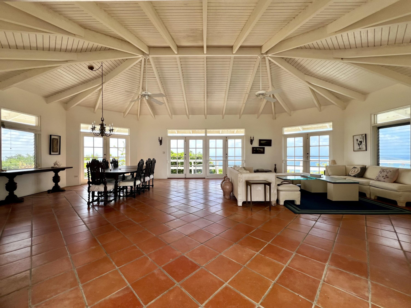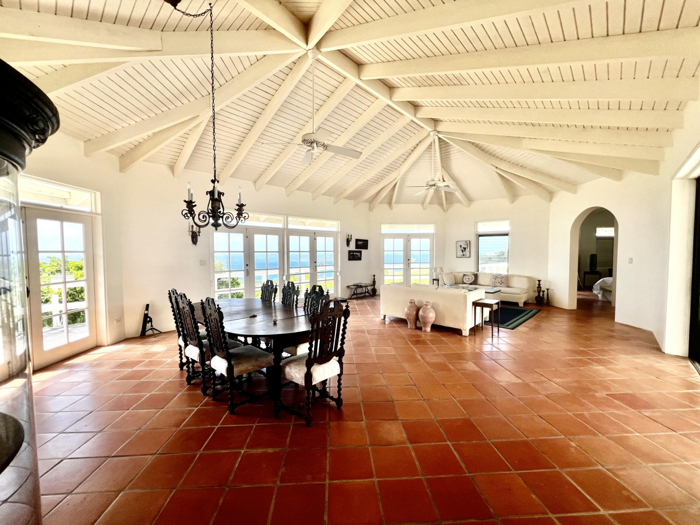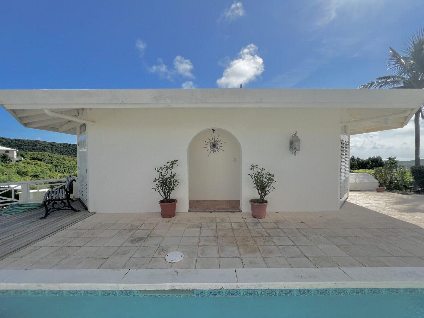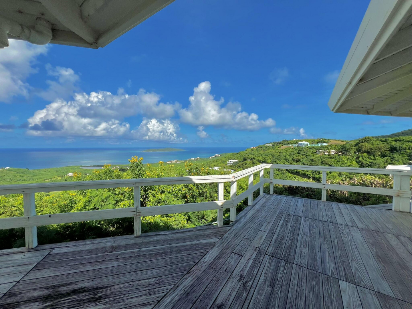 This incredible four-bedroom estate sits on the highest hill in Seven Hills, offering almost 360-degree views of the Caribbean Sea. From the iconic Buck Island to the Southshore and westward to Judith's Fancy and downtown Christiansted, every vantage point captures stunning natural beauty, including breathtaking sunsets. Custom-designed to maximize these vistas, the home features a unique layout with a central pool taking center stage, surrounded by uninterrupted views and an expansive pool deck. The estate is thoughtfully designed with two distinct living pods flanking the pool. The main pod is a bright and spacious retreat, highlighted by an open great room that blends the dining and large seating area.Wrapped in doors with 1/4-inch glass on the seaside & custom sliding impact glass doors on the poolside that pocket out of view, the space offers seamless indoor-outdoor living. The great room flows effortlessly to a covered gallery on the pool side and a large gallery that spans the entire northern sea facing side with some of the most breathtaking views on the island. Connected to the great room is a spacious kitchen featuring a cozy seating area with a fireplace, perfect for gathering and half bath. The main pod also includes the primary suite that is angled perfectly towards Buck Island so you wake to that stunning island view. Wake in the morning to the gorgeous view and roll out of your bed to do some laps in your pool before a day of island adventures. There is also a garage that is detached from the main pod, that currently only has one opening but was built to be a two-car garage with plenty of storage space, a workshop and the laundry room. The breezes are continuously blowing through the home for comfort and minimizing your power bill.