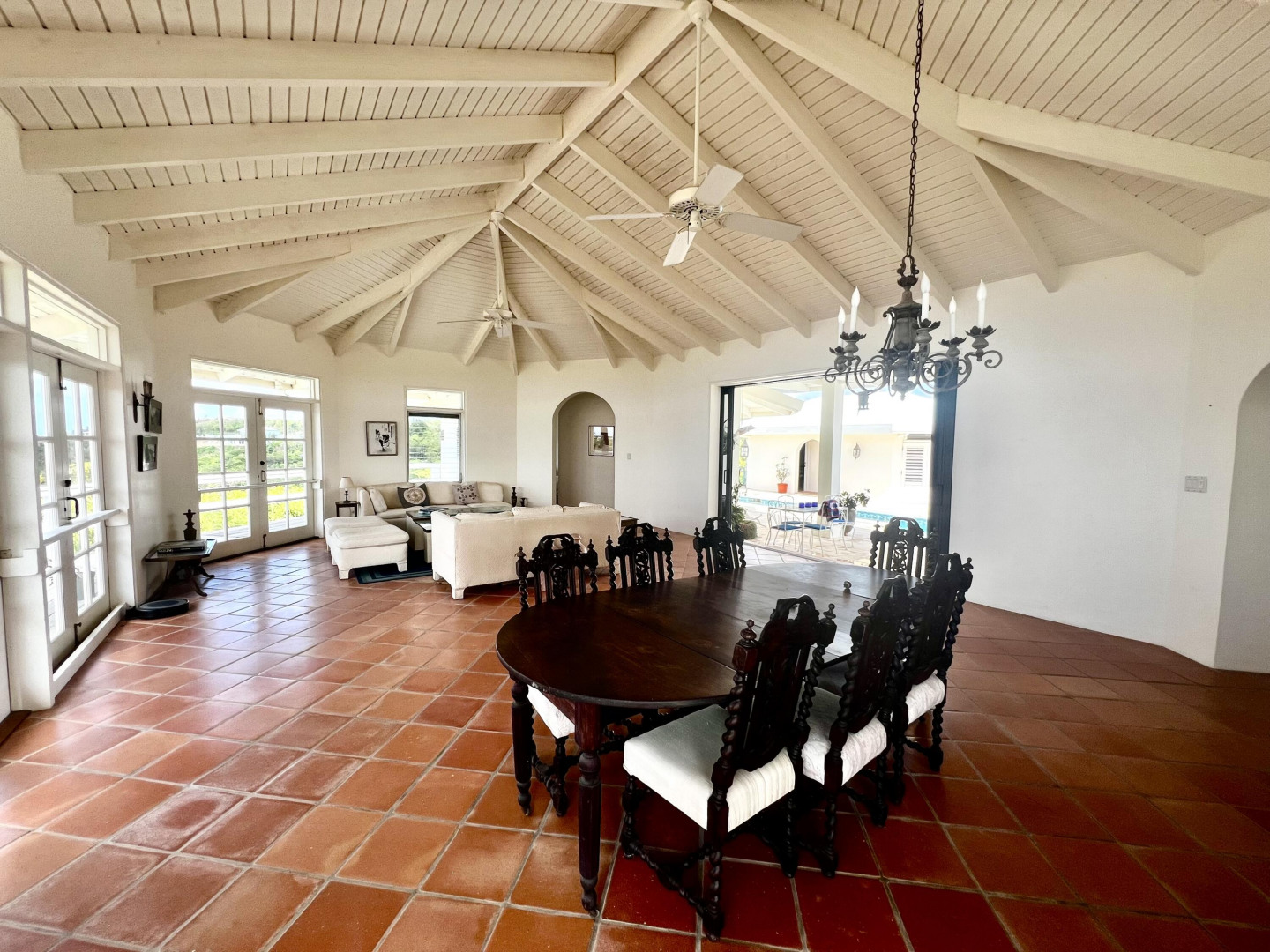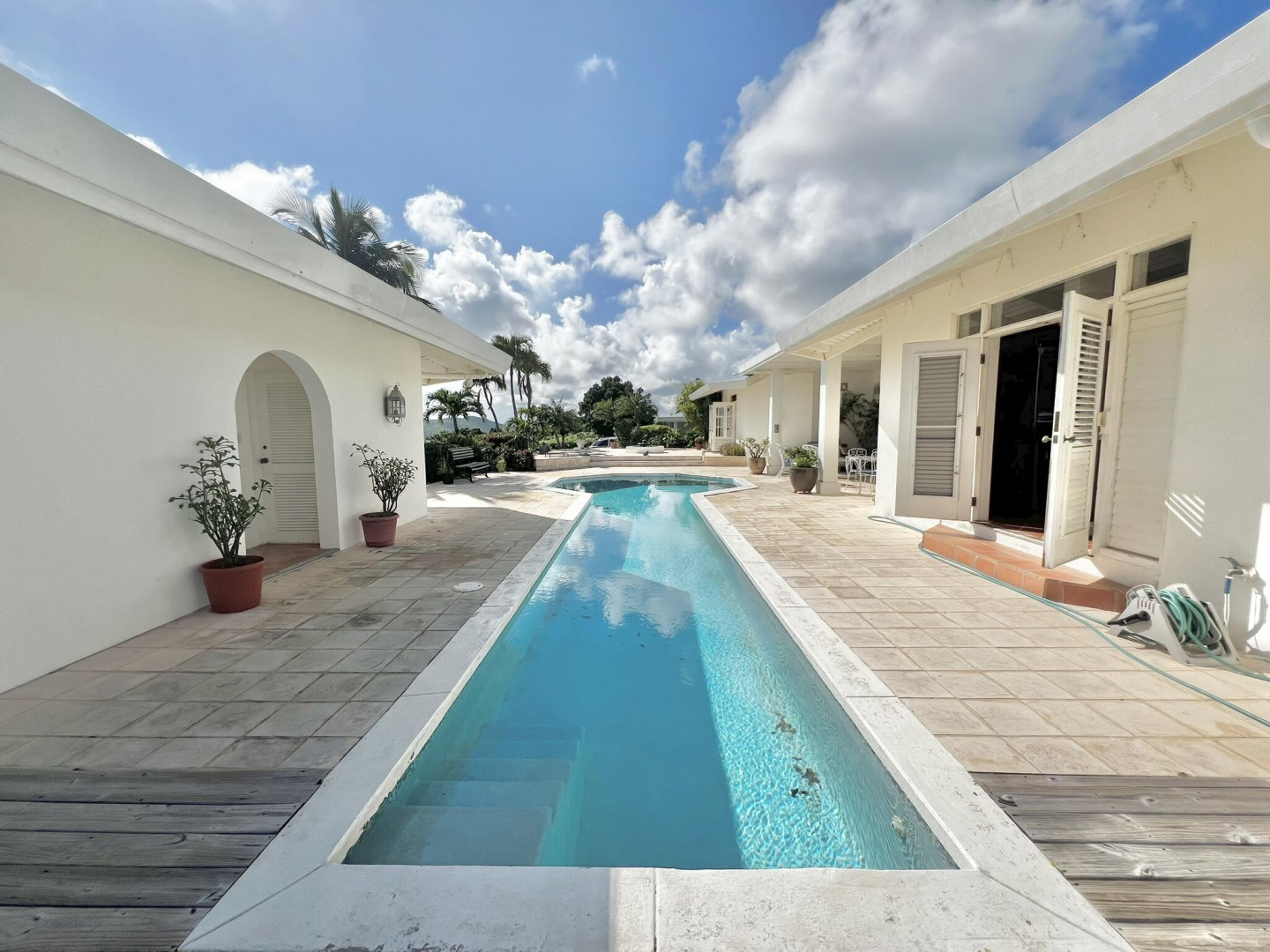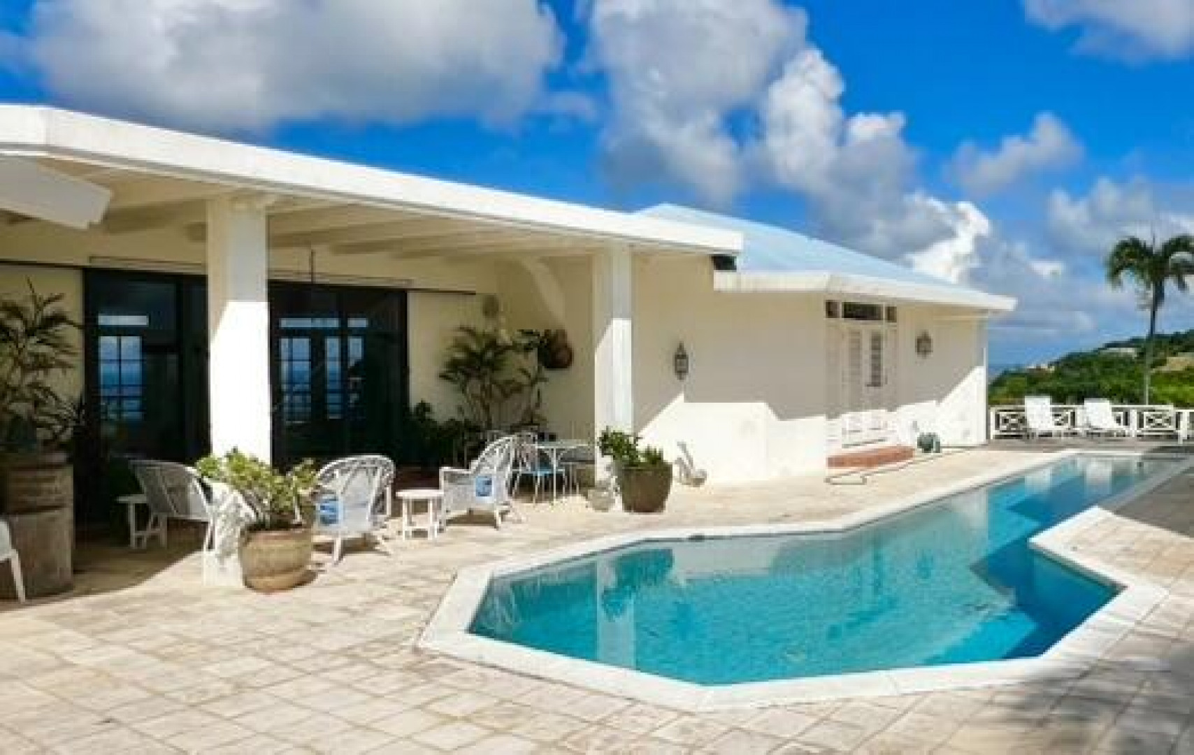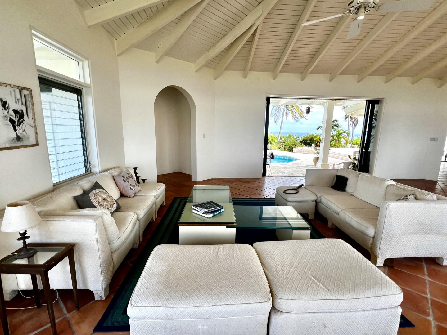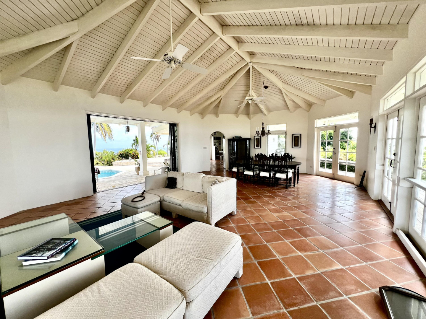 This incredible four-bedroom estate sits on the highest hill in Seven Hills, offering almost 360-degree views of the Caribbean Sea. From the iconic Buck Island to the Southshore and westward to Judith's Fancy and downtown Christiansted, every vantage point captures stunning natural beauty, including breathtaking sunsets. Custom-designed to maximize these vistas, the home features a unique layout with a central pool taking center stage, surrounded by uninterrupted views and an expansive pool deck. The estate is thoughtfully designed with two distinct living pods flanking the pool. The main pod is a bright and spacious retreat, highlighted by an open great room that blends the dining and large seating area.Wrapped in doors with 1/4-inch glass on the seaside & custom sliding impact glass doors on the poolside that pocket out of view, the space offers seamless indoor-outdoor living. The great room flows effortlessly to a covered gallery on the pool side and a large gallery that spans the entire northern sea facing side with some of the most breathtaking views on the island. Connected to the great room is a spacious kitchen featuring a cozy seating area with a fireplace, perfect for gathering and half bath. The main pod also includes the primary suite that is angled perfectly towards Buck Island so you wake to that stunning island view. Wake in the morning to the gorgeous view and roll out of your bed to do some laps in your pool before a day of island adventures. There is also a garage that is detached from the main pod, that currently only has one opening but was built to be a two-car garage with plenty of storage space, a workshop and the laundry room. The breezes are continuously blowing through the home for comfort and minimizing your power bill.