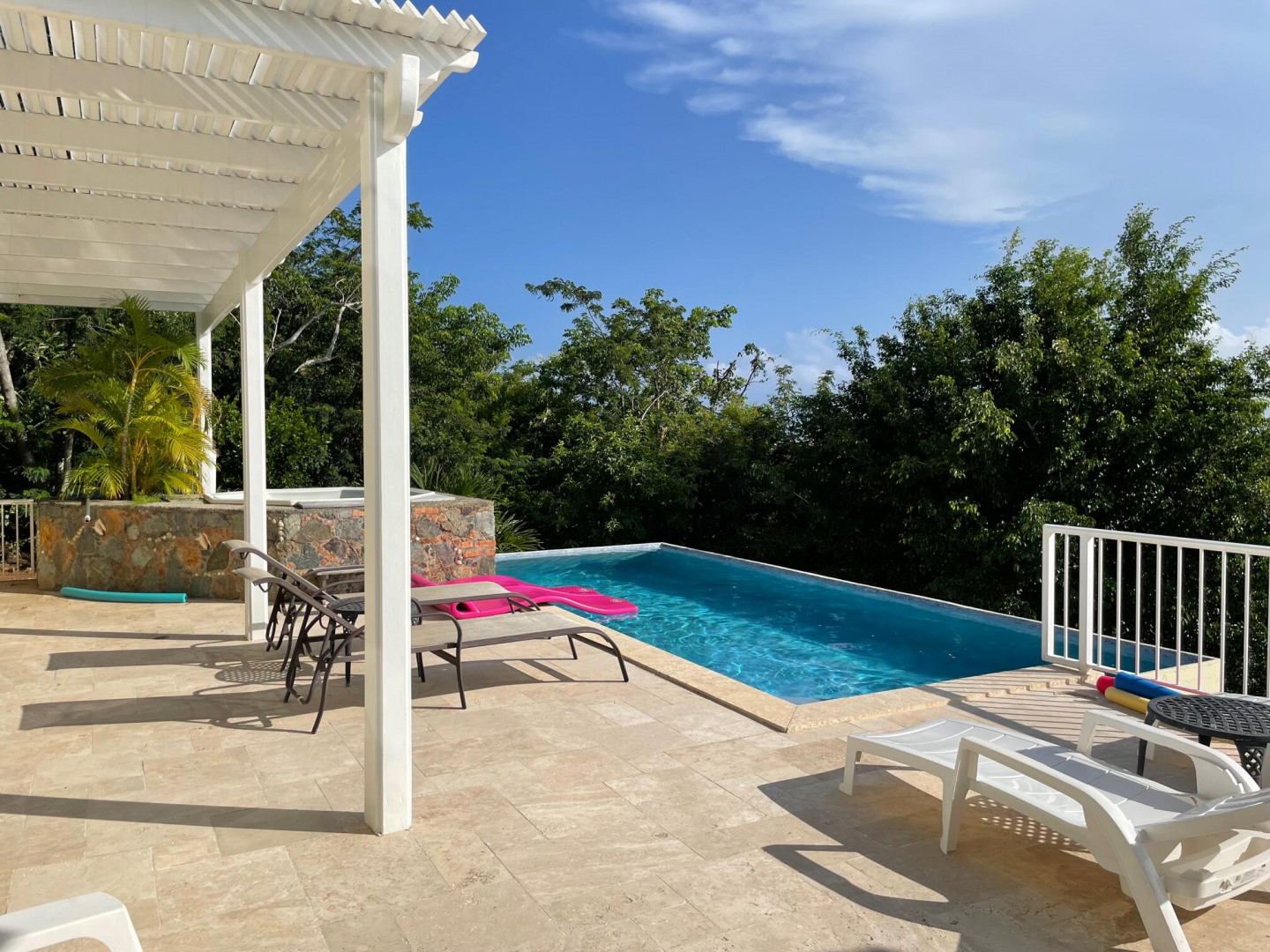 Villa Splendore, located on south west side of Maria Bluff overlooking the Caribbean Sea from about 375 feet above the ocean, insuring year round sunset views of St Thomas, St Croix, Pillsbury sound and the surround cays. Surrounded by lush tropical landscaping insuring privacy, yet close to Cruz Bay. Splendore offers two identical king suites w)large baths & garden showers.There is a second story space which doubles as an air conditioned bedroom / office. Great room & gourmet kitchen all with panoramic ocean views. Outdoor dining deck offers additional covered dining space and uncovered deck around the 10x30 pool & hot tub. Very successful & popular short rem rental, so buyer must honor all confirmed rental reservation.