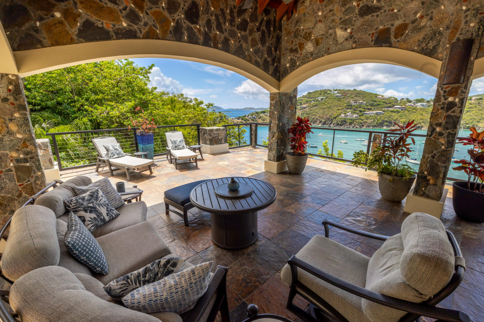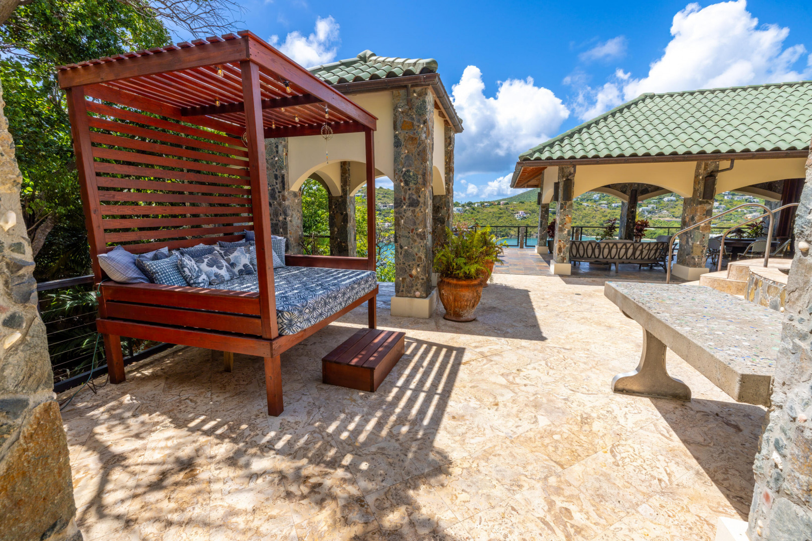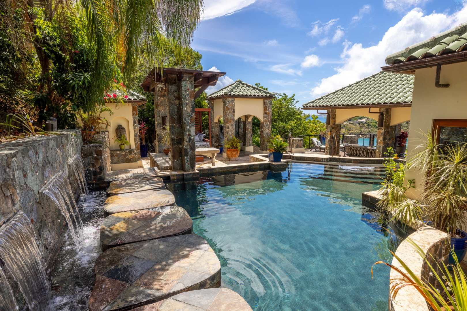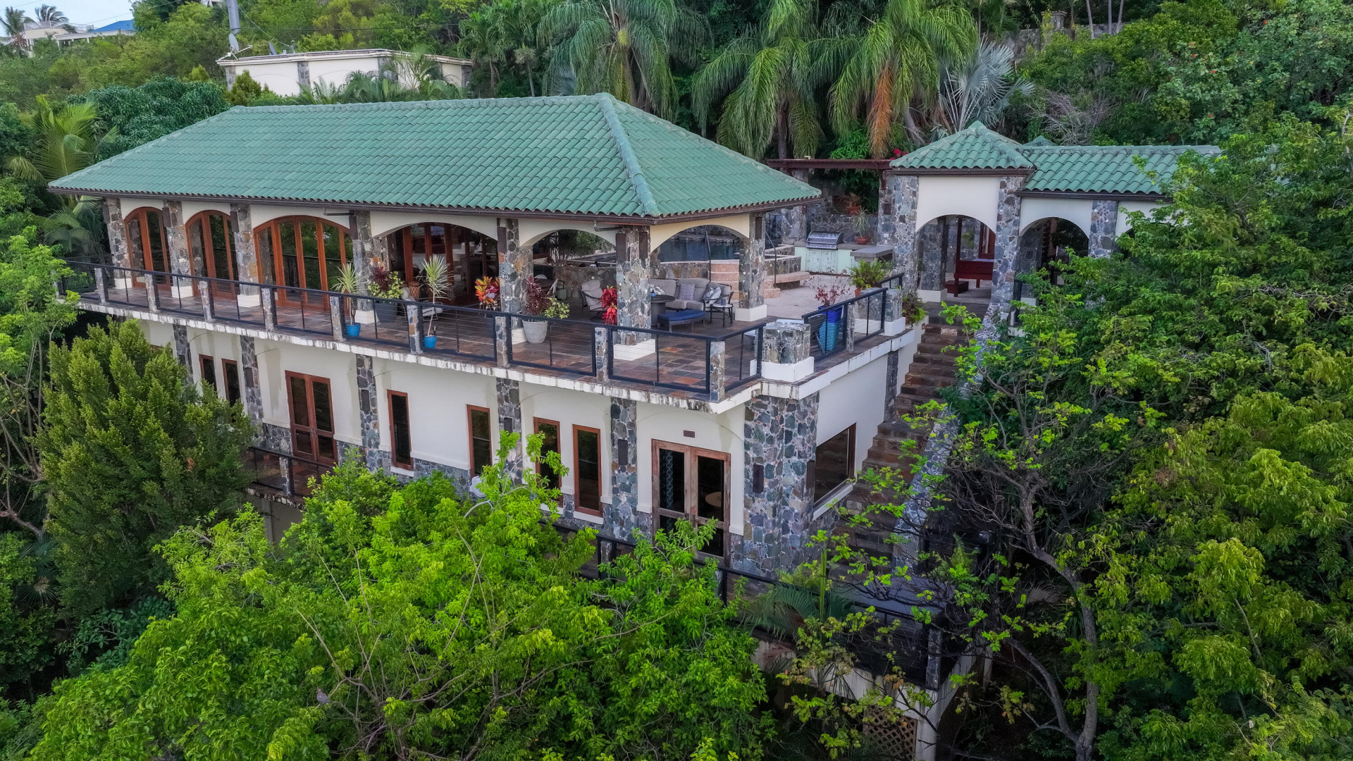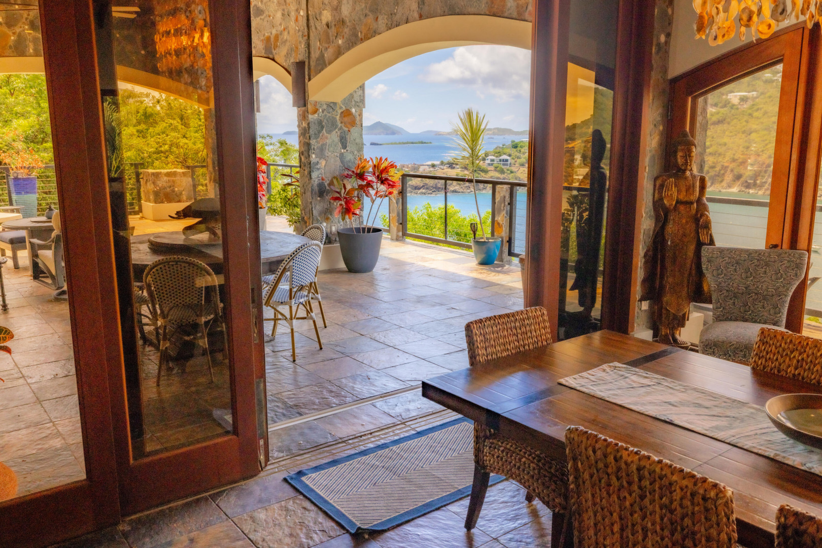L'Autre Monde (''Another World'') is a breathtaking 6 bedroom, 7.5 bath estate in the prestigious enclave of Estate Great Cruz Bay. With commanding sunset views across the sea to St. Thomas, this private sanctuary is designed for refined island living. Native stone archways, expansive terraces, and multiple pools invite seamless indoor-outdoor connection, while lush landscaping and a gated dual-entry layout ensure serenity and discretion. A covered bridge gracefully links the villa's two wings, each thoughtfully appointed for privacy and comfort, offering flexible living for extended family or guests. Inside, fully air-conditioned spaces include a gourmet kitchen, elegant lounges, and artisan-crafted finishes throughout. Dinghy dock access completes this Caribbean masterpiece.The East Wing, completed in 2004, was built with privacy in mind and features a full chef's kitchen with custom cabinetry, quartz counters, laundry, BBQ area, and pool with a waterfall. The West Wingoriginal structure-extensively renovated, includes a beautiful open-air living area with kitchen, dipping pool, and a zen garden patio for tranquil ambiance. The entire compound is gated, with private entrances and parking. Estate has a calm, spa-like feel throughout, with Bali- and Buddhist-inspired elements enhancing the natural surroundings. Generator, masonry construction, custom mahogany windows/doors, and stonework add to its superior quality.