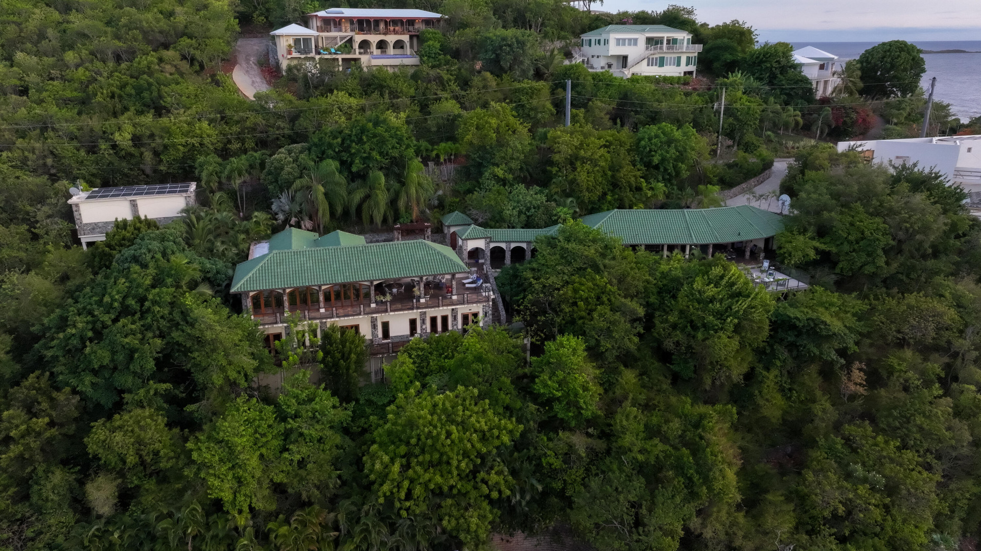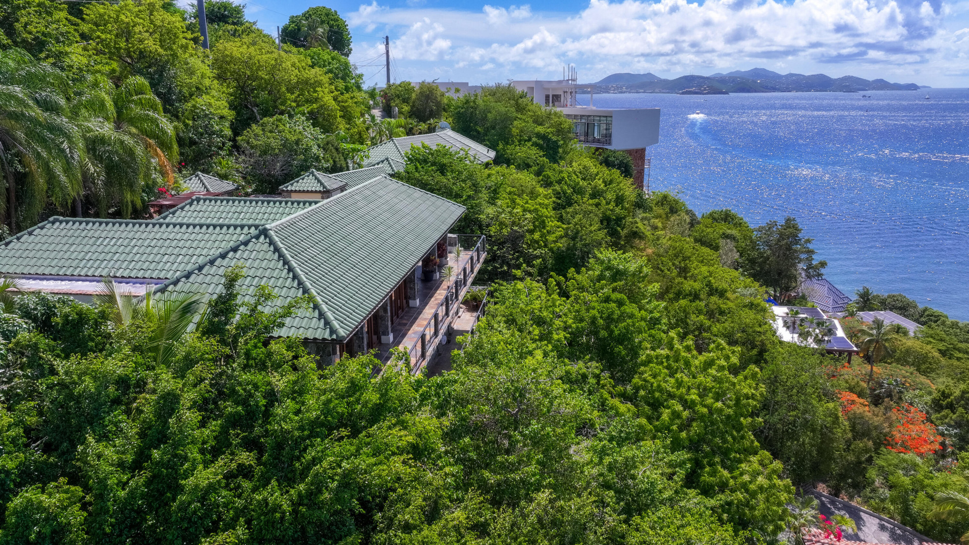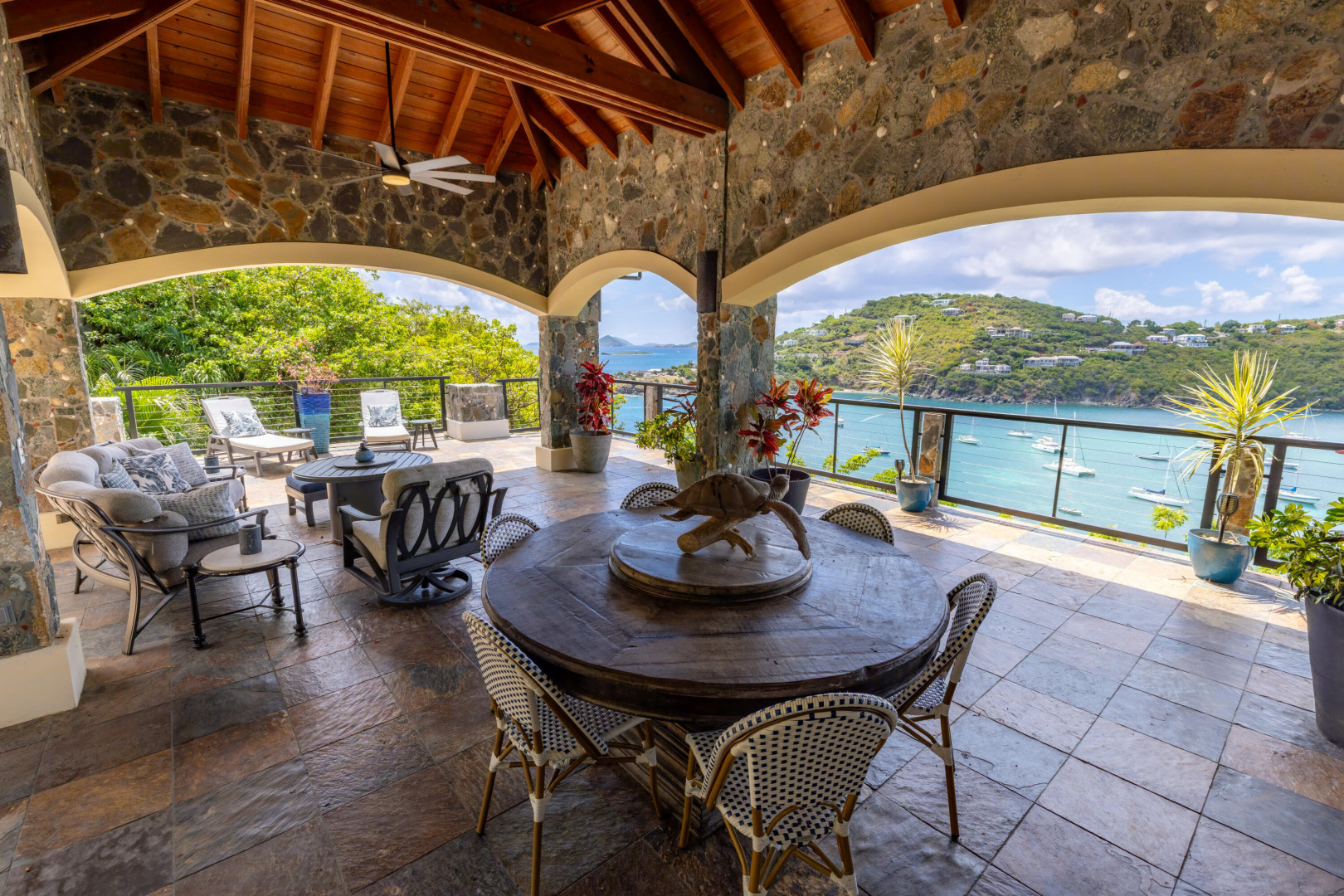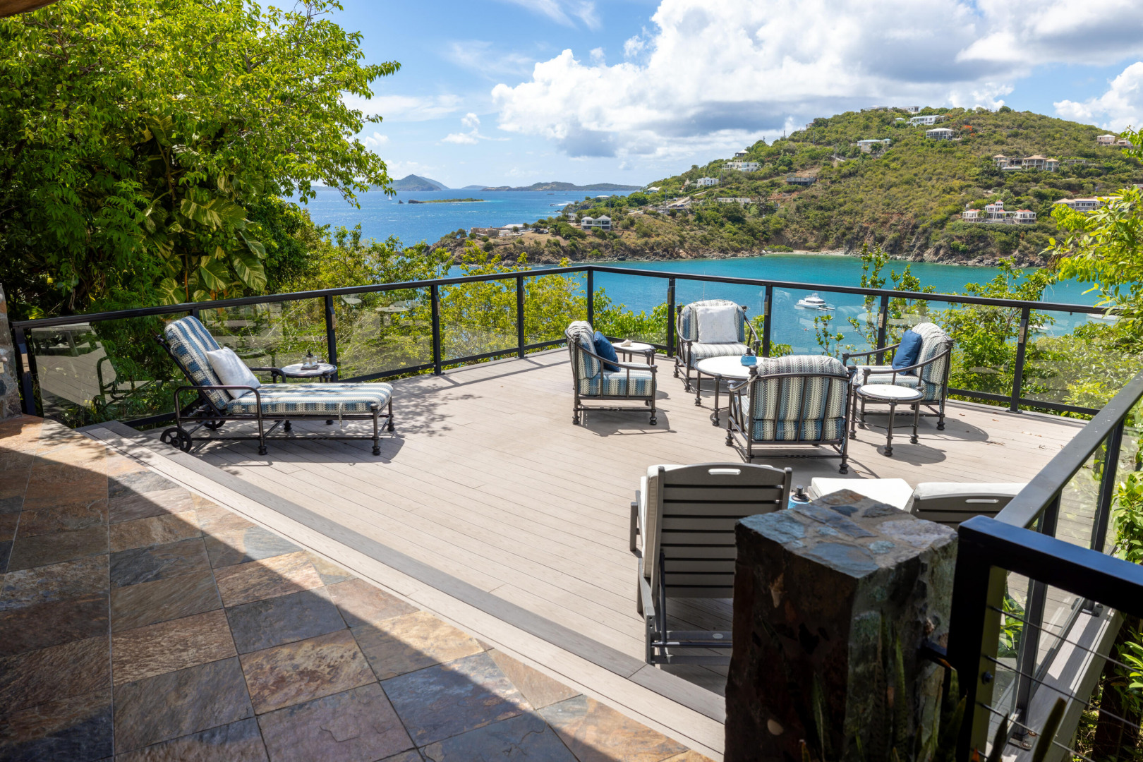 L'Autre Monde (''Another World'') is a breathtaking 6 bedroom, 7.5 bath estate in the prestigious enclave of Estate Great Cruz Bay. With commanding sunset views across the sea to St. Thomas, this private sanctuary is designed for refined island living. Native stone archways, expansive terraces, and multiple pools invite seamless indoor-outdoor connection, while lush landscaping and a gated dual-entry layout ensure serenity and discretion. A covered bridge gracefully links the villa's two wings, each thoughtfully appointed for privacy and comfort, offering flexible living for extended family or guests. Inside, fully air-conditioned spaces include a gourmet kitchen, elegant lounges, and artisan-crafted finishes throughout. Dinghy dock access completes this Caribbean masterpiece.The East Wing, completed in 2004, was built with privacy in mind and features a full chef's kitchen with custom cabinetry, quartz counters, laundry, BBQ area, and pool with a waterfall. The West Wingoriginal structure-extensively renovated, includes a beautiful open-air living area with kitchen, dipping pool, and a zen garden patio for tranquil ambiance. The entire compound is gated, with private entrances and parking. Estate has a calm, spa-like feel throughout, with Bali- and Buddhist-inspired elements enhancing the natural surroundings. Generator, masonry construction, custom mahogany windows/doors, and stonework add to its superior quality.