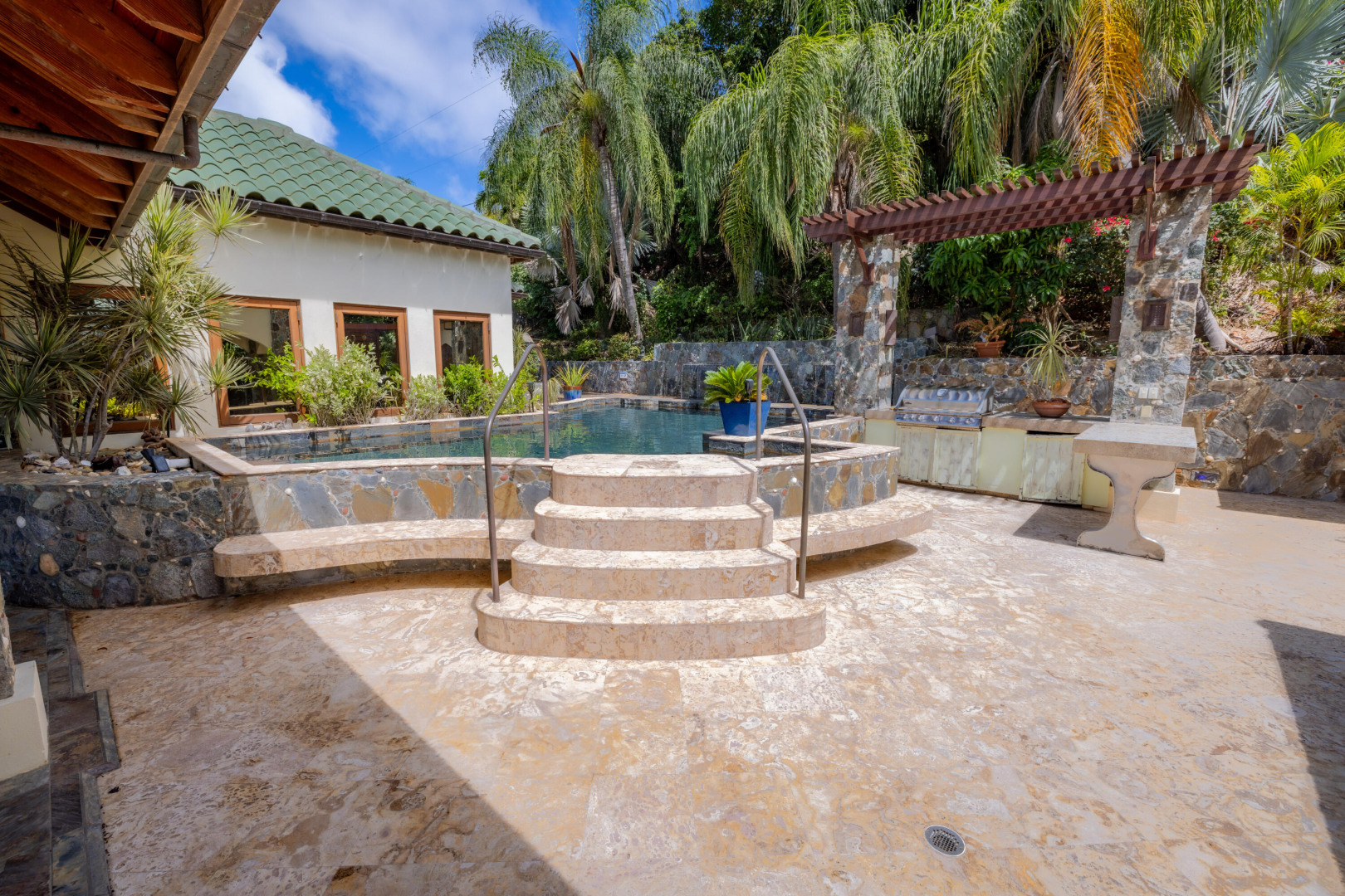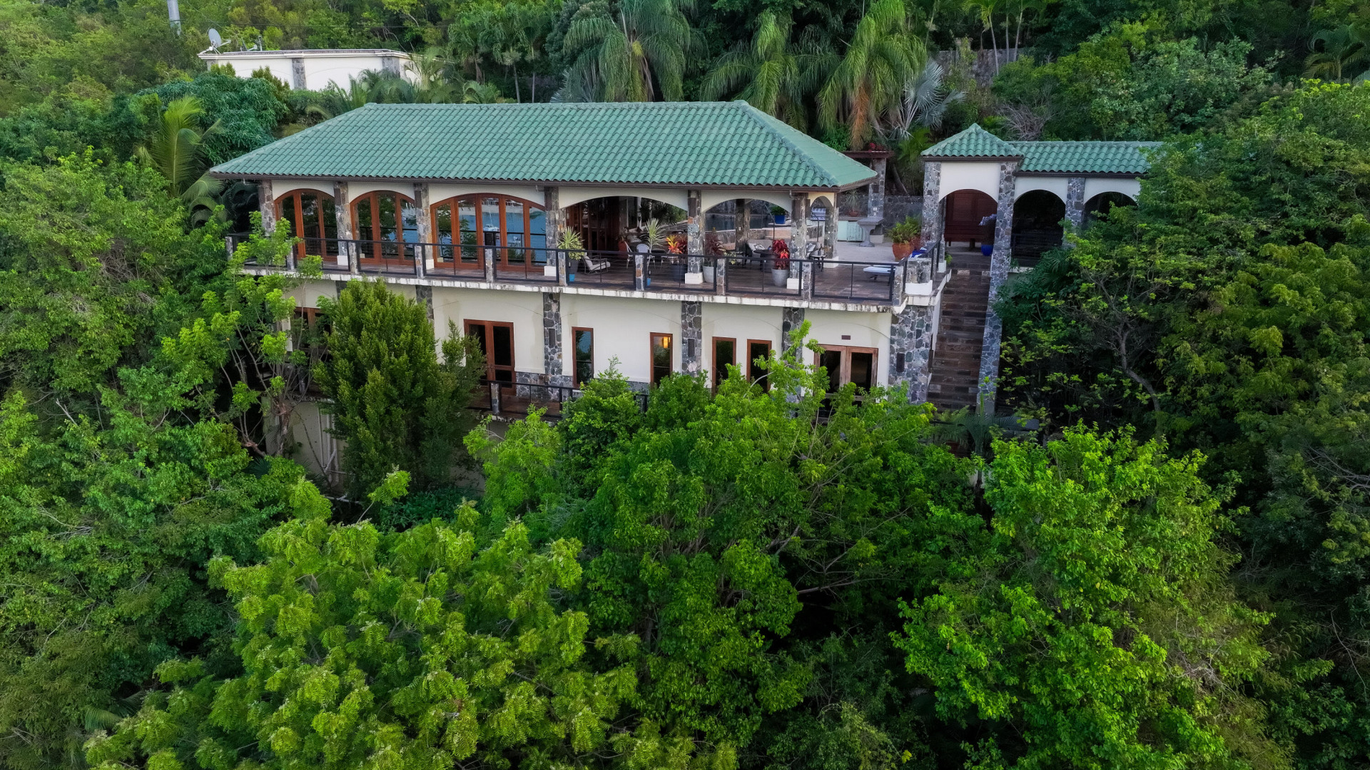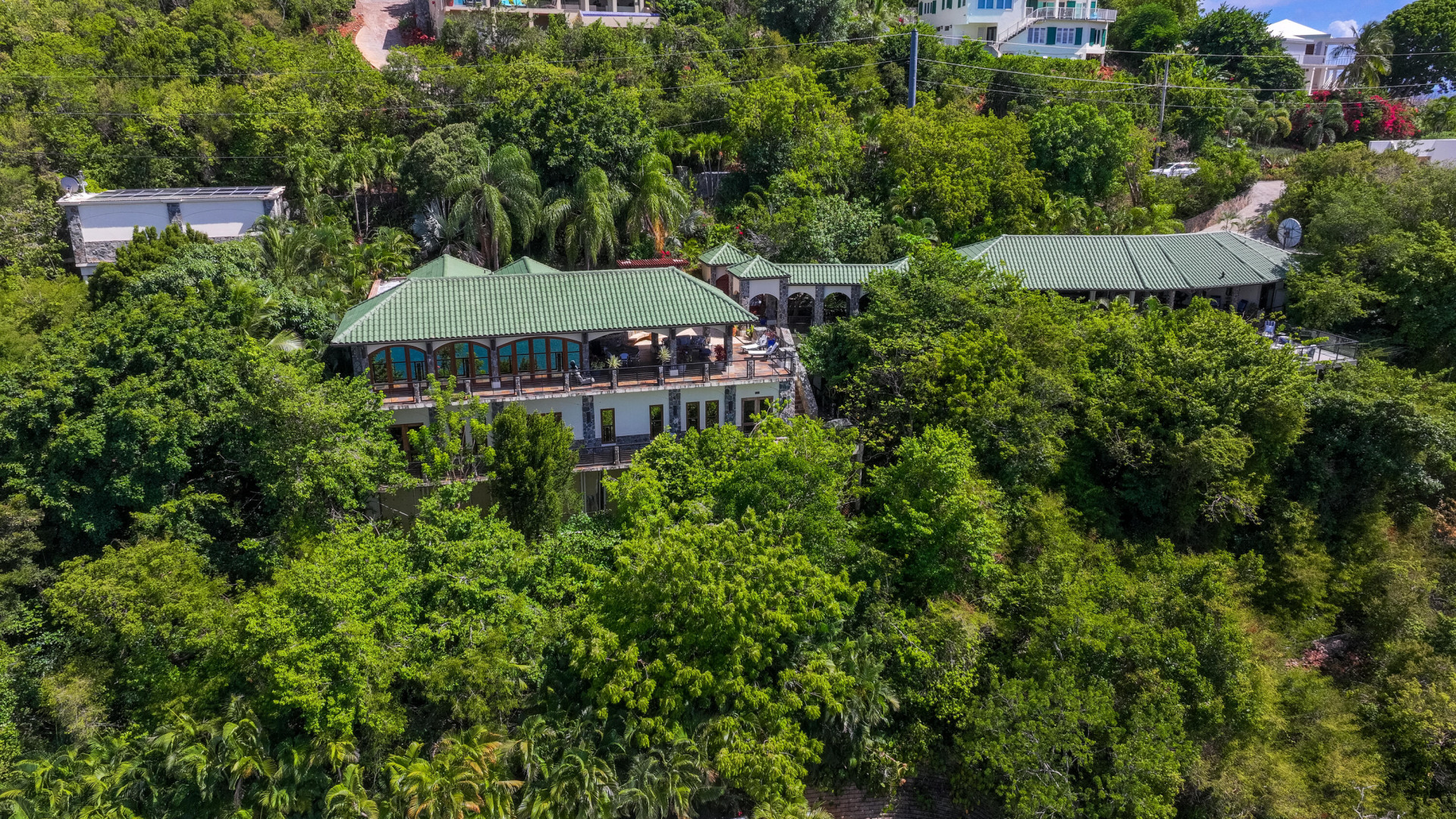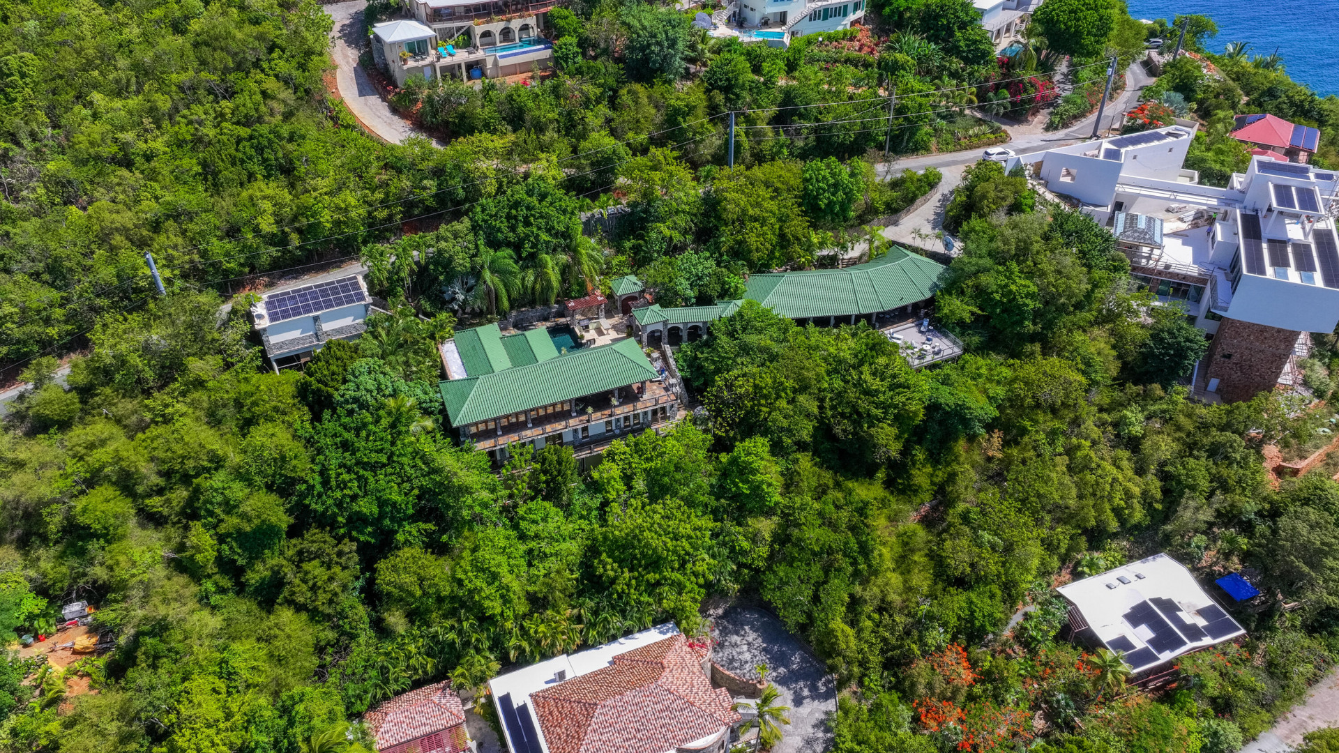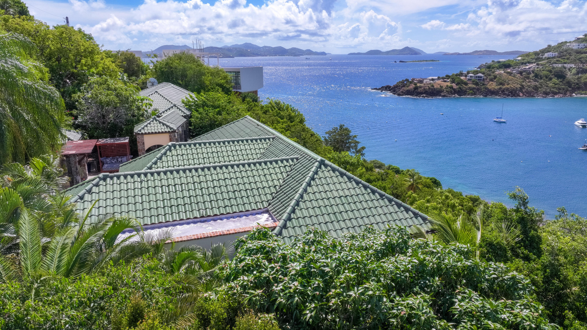 L'Autre Monde (''Another World'') is a breathtaking 6 bedroom, 7.5 bath estate in the prestigious enclave of Estate Great Cruz Bay. With commanding sunset views across the sea to St. Thomas, this private sanctuary is designed for refined island living. Native stone archways, expansive terraces, and multiple pools invite seamless indoor-outdoor connection, while lush landscaping and a gated dual-entry layout ensure serenity and discretion. A covered bridge gracefully links the villa's two wings, each thoughtfully appointed for privacy and comfort, offering flexible living for extended family or guests. Inside, fully air-conditioned spaces include a gourmet kitchen, elegant lounges, and artisan-crafted finishes throughout. Dinghy dock access completes this Caribbean masterpiece.The East Wing, completed in 2004, was built with privacy in mind and features a full chef's kitchen with custom cabinetry, quartz counters, laundry, BBQ area, and pool with a waterfall. The West Wingoriginal structure-extensively renovated, includes a beautiful open-air living area with kitchen, dipping pool, and a zen garden patio for tranquil ambiance. The entire compound is gated, with private entrances and parking. Estate has a calm, spa-like feel throughout, with Bali- and Buddhist-inspired elements enhancing the natural surroundings. Generator, masonry construction, custom mahogany windows/doors, and stonework add to its superior quality.