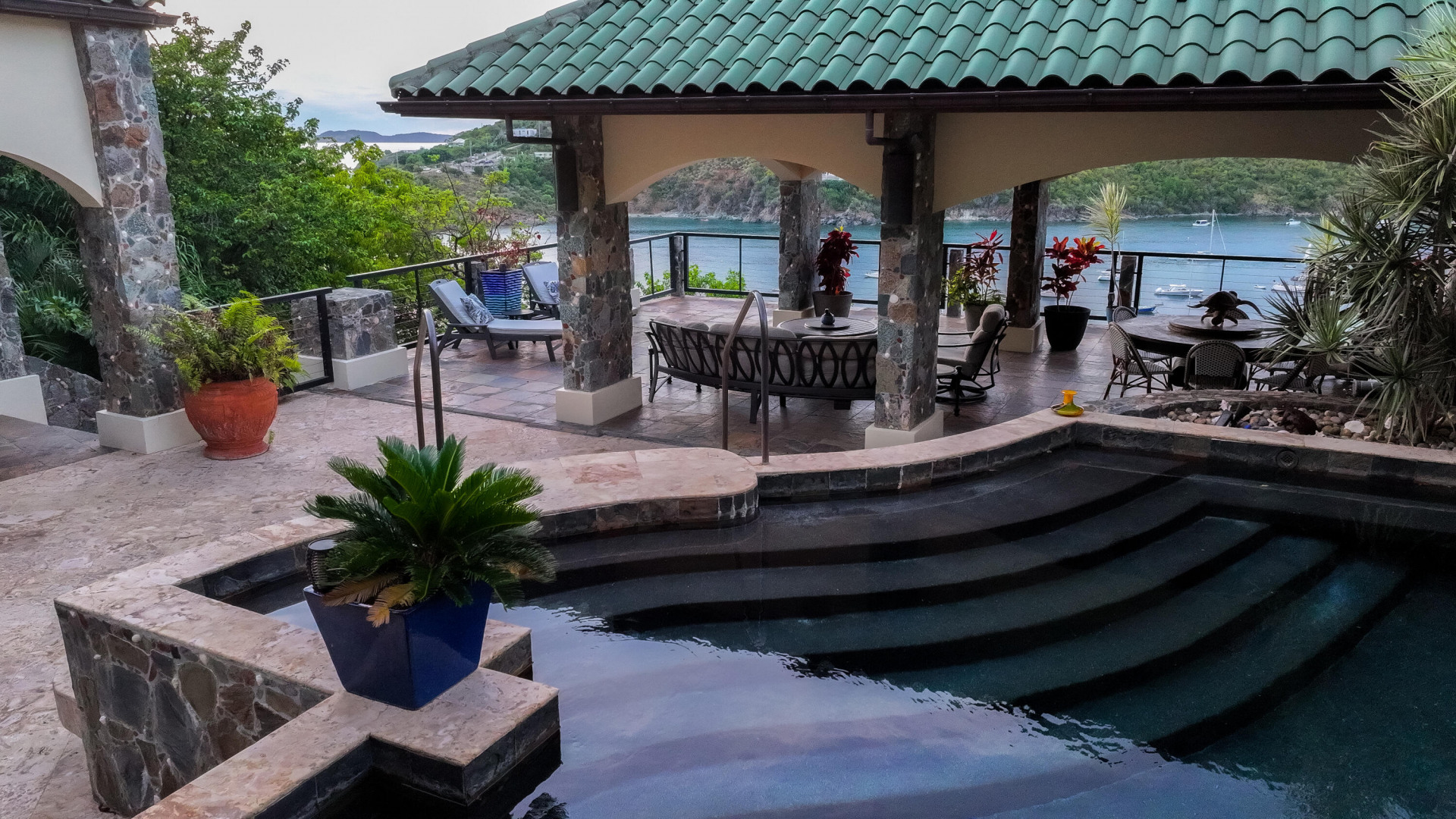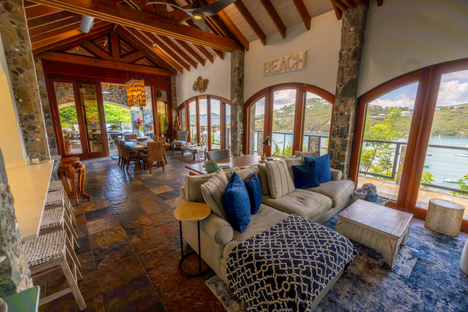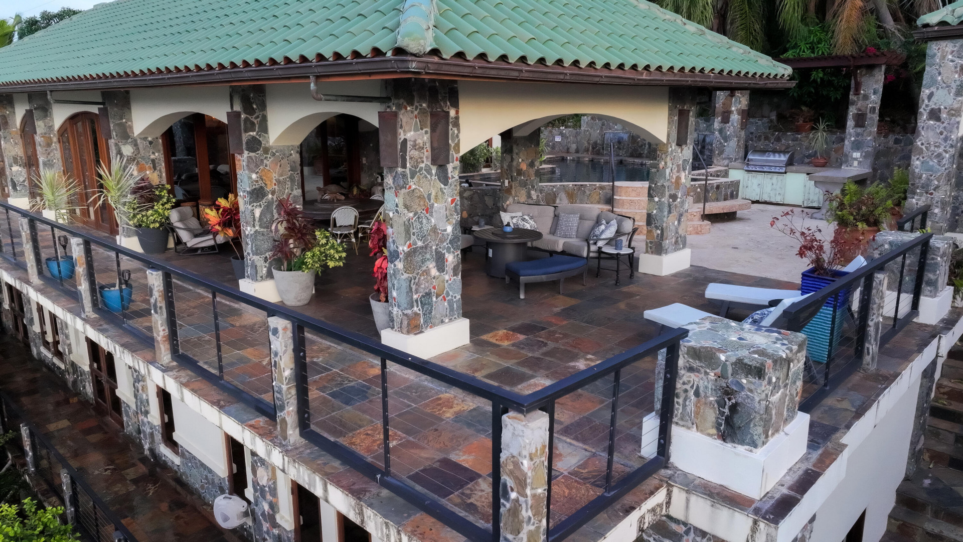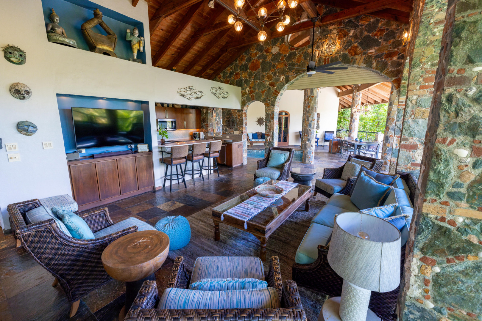 L'Autre Monde (''Another World'') is a breathtaking 6 bedroom, 7.5 bath estate in the prestigious enclave of Estate Great Cruz Bay. With commanding sunset views across the sea to St. Thomas, this private sanctuary is designed for refined island living. Native stone archways, expansive terraces, and multiple pools invite seamless indoor-outdoor connection, while lush landscaping and a gated dual-entry layout ensure serenity and discretion. A covered bridge gracefully links the villa's two wings, each thoughtfully appointed for privacy and comfort, offering flexible living for extended family or guests. Inside, fully air-conditioned spaces include a gourmet kitchen, elegant lounges, and artisan-crafted finishes throughout. Dinghy dock access completes this Caribbean masterpiece.The East Wing, completed in 2004, was built with privacy in mind and features a full chef's kitchen with custom cabinetry, quartz counters, laundry, BBQ area, and pool with a waterfall. The West Wingoriginal structure-extensively renovated, includes a beautiful open-air living area with kitchen, dipping pool, and a zen garden patio for tranquil ambiance. The entire compound is gated, with private entrances and parking. Estate has a calm, spa-like feel throughout, with Bali- and Buddhist-inspired elements enhancing the natural surroundings. Generator, masonry construction, custom mahogany windows/doors, and stonework add to its superior quality.