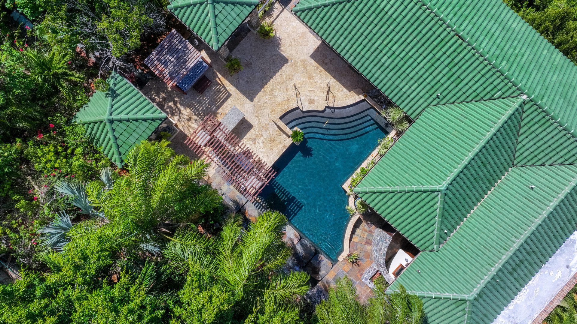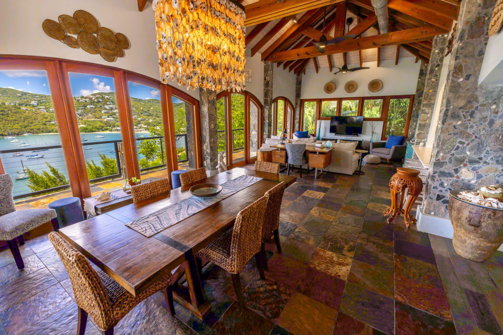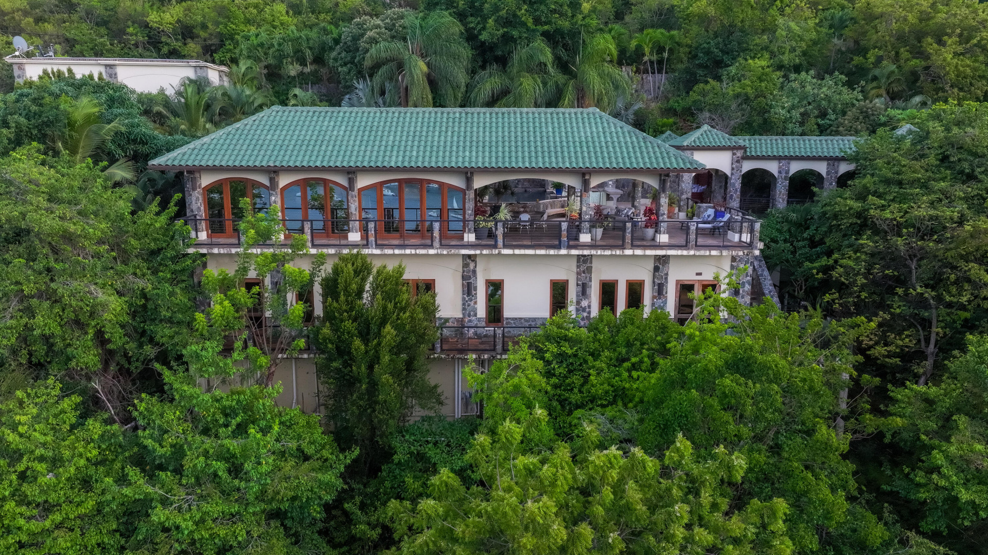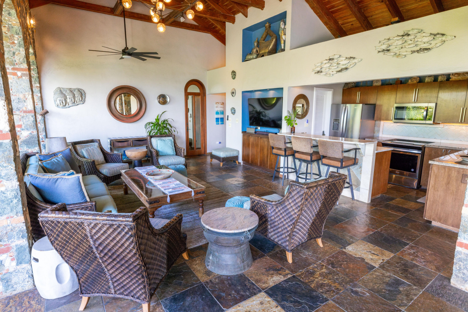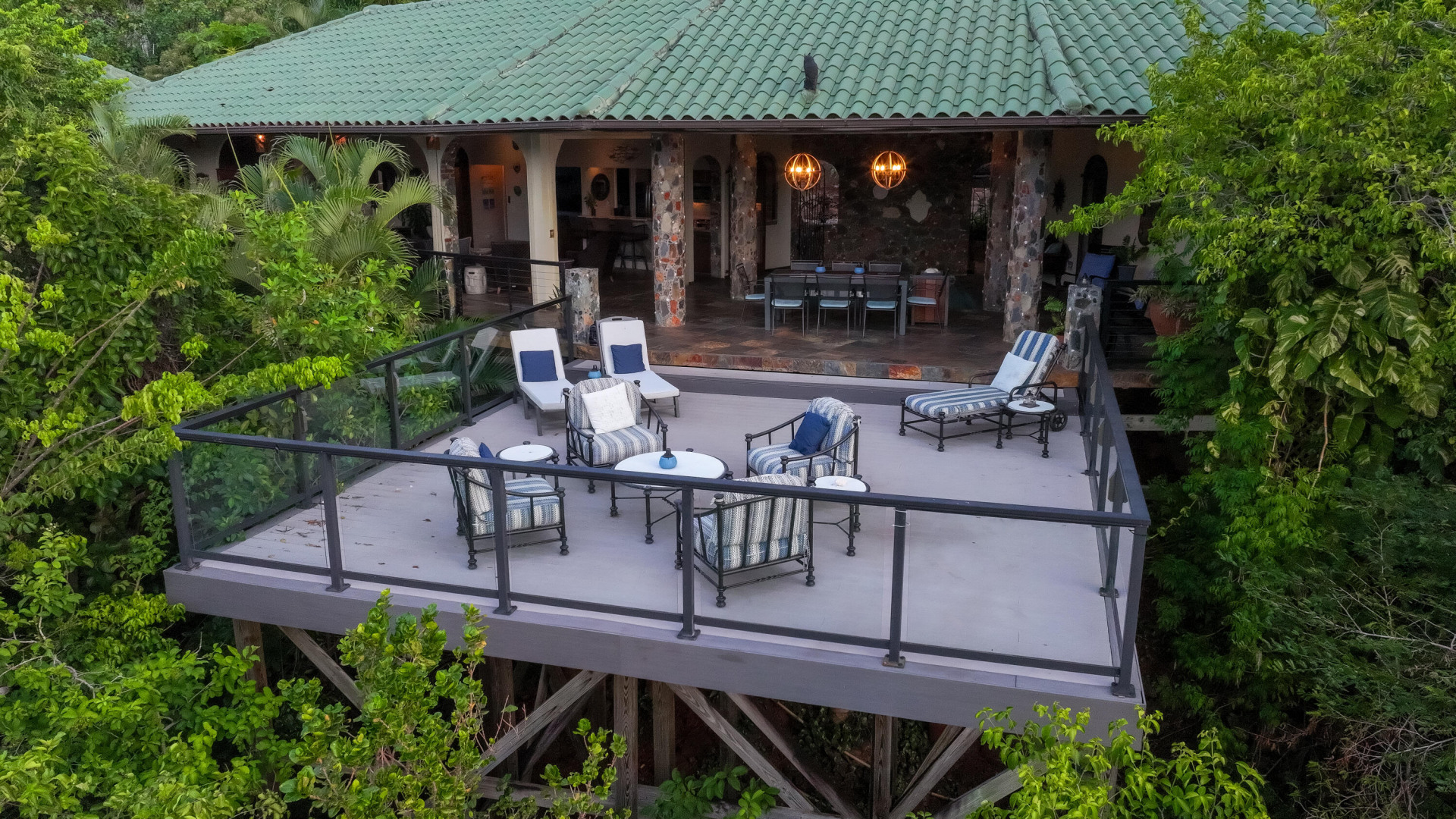L'Autre Monde (''Another World'') is a breathtaking 6 bedroom, 7.5 bath estate in the prestigious enclave of Estate Great Cruz Bay. With commanding sunset views across the sea to St. Thomas, this private sanctuary is designed for refined island living. Native stone archways, expansive terraces, and multiple pools invite seamless indoor-outdoor connection, while lush landscaping and a gated dual-entry layout ensure serenity and discretion. A covered bridge gracefully links the villa's two wings, each thoughtfully appointed for privacy and comfort, offering flexible living for extended family or guests. Inside, fully air-conditioned spaces include a gourmet kitchen, elegant lounges, and artisan-crafted finishes throughout. Dinghy dock access completes this Caribbean masterpiece.The East Wing, completed in 2004, was built with privacy in mind and features a full chef's kitchen with custom cabinetry, quartz counters, laundry, BBQ area, and pool with a waterfall. The West Wingoriginal structure-extensively renovated, includes a beautiful open-air living area with kitchen, dipping pool, and a zen garden patio for tranquil ambiance. The entire compound is gated, with private entrances and parking. Estate has a calm, spa-like feel throughout, with Bali- and Buddhist-inspired elements enhancing the natural surroundings. Generator, masonry construction, custom mahogany windows/doors, and stonework add to its superior quality.