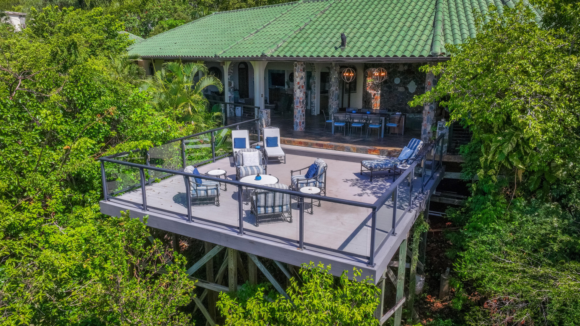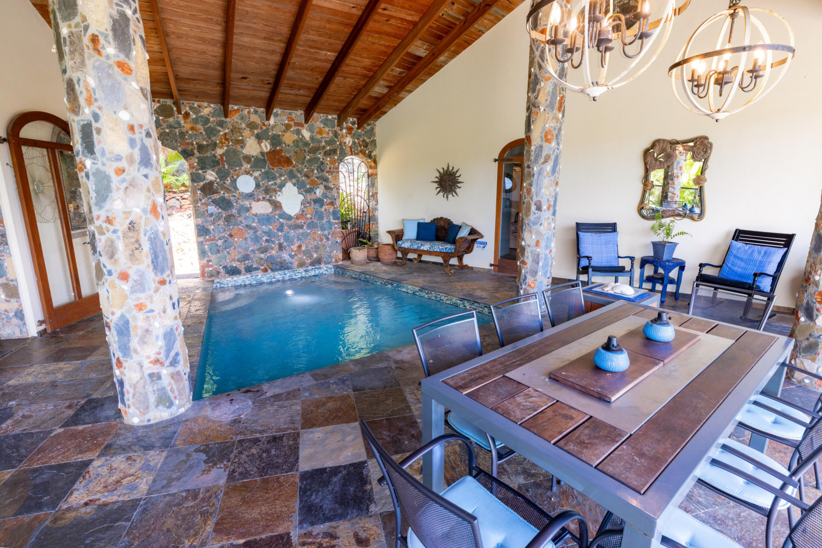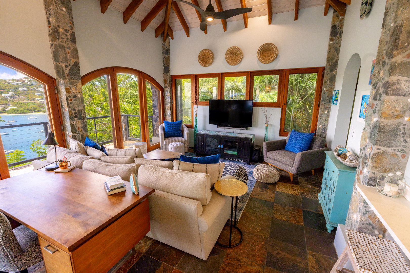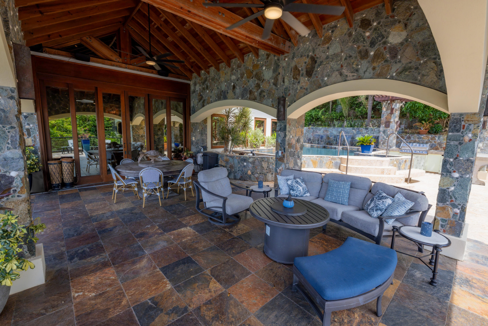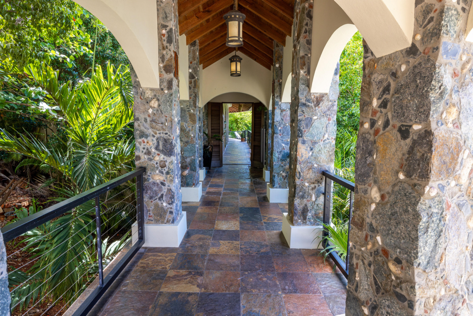 L'Autre Monde (''Another World'') is a breathtaking 6 bedroom, 7.5 bath estate in the prestigious enclave of Estate Great Cruz Bay. With commanding sunset views across the sea to St. Thomas, this private sanctuary is designed for refined island living. Native stone archways, expansive terraces, and multiple pools invite seamless indoor-outdoor connection, while lush landscaping and a gated dual-entry layout ensure serenity and discretion. A covered bridge gracefully links the villa's two wings, each thoughtfully appointed for privacy and comfort, offering flexible living for extended family or guests. Inside, fully air-conditioned spaces include a gourmet kitchen, elegant lounges, and artisan-crafted finishes throughout. Dinghy dock access completes this Caribbean masterpiece.The East Wing, completed in 2004, was built with privacy in mind and features a full chef's kitchen with custom cabinetry, quartz counters, laundry, BBQ area, and pool with a waterfall. The West Wingoriginal structure-extensively renovated, includes a beautiful open-air living area with kitchen, dipping pool, and a zen garden patio for tranquil ambiance. The entire compound is gated, with private entrances and parking. Estate has a calm, spa-like feel throughout, with Bali- and Buddhist-inspired elements enhancing the natural surroundings. Generator, masonry construction, custom mahogany windows/doors, and stonework add to its superior quality.