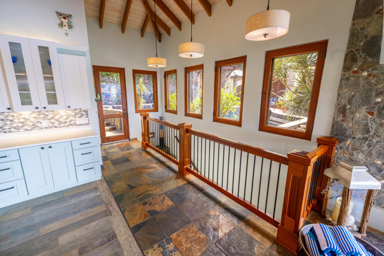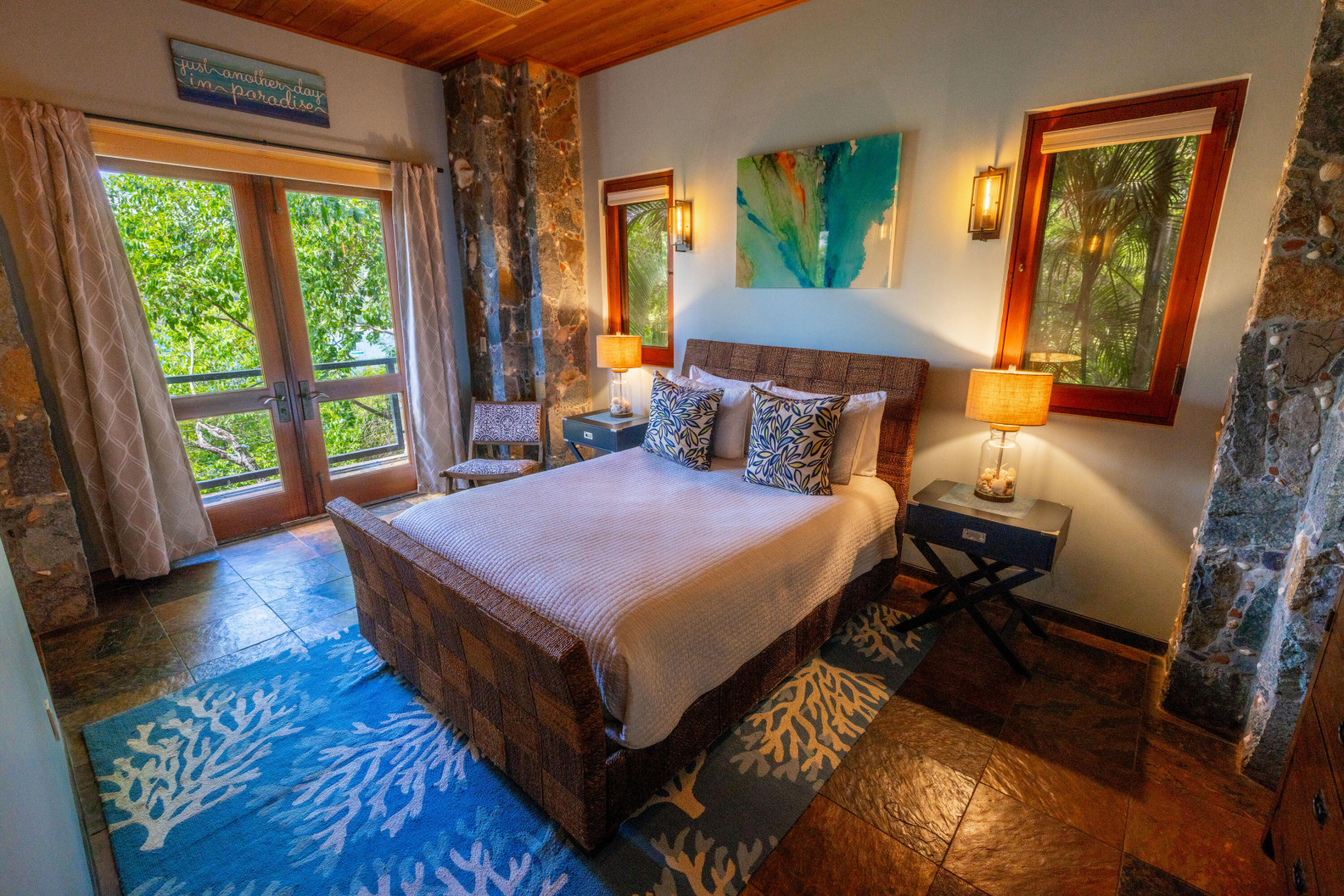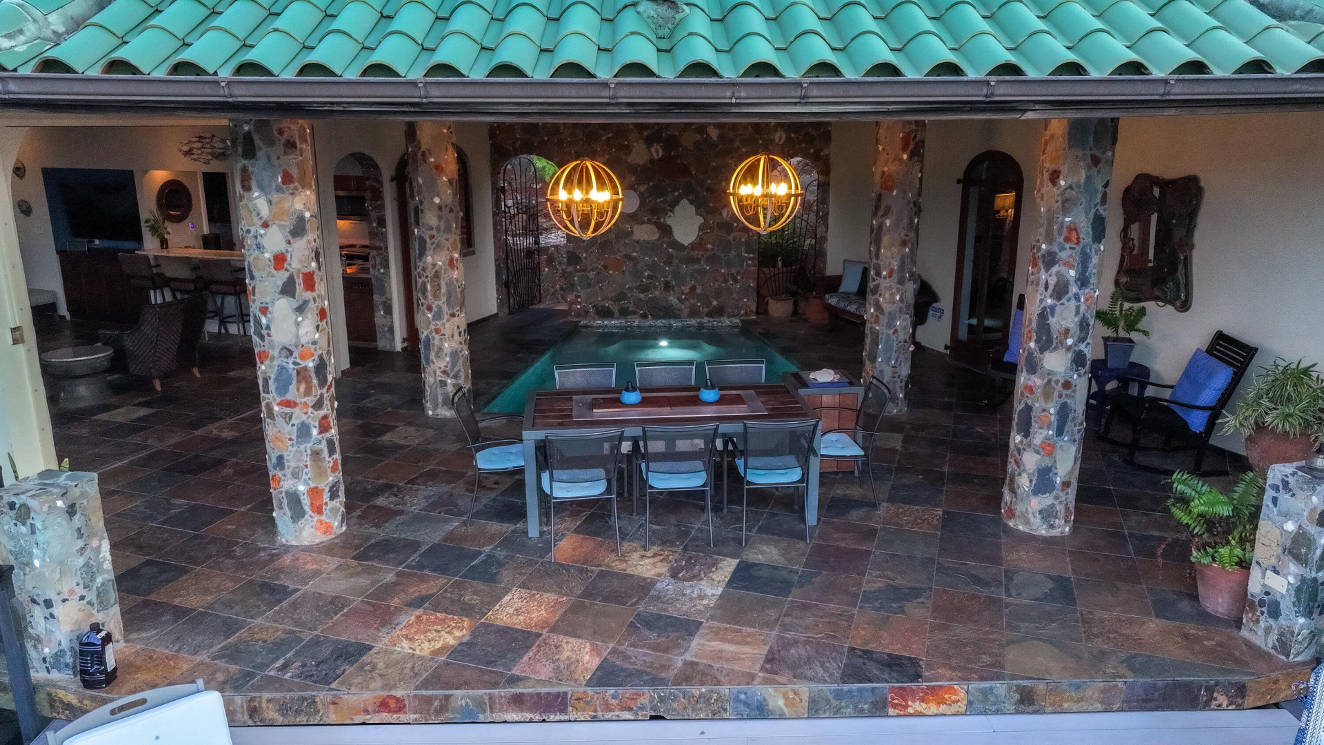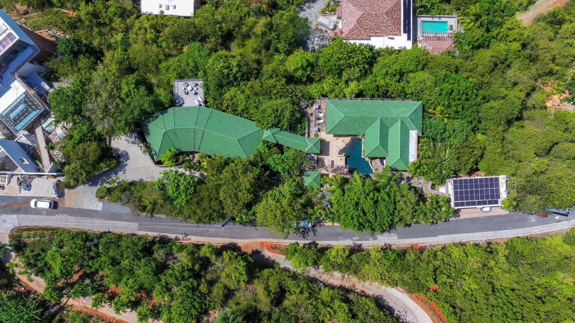 L'Autre Monde (''Another World'') is a breathtaking 6 bedroom, 7.5 bath estate in the prestigious enclave of Estate Great Cruz Bay. With commanding sunset views across the sea to St. Thomas, this private sanctuary is designed for refined island living. Native stone archways, expansive terraces, and multiple pools invite seamless indoor-outdoor connection, while lush landscaping and a gated dual-entry layout ensure serenity and discretion. A covered bridge gracefully links the villa's two wings, each thoughtfully appointed for privacy and comfort, offering flexible living for extended family or guests. Inside, fully air-conditioned spaces include a gourmet kitchen, elegant lounges, and artisan-crafted finishes throughout. Dinghy dock access completes this Caribbean masterpiece.The East Wing, completed in 2004, was built with privacy in mind and features a full chef's kitchen with custom cabinetry, quartz counters, laundry, BBQ area, and pool with a waterfall. The West Wingoriginal structure-extensively renovated, includes a beautiful open-air living area with kitchen, dipping pool, and a zen garden patio for tranquil ambiance. The entire compound is gated, with private entrances and parking. Estate has a calm, spa-like feel throughout, with Bali- and Buddhist-inspired elements enhancing the natural surroundings. Generator, masonry construction, custom mahogany windows/doors, and stonework add to its superior quality.