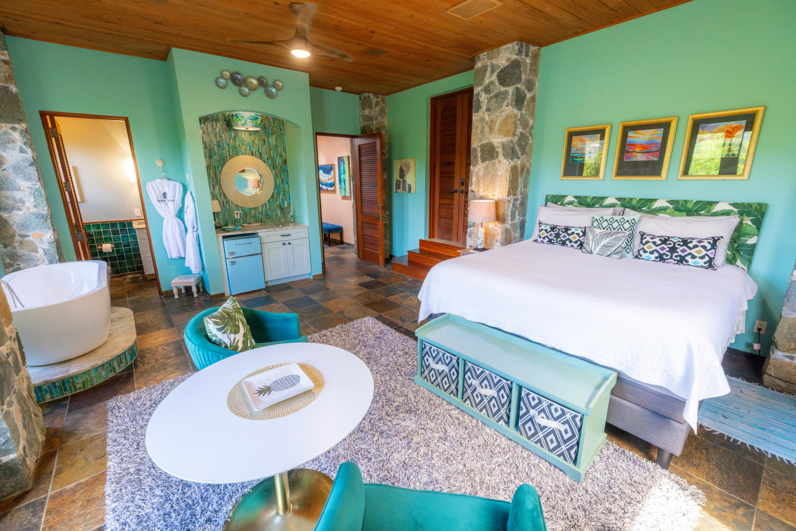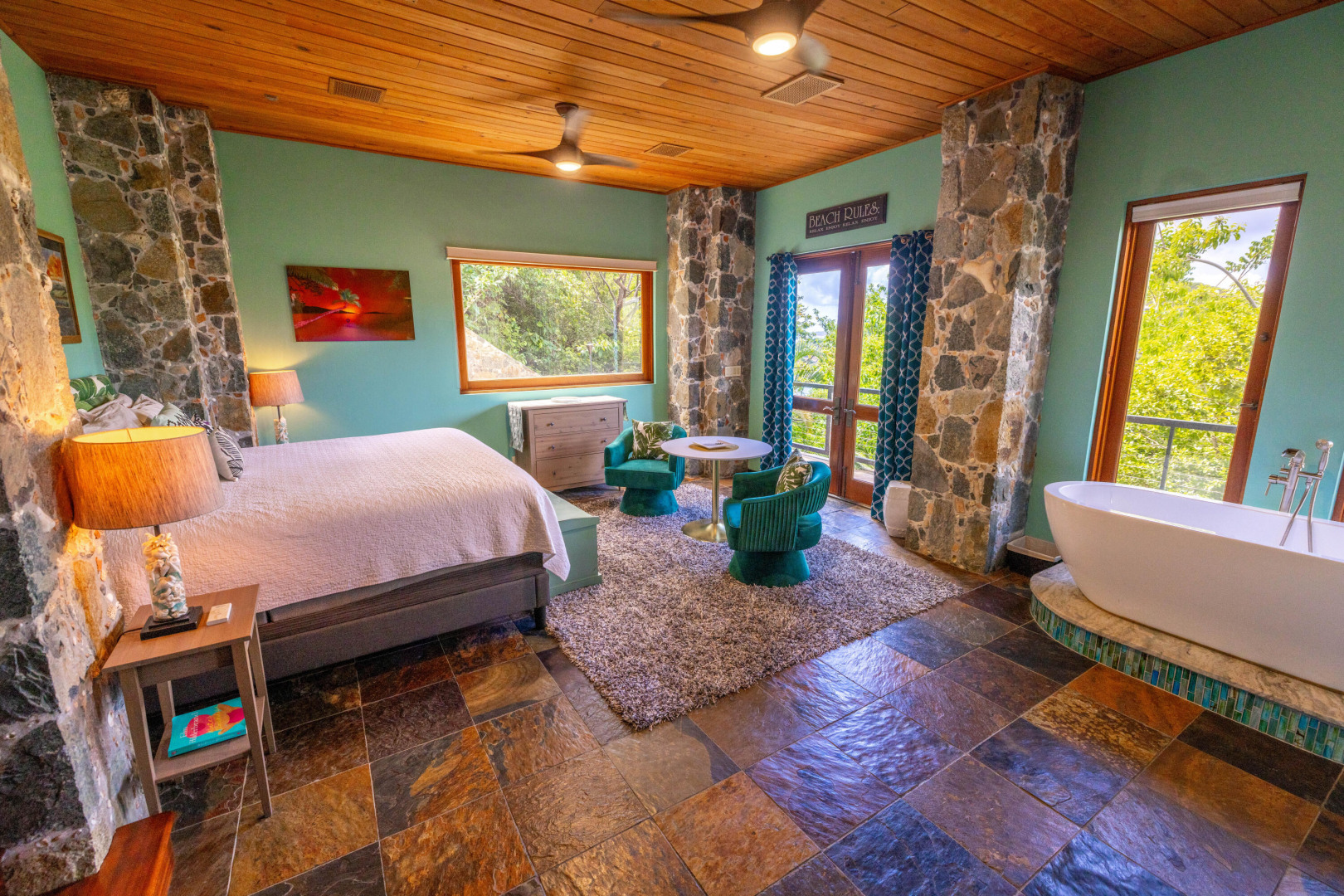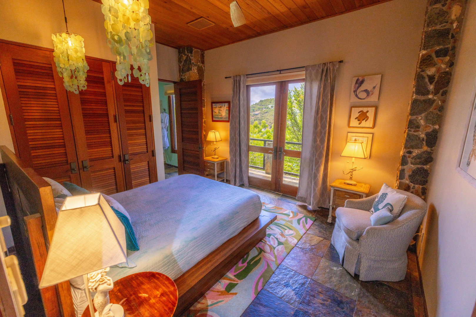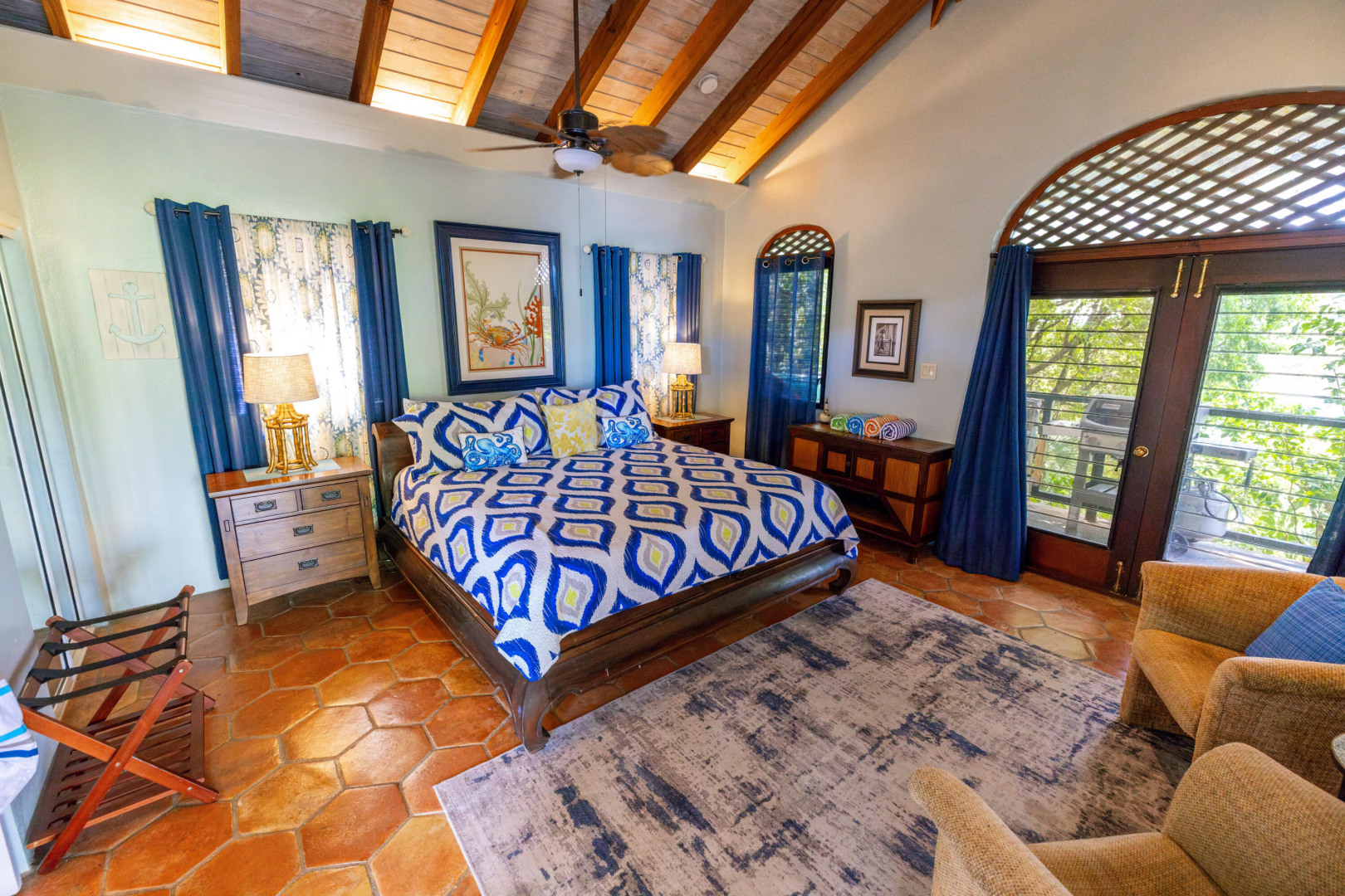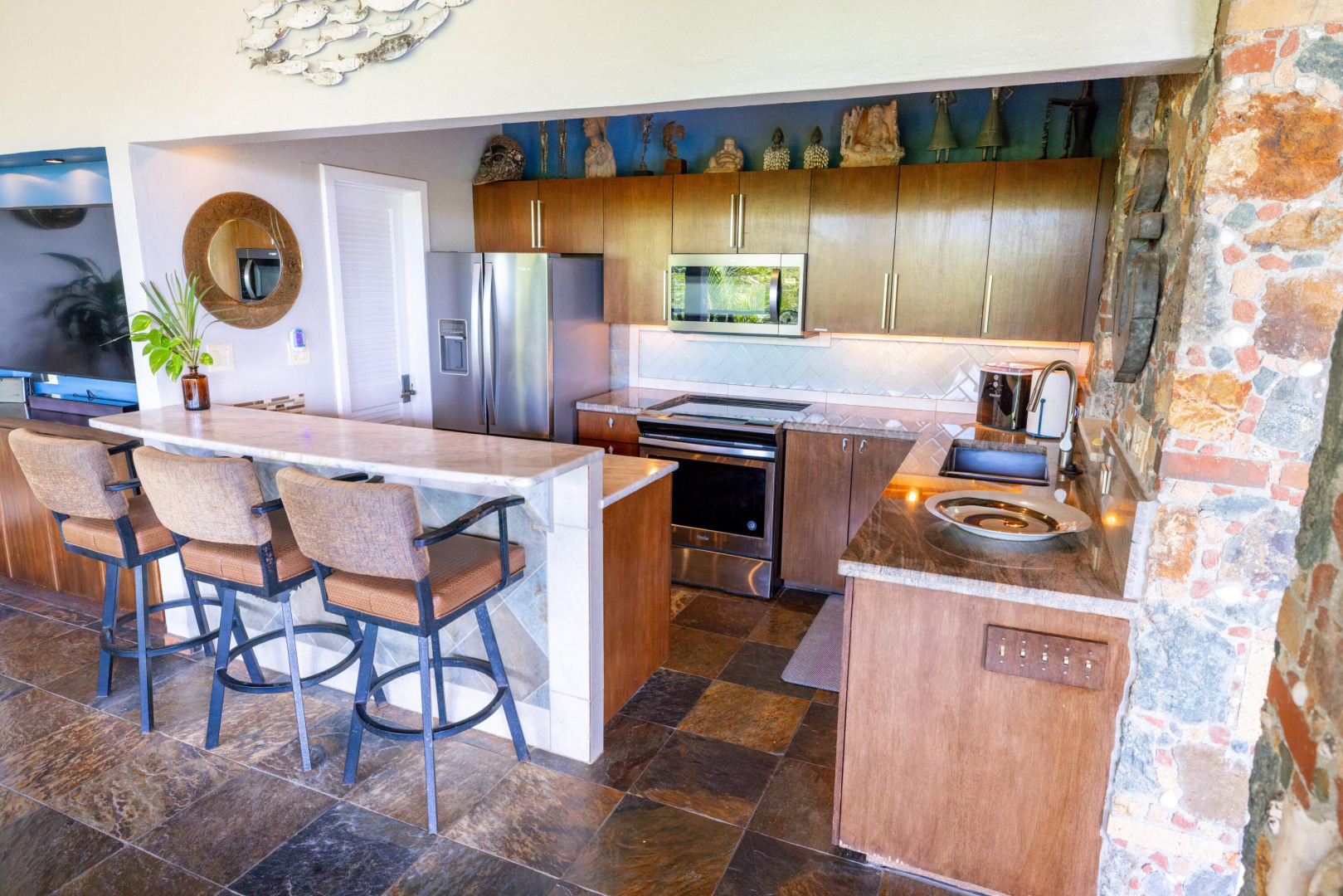 L'Autre Monde (''Another World'') is a breathtaking 6 bedroom, 7.5 bath estate in the prestigious enclave of Estate Great Cruz Bay. With commanding sunset views across the sea to St. Thomas, this private sanctuary is designed for refined island living. Native stone archways, expansive terraces, and multiple pools invite seamless indoor-outdoor connection, while lush landscaping and a gated dual-entry layout ensure serenity and discretion. A covered bridge gracefully links the villa's two wings, each thoughtfully appointed for privacy and comfort, offering flexible living for extended family or guests. Inside, fully air-conditioned spaces include a gourmet kitchen, elegant lounges, and artisan-crafted finishes throughout. Dinghy dock access completes this Caribbean masterpiece.The East Wing, completed in 2004, was built with privacy in mind and features a full chef's kitchen with custom cabinetry, quartz counters, laundry, BBQ area, and pool with a waterfall. The West Wingoriginal structure-extensively renovated, includes a beautiful open-air living area with kitchen, dipping pool, and a zen garden patio for tranquil ambiance. The entire compound is gated, with private entrances and parking. Estate has a calm, spa-like feel throughout, with Bali- and Buddhist-inspired elements enhancing the natural surroundings. Generator, masonry construction, custom mahogany windows/doors, and stonework add to its superior quality.