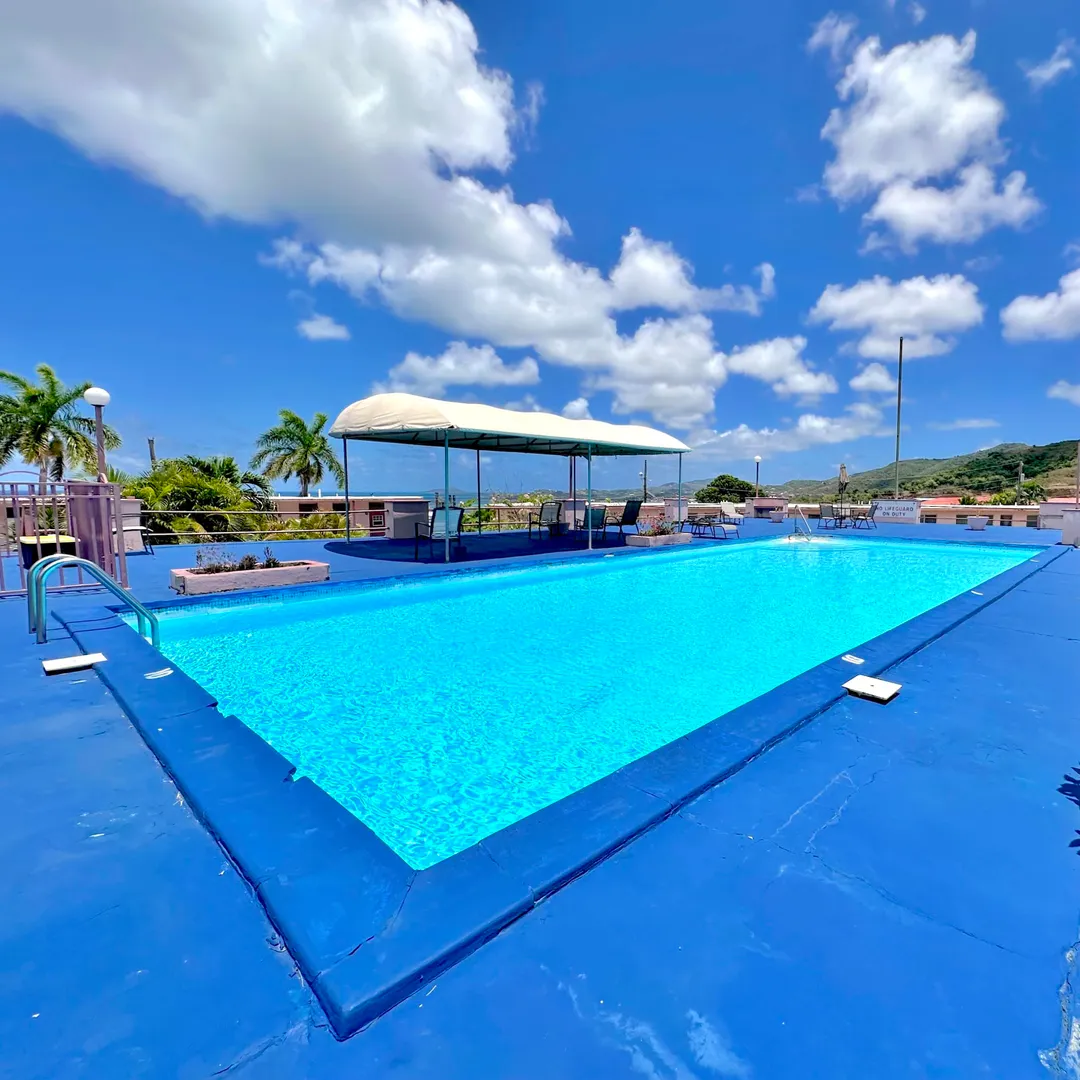 Renovated, turn-key, fully furnished, fully air conditioned 1 BR/1BA upper-level gated condo with sparkling blue swimming pool, gorgeous Buck Island & sea view. Like-new stainless steel appliances, newly tiled bathroom floors, 2 flat screen TVs, desk study, dining table & large A/C bedroom. Coin-operated laundry facility and condo office on property. Fully furnished, move-in ready unit just minutes to Christiansted town, restaurants, beaches, grocery stores & more!