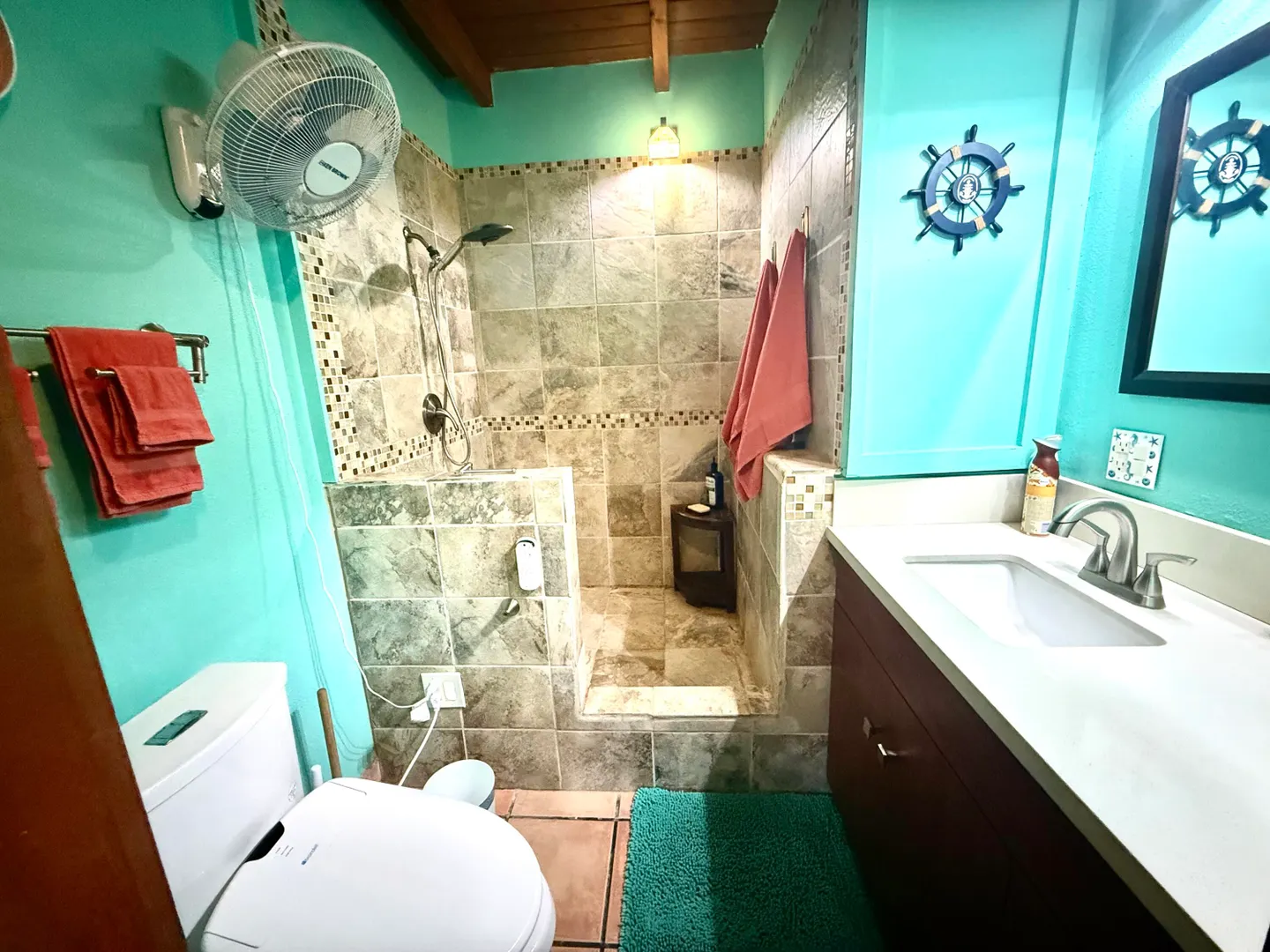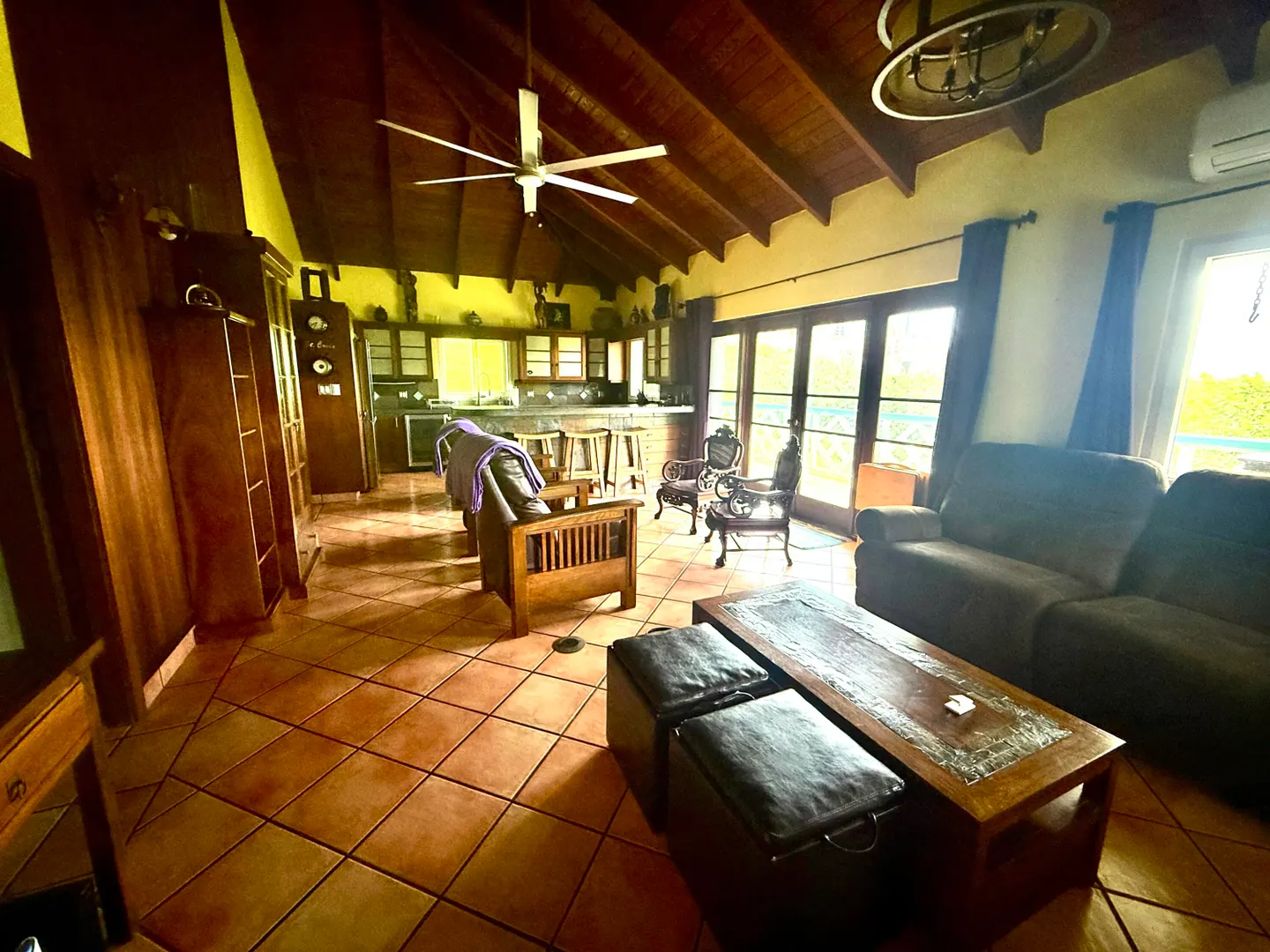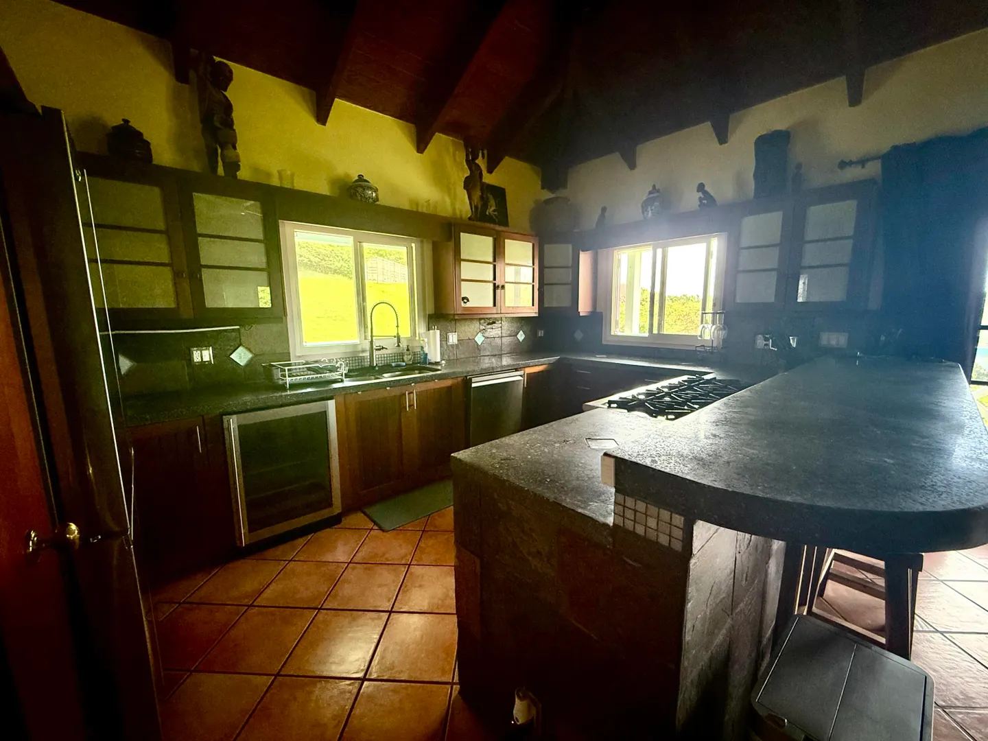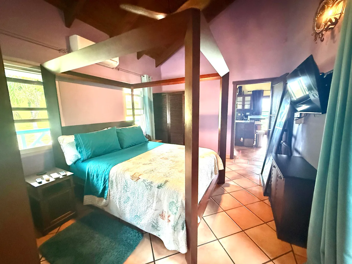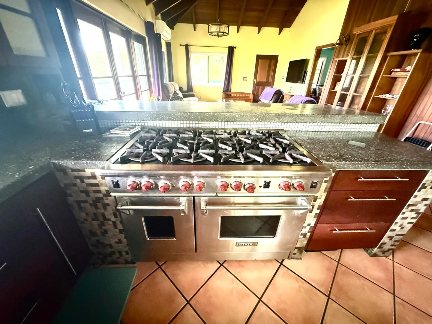 Embrace the beauty of the Caribbean in this upper-level home, offering sea views and an array of high-end amenities. Open concept living/kitchen area (with AC or enjoy the fresh air) that seamlessly connects to a wraparound deck. The gourmet kitchen boasts a Wolf gas stove, wine fridge, dishwasher, refrigerator, plus a gas grill on deck--ideal for home chefs. The two generously sized bedrooms with Split AC's provide comfort and tranquility, each complemented by a modern, well-appointed bathroom. Home has solar power with battery backup plus WAPA included up to $50/month and includes VIYA internet. Up to 2 animals allowed with deposit.