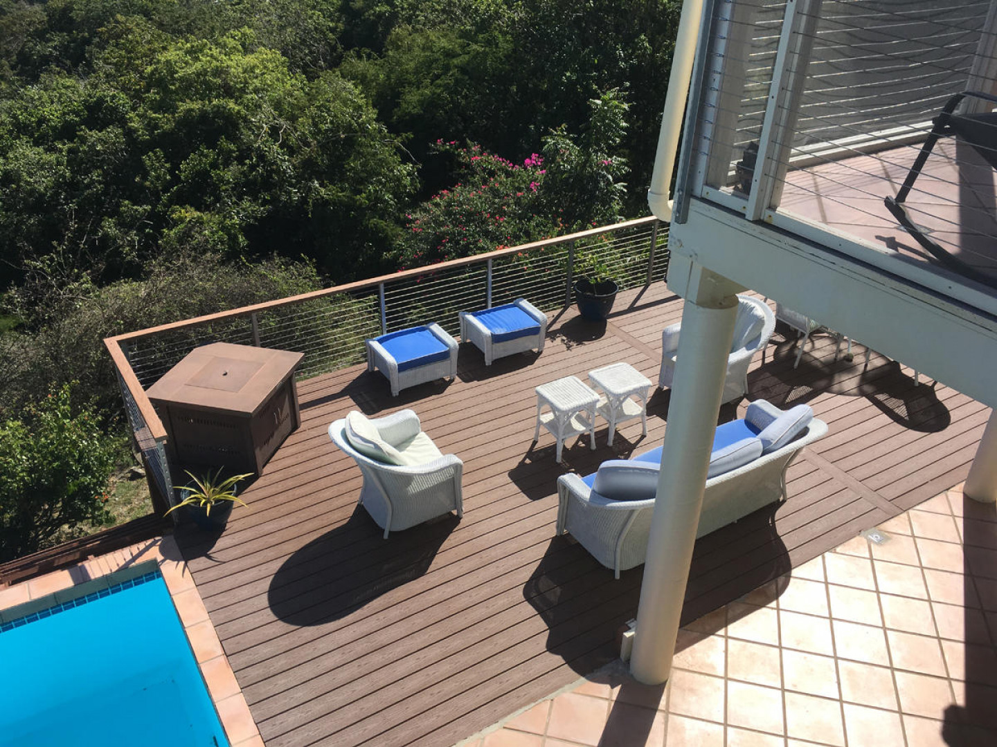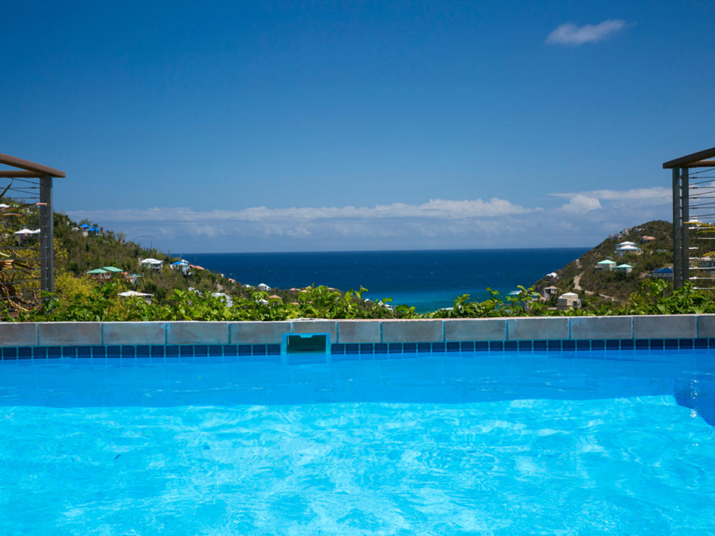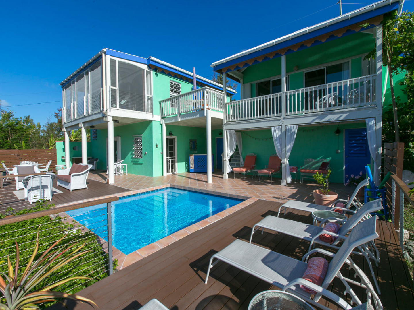 'Caribbean Colors' is a recently renovated all masonry home in upscale Chocolate Hole North. Motivated sellers. Features include a large pool deck, native stone arches, and an interior staircase to lower bedrooms. It faces southeast to catch the tradewind breezes, sun and moon rises and water views of Chocolate Hole, Hart Bay and the South Shore.Just minutes from Cruz Bay and a short walk to the Westin Resort. There are many custom features such as tile floors inlaid with Mexican accent tiles, mahogany trim, hand painted bathroom sinks, and vaulted cypress ceilings. The covered, screened gallery is wonderfully cool and breezy. Other features include brand new custom kitchen, professional colorful landscaping, fruit trees, fire pit and storm shutters.