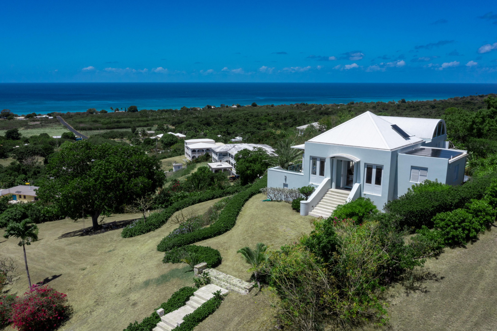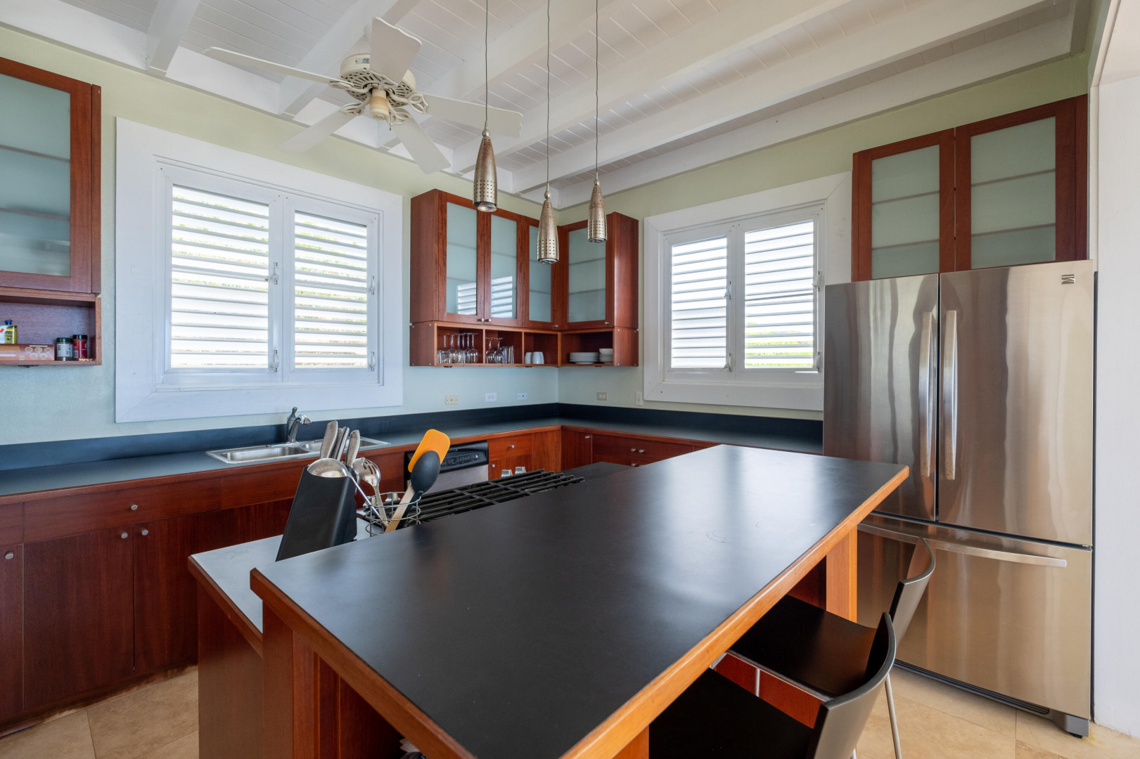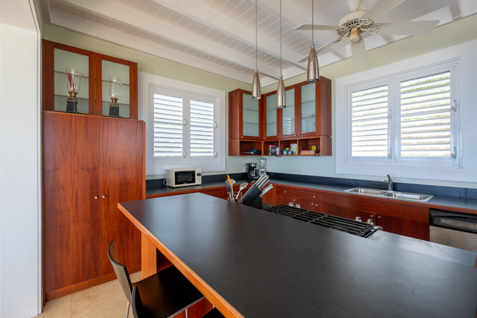 Welcome to your own personal paradise on St. Croix! This stunning one-bedroom house with a full guest suite, designed by local architect Hortensia Lanio, boasts a unique and stylish aesthetic that blends modern luxury with Caribbean charm. The main living area features cathedral ceilings, creating a spacious and open atmosphere. Custom Mahogany built-ins add elegance and functionality to the living space, while the designer kitchen with custom cabinetry provides ample space for all your culinary needs.The master bedroom features a barrel vaulted ceiling, adding architectural interest and plenty of natural light. The shower is uniquely designed to open to the outdoors, providing an invigorating and refreshing experience.