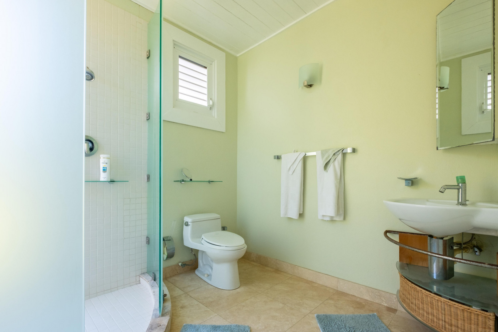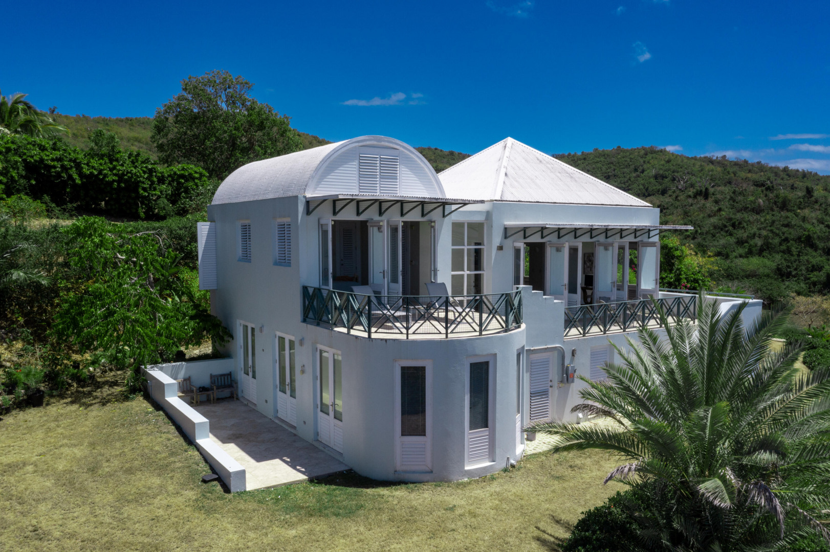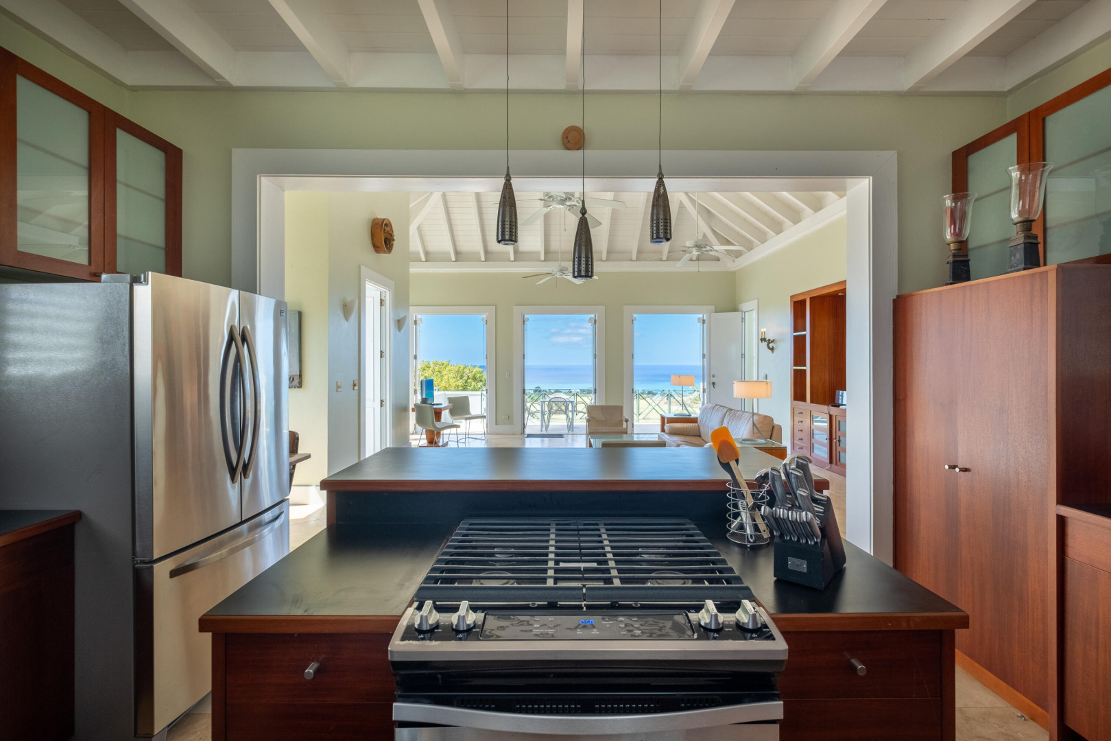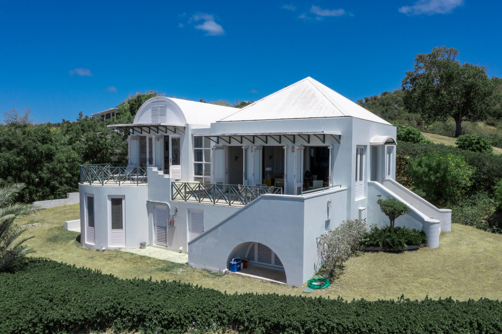 Welcome to your own personal paradise on St. Croix! This stunning one-bedroom house with a full guest suite, designed by local architect Hortensia Lanio, boasts a unique and stylish aesthetic that blends modern luxury with Caribbean charm. The main living area features cathedral ceilings, creating a spacious and open atmosphere. Custom Mahogany built-ins add elegance and functionality to the living space, while the designer kitchen with custom cabinetry provides ample space for all your culinary needs.The master bedroom features a barrel vaulted ceiling, adding architectural interest and plenty of natural light. The shower is uniquely designed to open to the outdoors, providing an invigorating and refreshing experience.