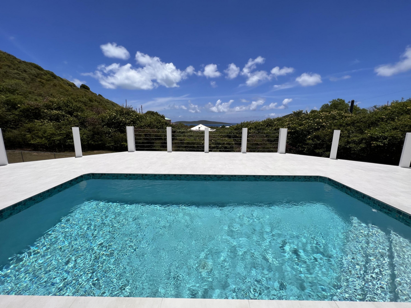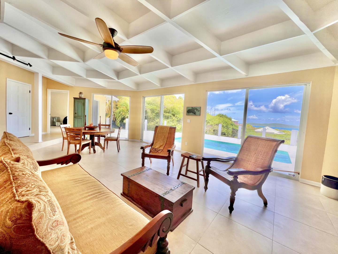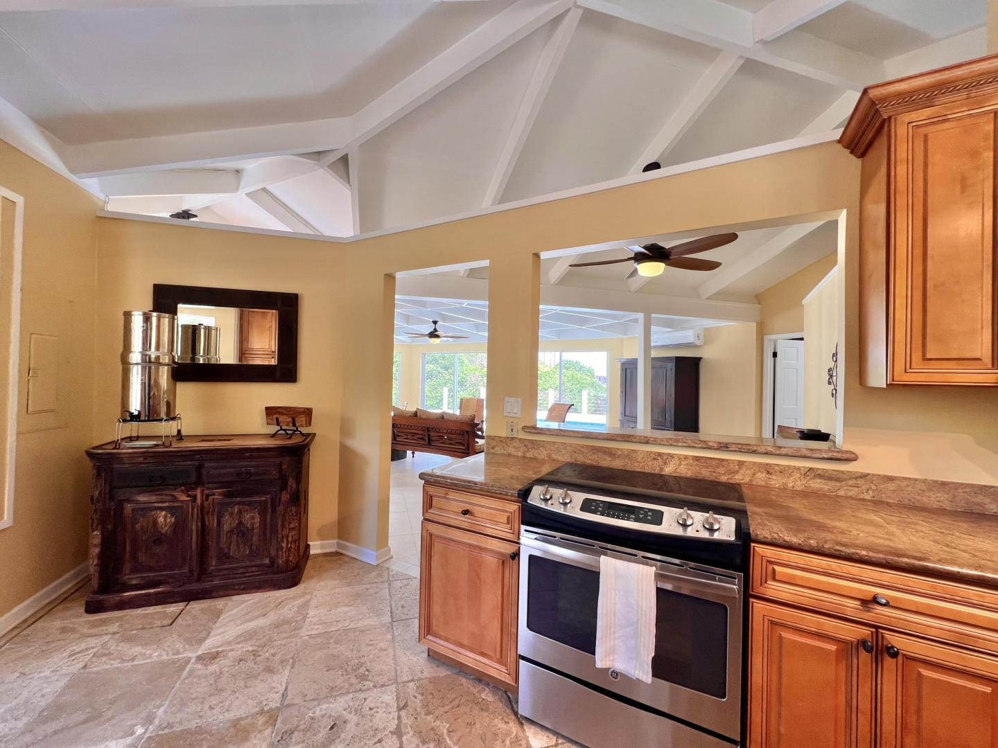 Discover the ultimate Caribbean retreat at Coral Reef Villa, a stunning three-bedroom, two and a half-bath home with SOLAR net-metering, a pool and a one-bedroom recently renovated apartment. Located on the east end with straight-on Buck Island views and a refreshing salt-water swimming pool, this move-in ready villa embodies the very essence of Caribbean living, complete with high-quality finishes and expert craftsmanship throughout. The V-shaped design seamlessly connects indoor and outdoor living spaces, immersing you in spectacular views from every angle. All bedrooms are situated under one roof, framing the living room and newly poured concrete pool deck. Step into the beautiful kitchen complete with Italia granite countertops, stainless steel appliances, and custom cabinetry.