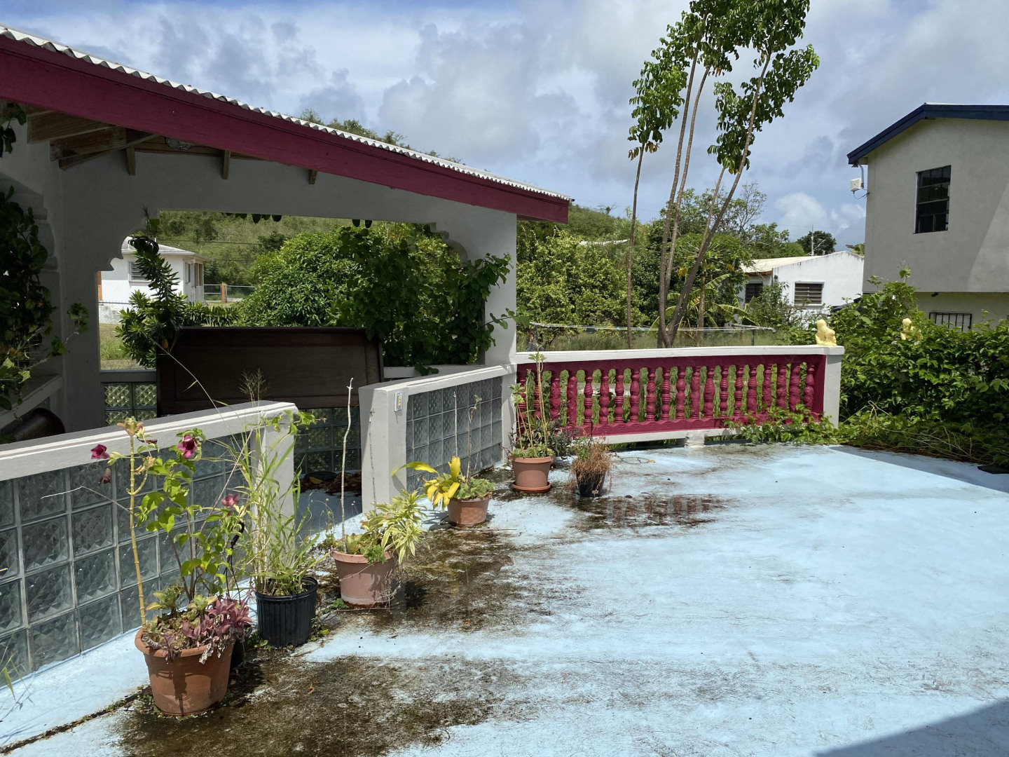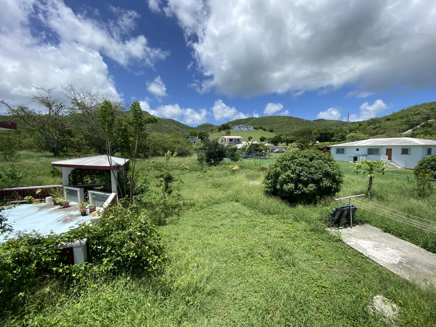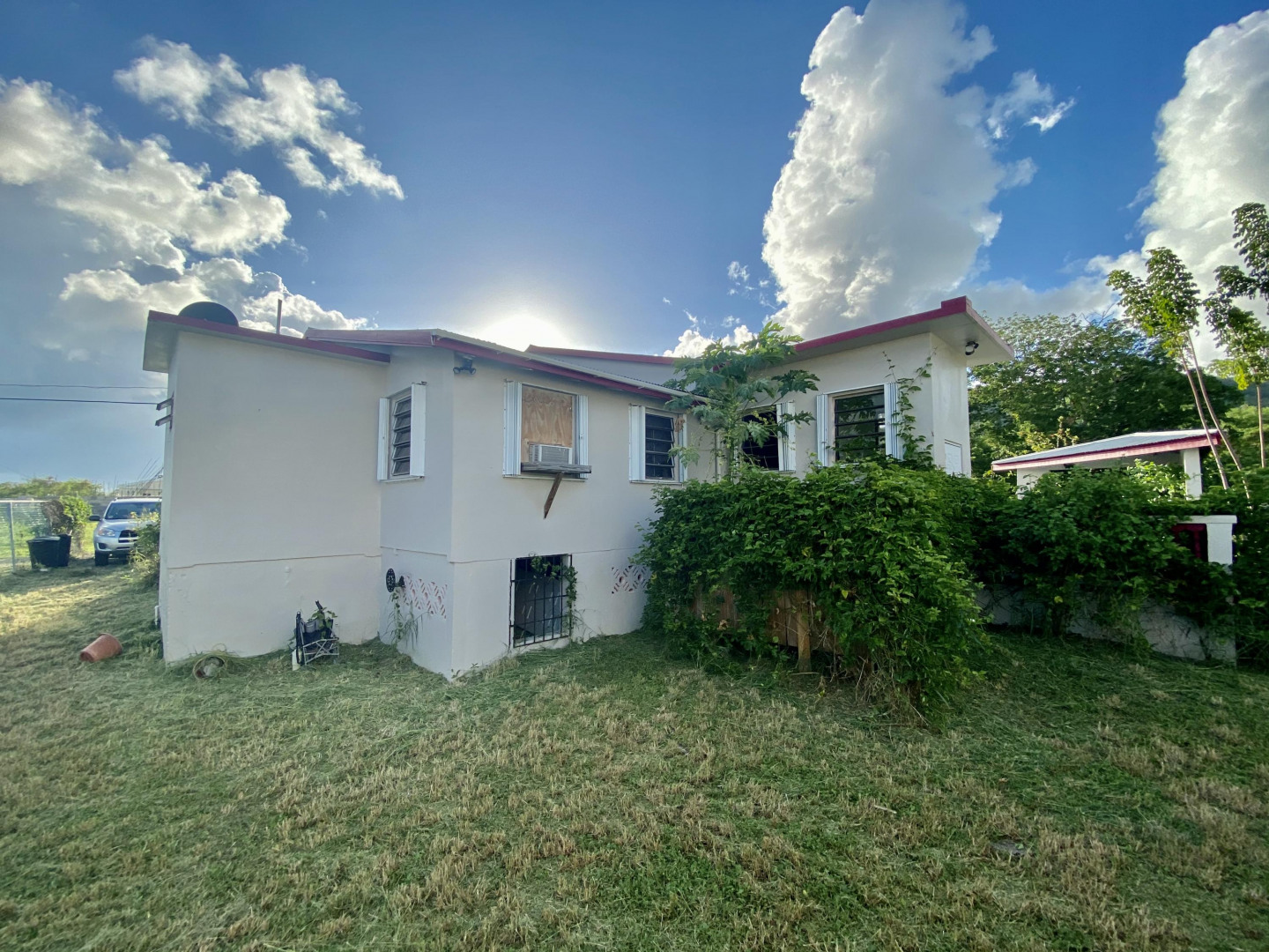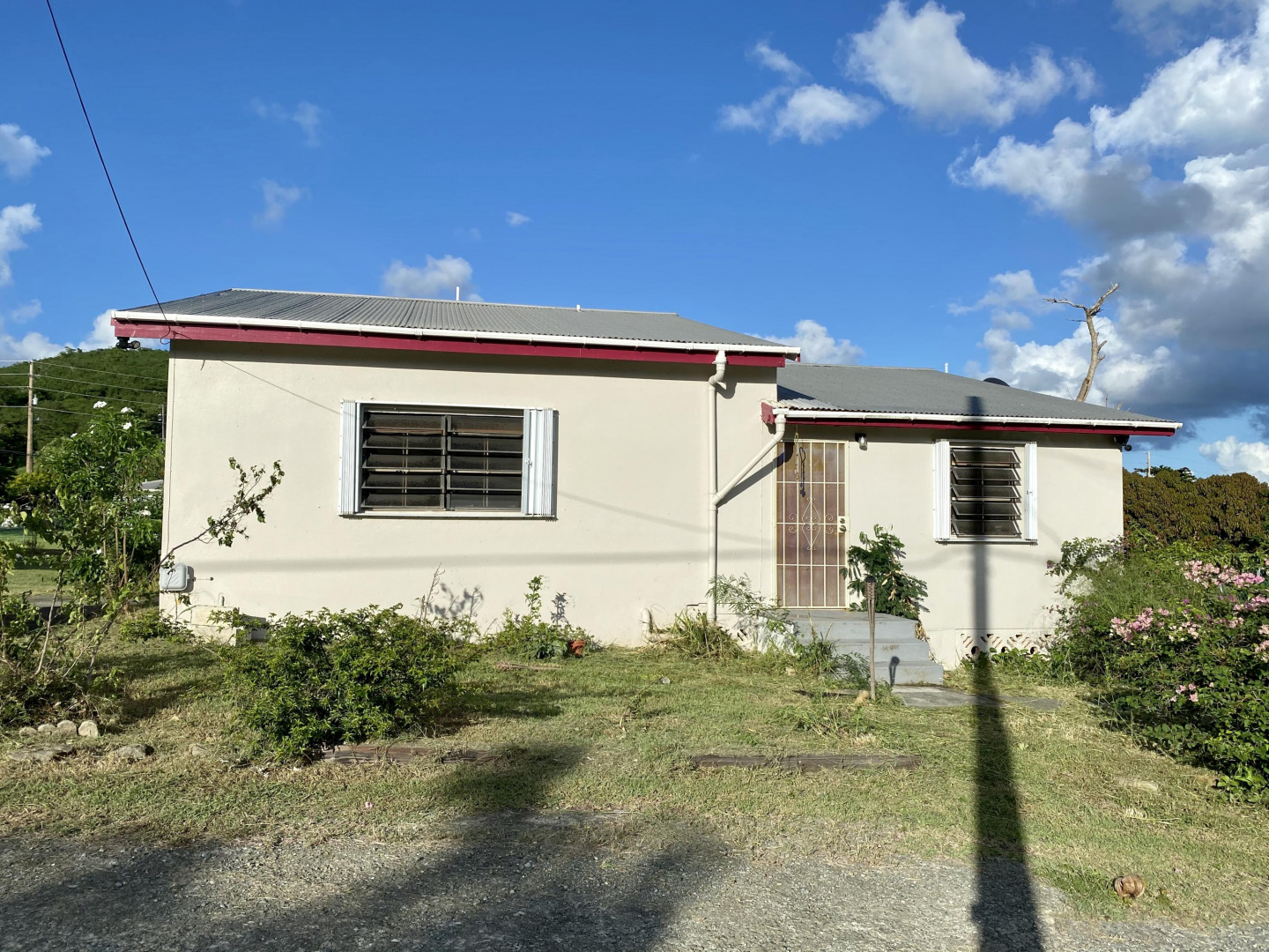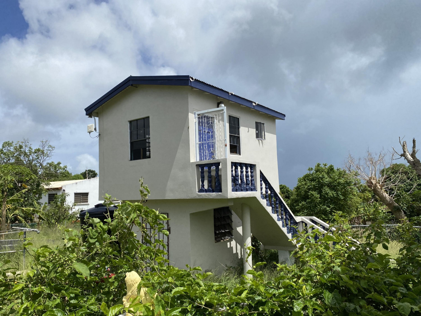Solidly built three bedroom two bath home with small ''out building'' that houses a laundry/storage area on lower level, and bedroom and bath on upper level with peek a boo sea view. The primary bedroom has an ensuite bath, large closet with extra storage above, plus an added ''nook''. Two other bedrooms share a bath. There's a spiral staircase down to a large room currently used as a recording studio, but perfect for a family room/workshop. There's a spacious gallery surrounded by a yard full of plants, shrubs and fruit trees. An added bonus is a refurbished well to provide water for the landscaping. Nice neighborhood and close to Centerline Rd. to zip to Frederiksted or Sunny Isle!