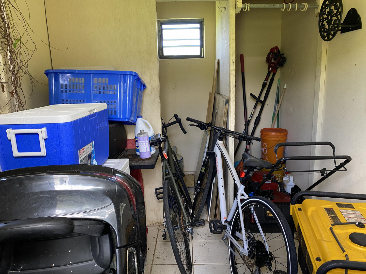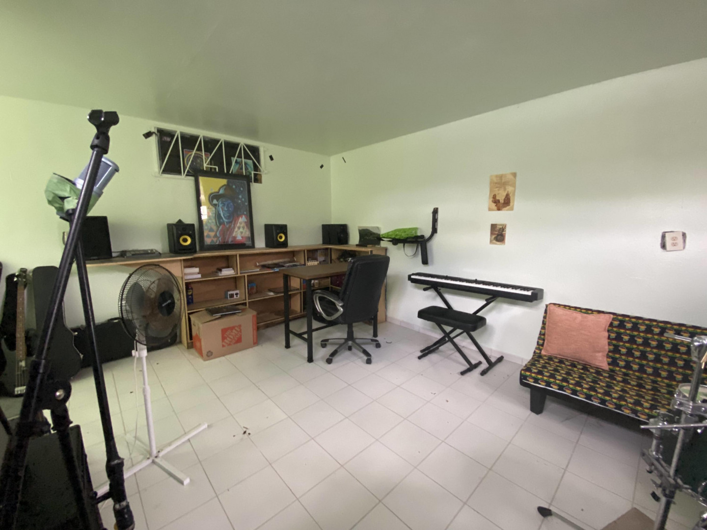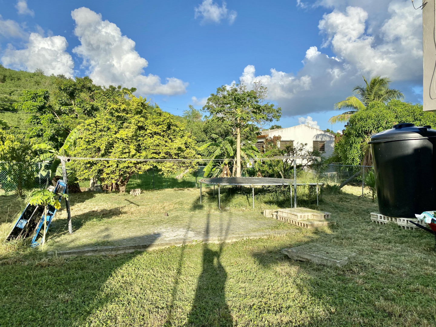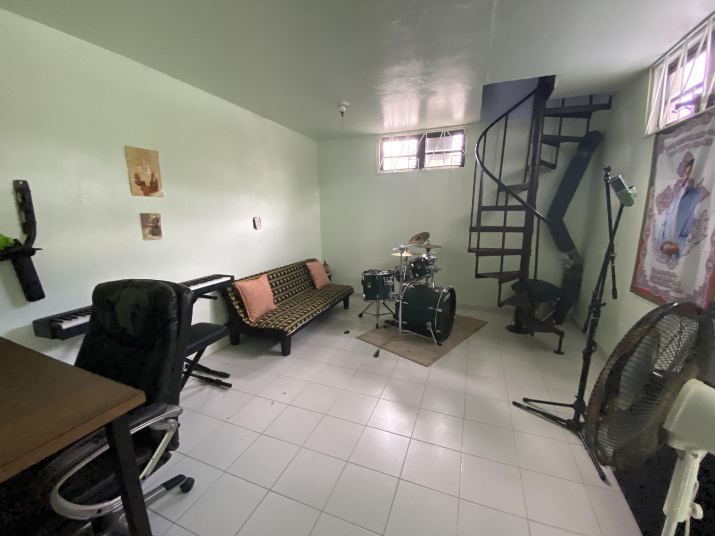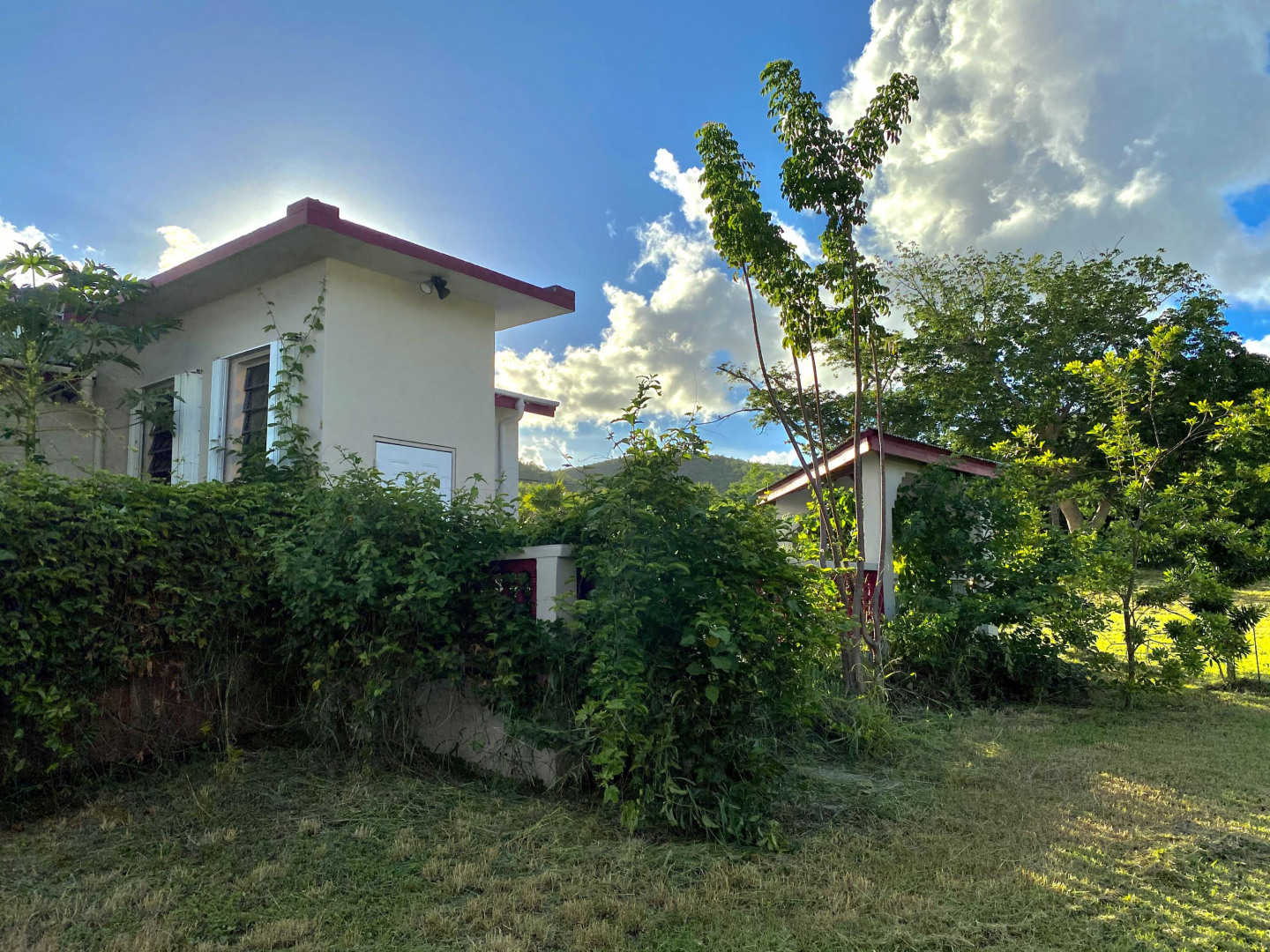 Solidly built three bedroom two bath home with small ''out building'' that houses a laundry/storage area on lower level, and bedroom and bath on upper level with peek a boo sea view. The primary bedroom has an ensuite bath, large closet with extra storage above, plus an added ''nook''. Two other bedrooms share a bath. There's a spiral staircase down to a large room currently used as a recording studio, but perfect for a family room/workshop. There's a spacious gallery surrounded by a yard full of plants, shrubs and fruit trees. An added bonus is a refurbished well to provide water for the landscaping. Nice neighborhood and close to Centerline Rd. to zip to Frederiksted or Sunny Isle!