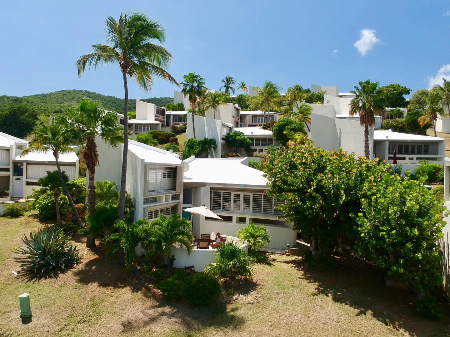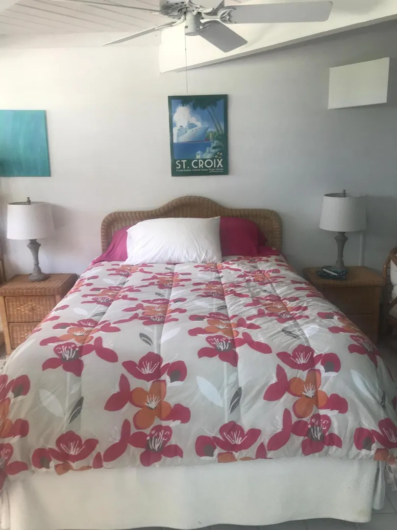 Best location at the Reef! Right on the 9th hole. One of the only Free standing units. Beautiful Caribbean view of Buck Island. New windows, updated kitchen, 2 masters with updated bathrooms. Also has a patio and an atrium for outdoor living. Mitsubishi AC splits throughout. Resort style complex with hilltop pool, tennis courts, white sandy beach and exercise room. Accordion hurricane shutters. Great vacation rental history.