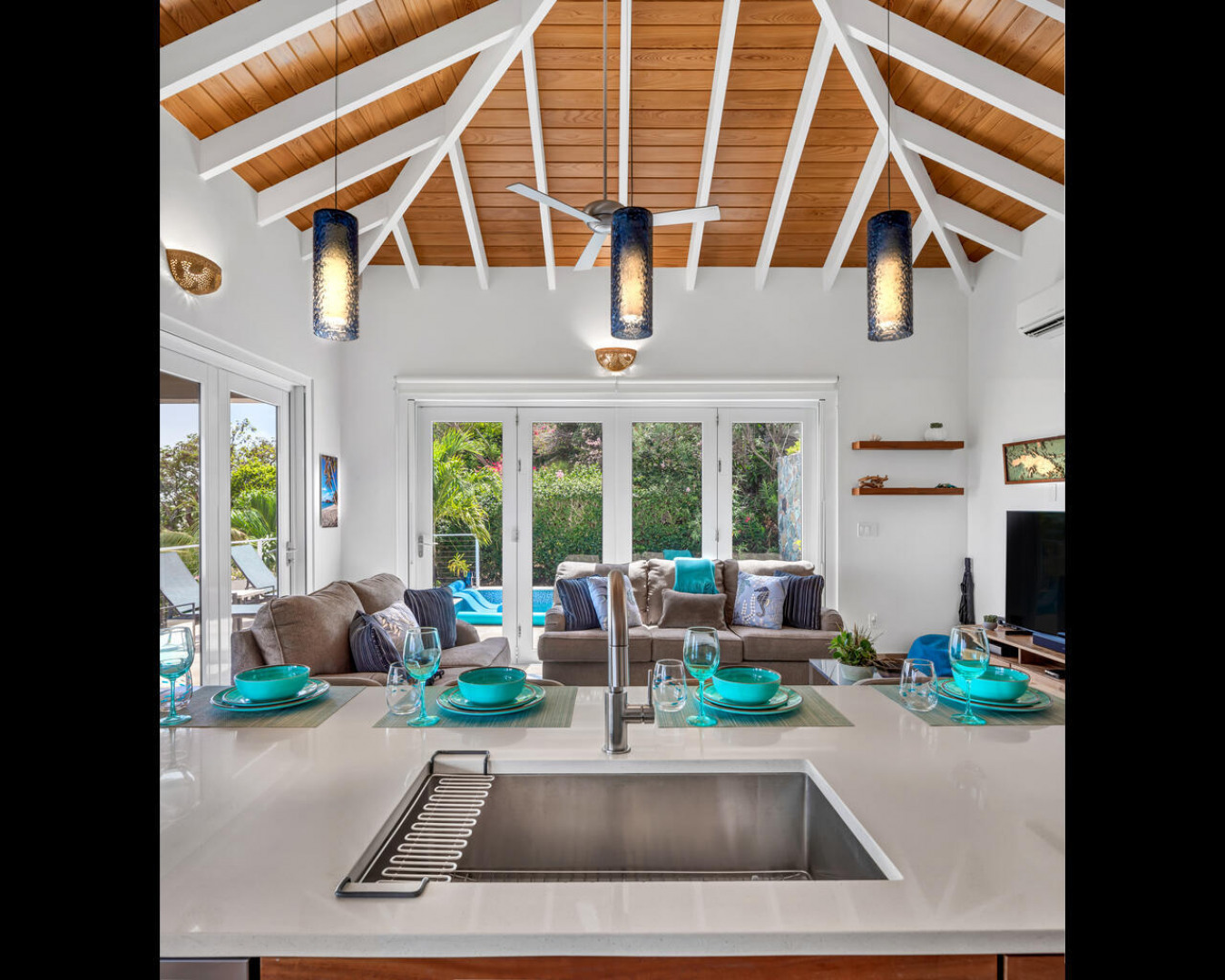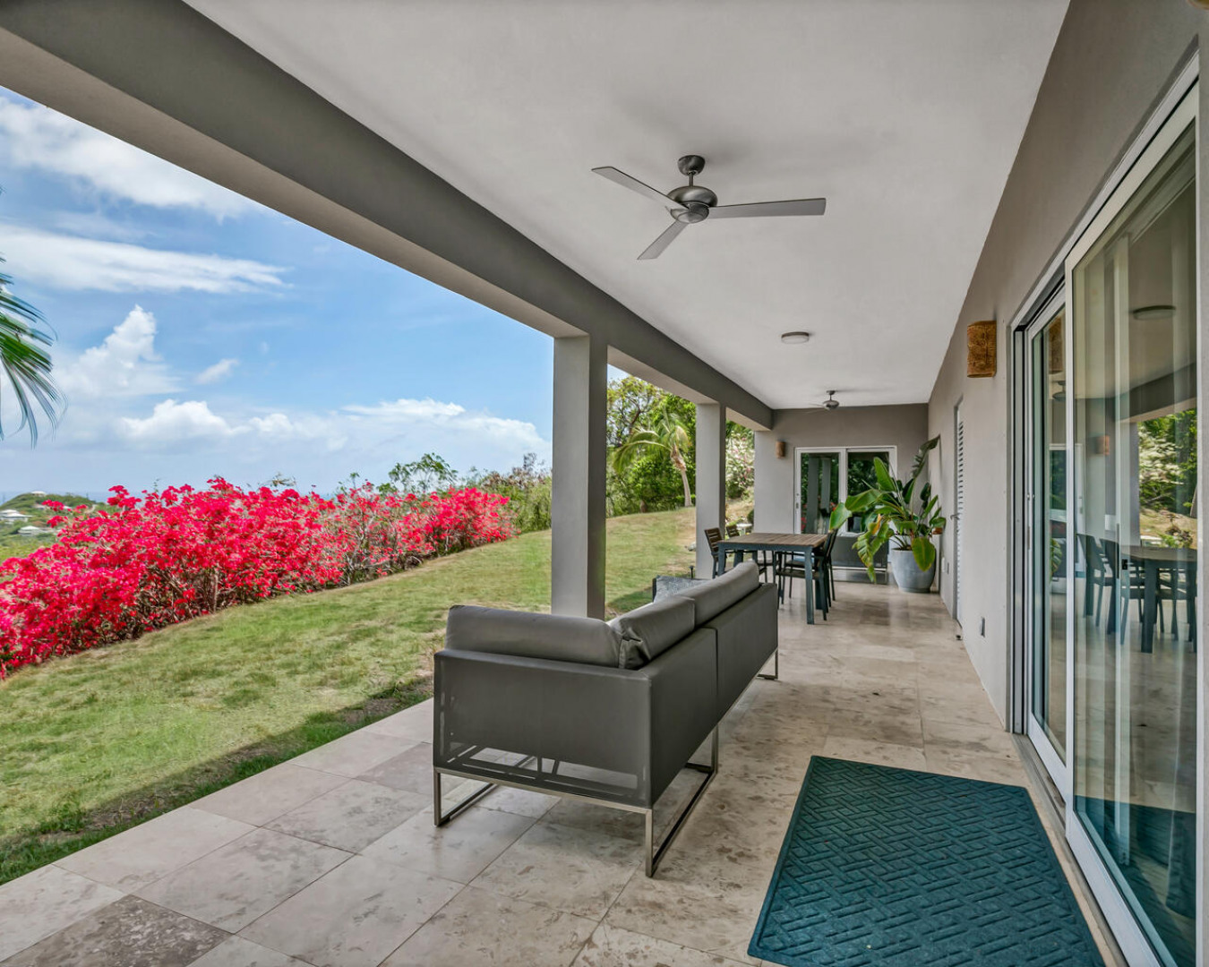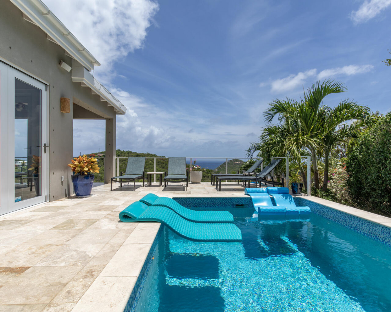 Layin' Lowe is a very popular Contemporary styled rental villa sited on a beautifully landscaped grassy knoll in Chocolate Hole North. this villa's sleek design features multi-folding doors to provide a seamless flow from indoor to outdoor living. The open layout ensures that from each air conditioned room, you can enjoy beautiful views of the Caribbean Sea. Featuring high end finishes of Travertine tile floors, Caeserstone quartz countertops and custom mahogany cabinetry. A bonus is a Solar system with battery backup ensuring no power interruptions and zero to low power bills. Additional items include; laundry facilities on both levels, UV water filtration, cistern level monitoring, impact glass doors and custom designed hurricane shutter/screening system.
