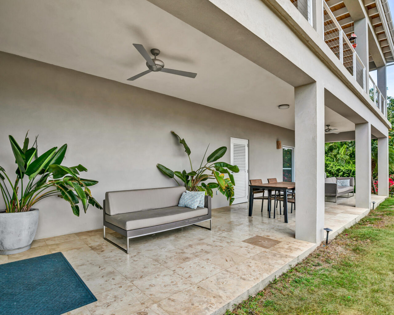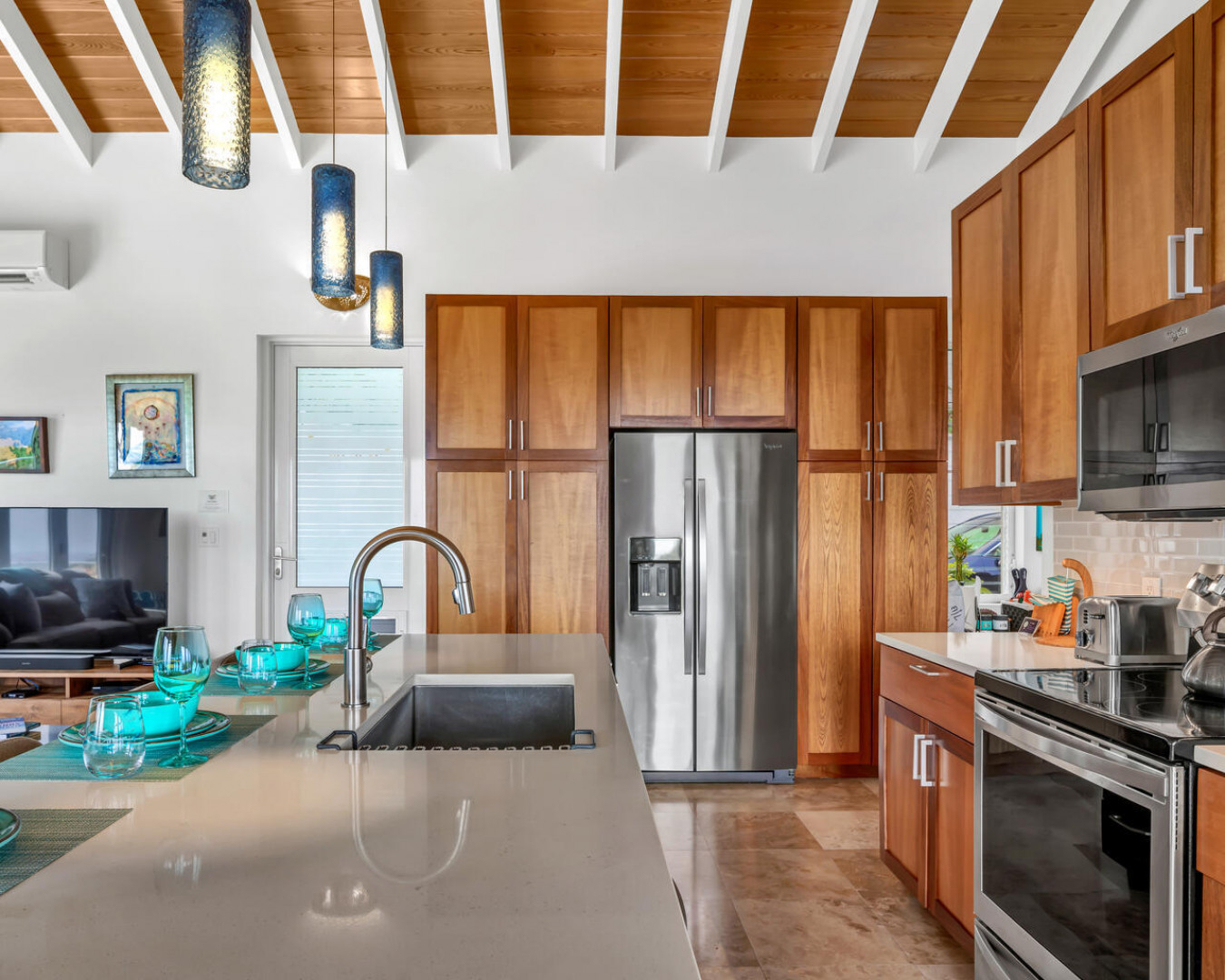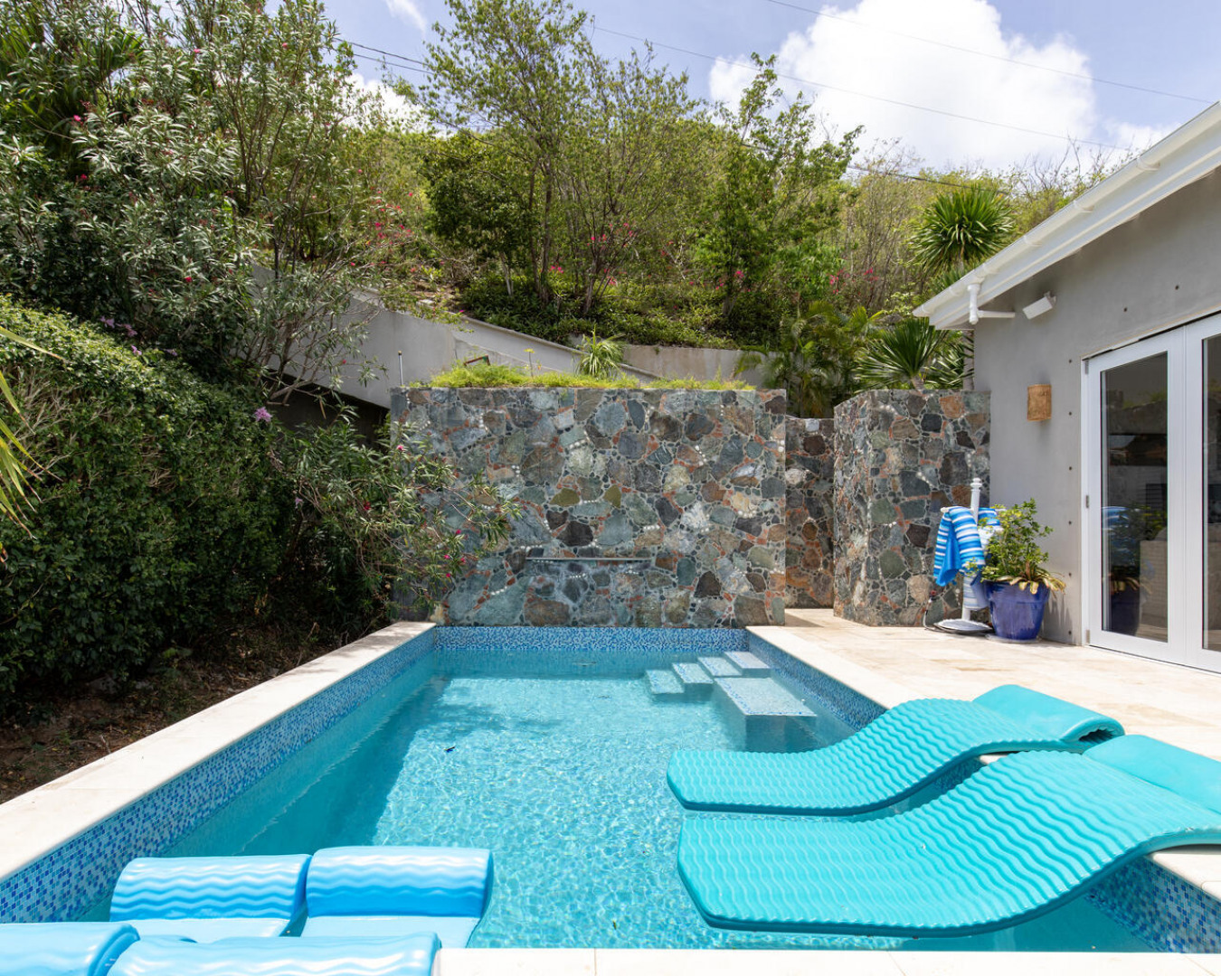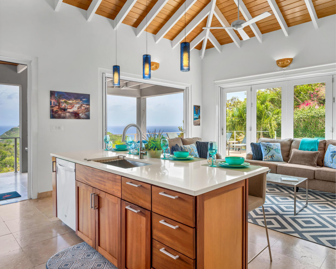 Layin' Lowe is a very popular Contemporary styled rental villa sited on a beautifully landscaped grassy knoll in Chocolate Hole North. this villa's sleek design features multi-folding doors to provide a seamless flow from indoor to outdoor living. The open layout ensures that from each air conditioned room, you can enjoy beautiful views of the Caribbean Sea. Featuring high end finishes of Travertine tile floors, Caeserstone quartz countertops and custom mahogany cabinetry. A bonus is a Solar system with battery backup ensuring no power interruptions and zero to low power bills. Additional items include; laundry facilities on both levels, UV water filtration, cistern level monitoring, impact glass doors and custom designed hurricane shutter/screening system.