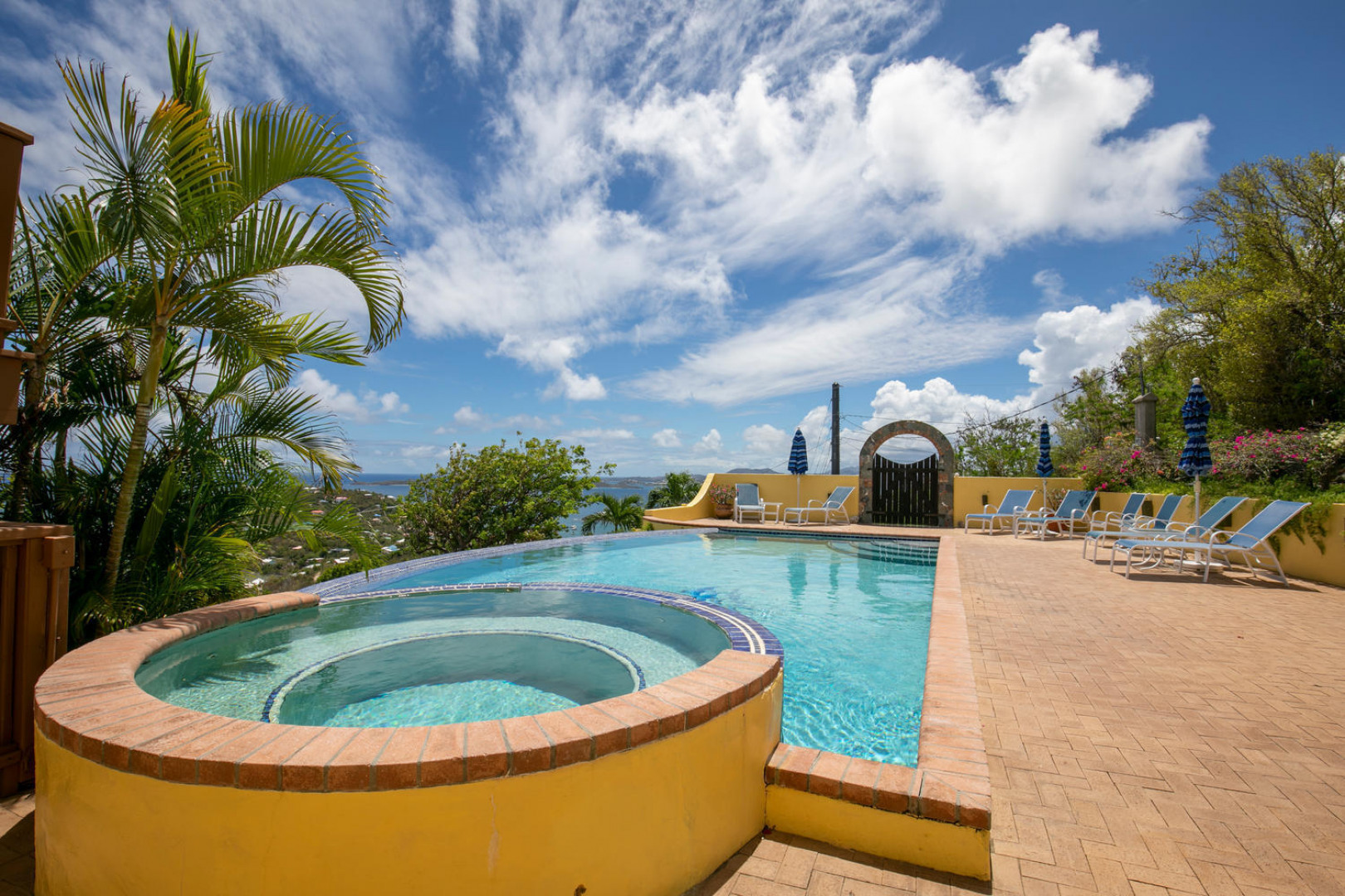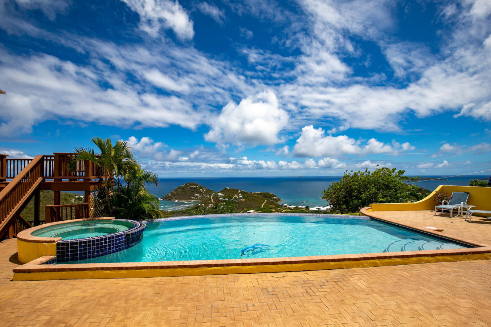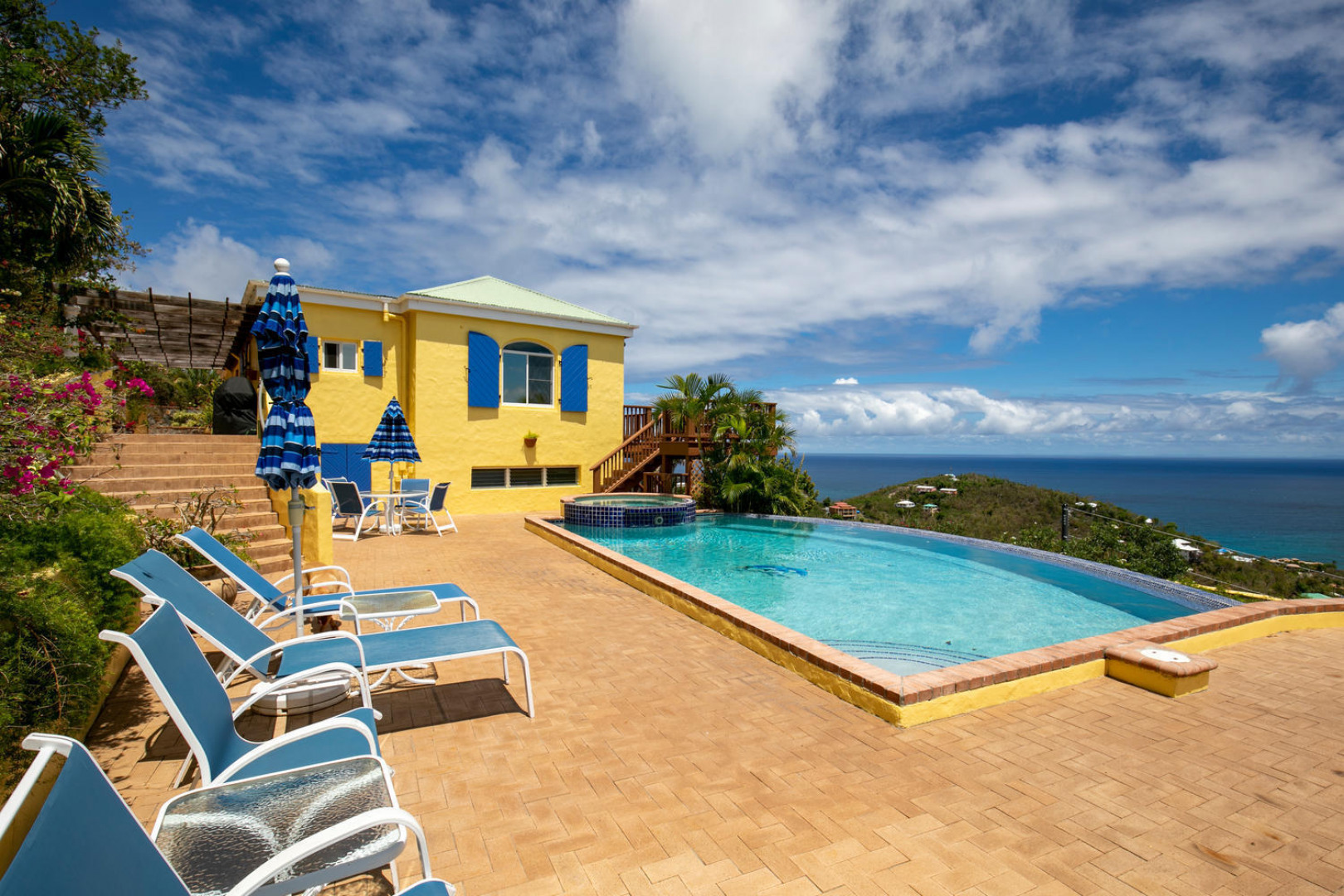 La Papaya is perched on a knoll in Chocolate Hole North to take advantage of expansive views from Ditleff Point to St. Thomas. Between the upper and lower level of the villa is the large brick paved pool patio with lovely curved edge pool and elevated jacuzzi with waterfall. Upstairs is a great room with kitchen, dining and living areas flanked by a large master suite at the east and guest bedroom with jetted tub at the west. Downstairs is a third guest suite as well as a small apartment with 2 small bedrooms. Each area opens onto covered and open porches and decks. Professionally landscaped with flowering plants and trees, a grassy lawn and fruit trees.
