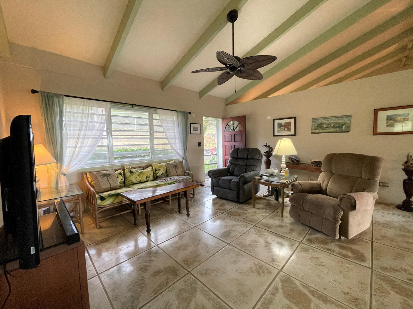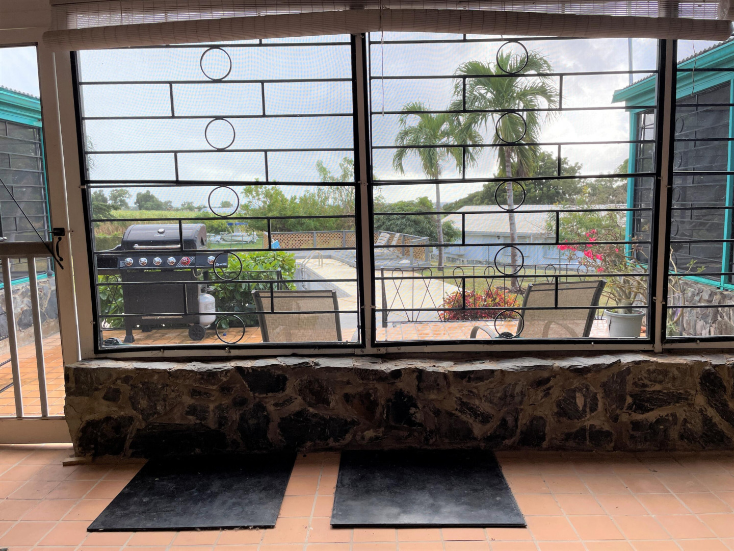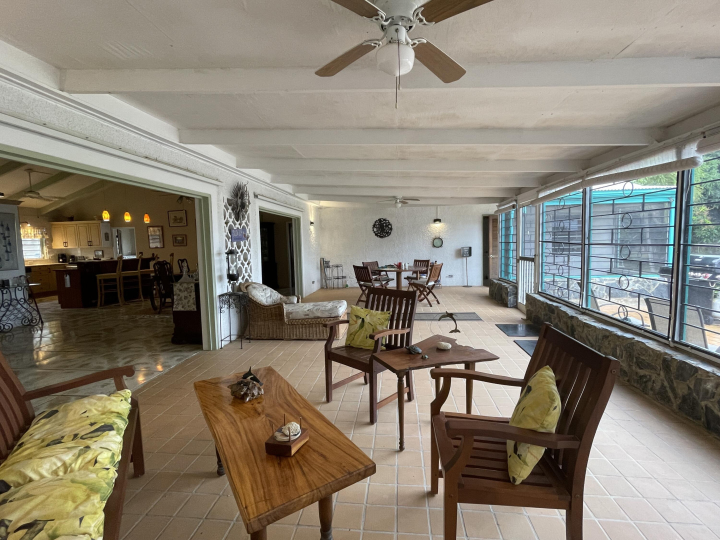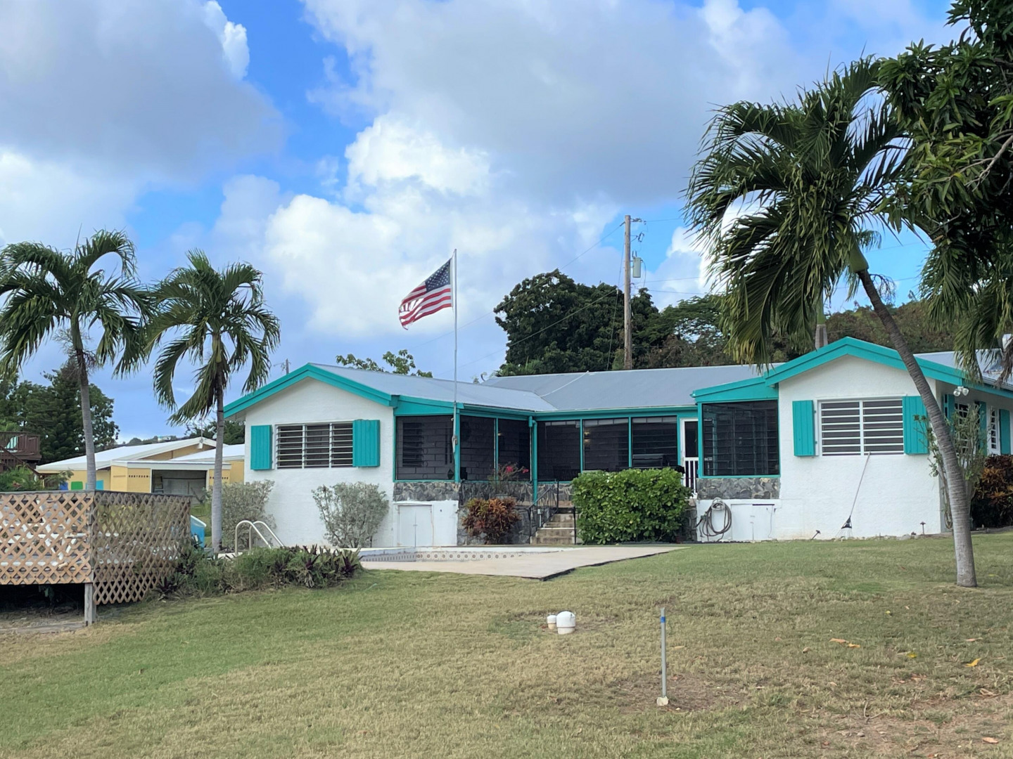 Large open living spaces make this lovely home comfortable and inviting. Located in the Prosperity neighborhood across the road from Rainbow Beach, the nice, fenced yard, pool and sea view offer lots of options for those who love the water and enjoy the beautiful West End beaches. Inside, the large veranda has been screened and secured to be fully appreciated as living space. Vaulted ceilings and fans throughout complement the cool sea breezes. Four bedrooms offer flexibility. Plenty space for a large family, or enjoy the sea view from the large master bedroom and convert extra bedrooms into office, studio or play space. Tool shed, solar hot water, security bars in windows, two cisterns, fruit trees, and a large whole house generator add to the comfort and security of this beautiful home.