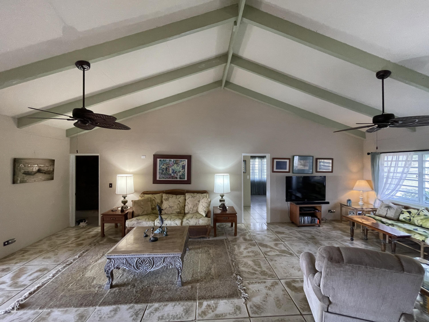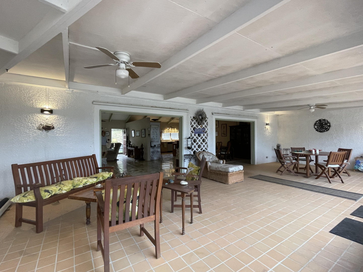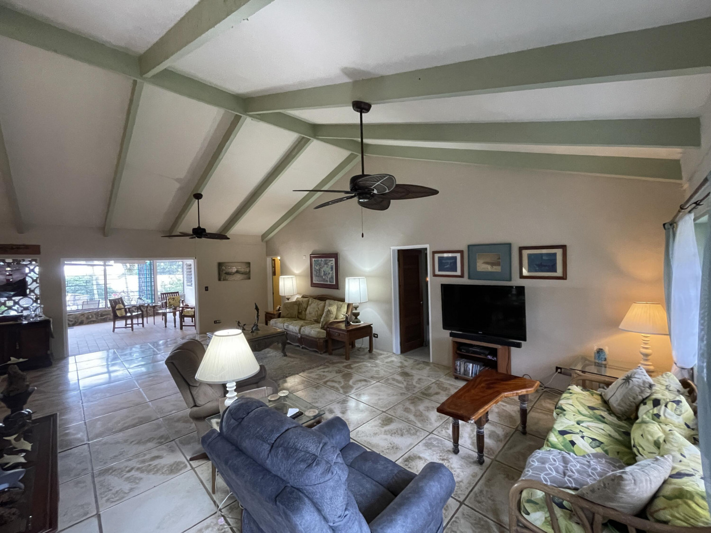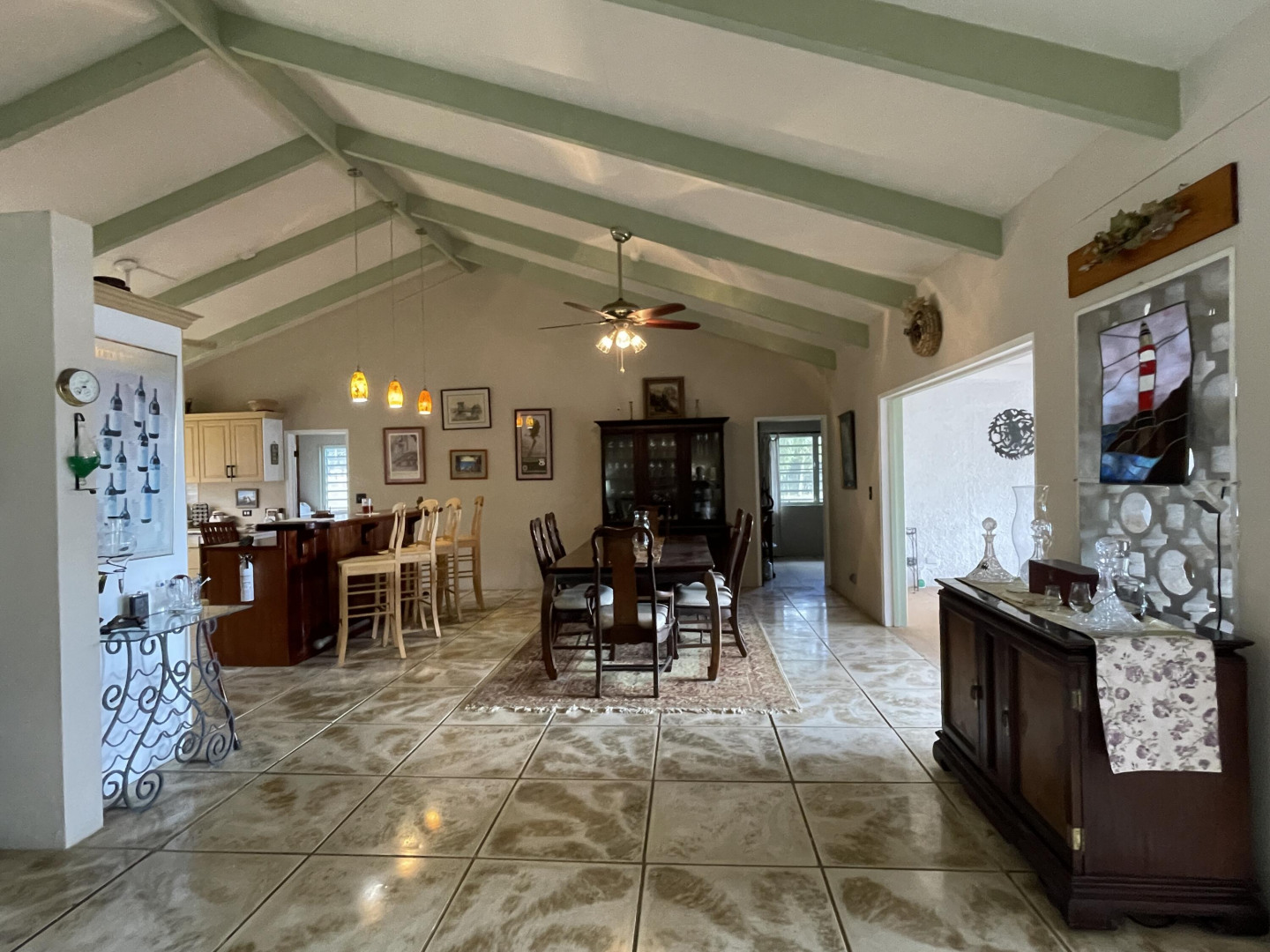 Large open living spaces make this lovely home comfortable and inviting. Located in the Prosperity neighborhood across the road from Rainbow Beach, the nice, fenced yard, pool and sea view offer lots of options for those who love the water and enjoy the beautiful West End beaches. Inside, the large veranda has been screened and secured to be fully appreciated as living space. Vaulted ceilings and fans throughout complement the cool sea breezes. Four bedrooms offer flexibility. Plenty space for a large family, or enjoy the sea view from the large master bedroom and convert extra bedrooms into office, studio or play space. Tool shed, solar hot water, security bars in windows, two cisterns, fruit trees, and a large whole house generator add to the comfort and security of this beautiful home.