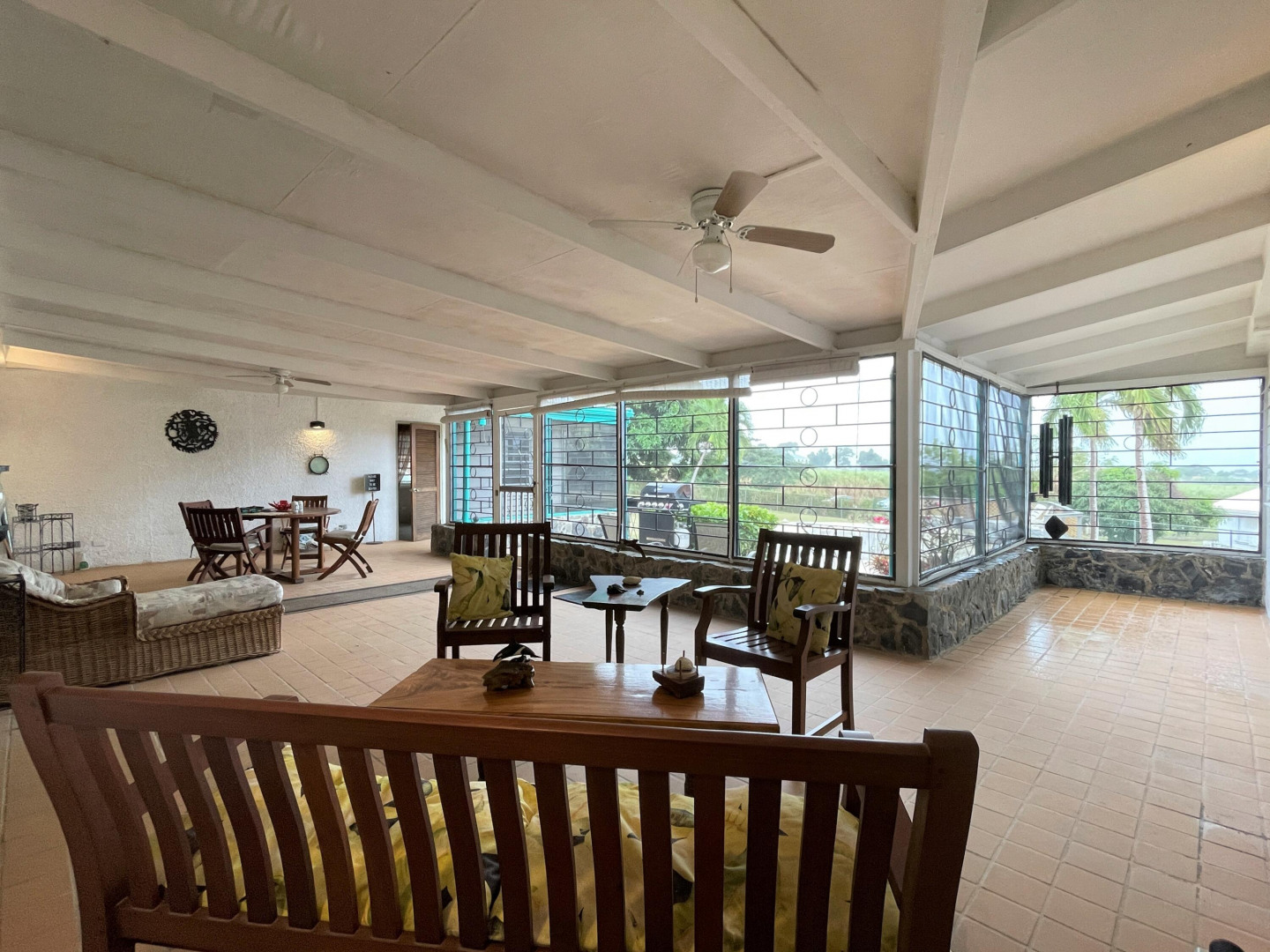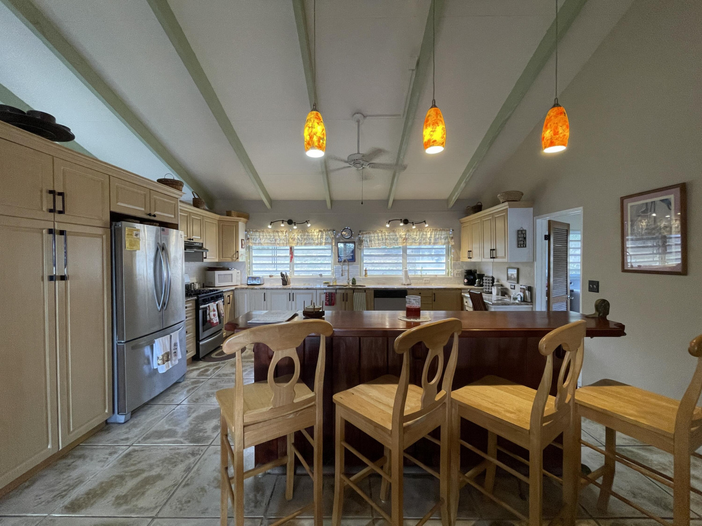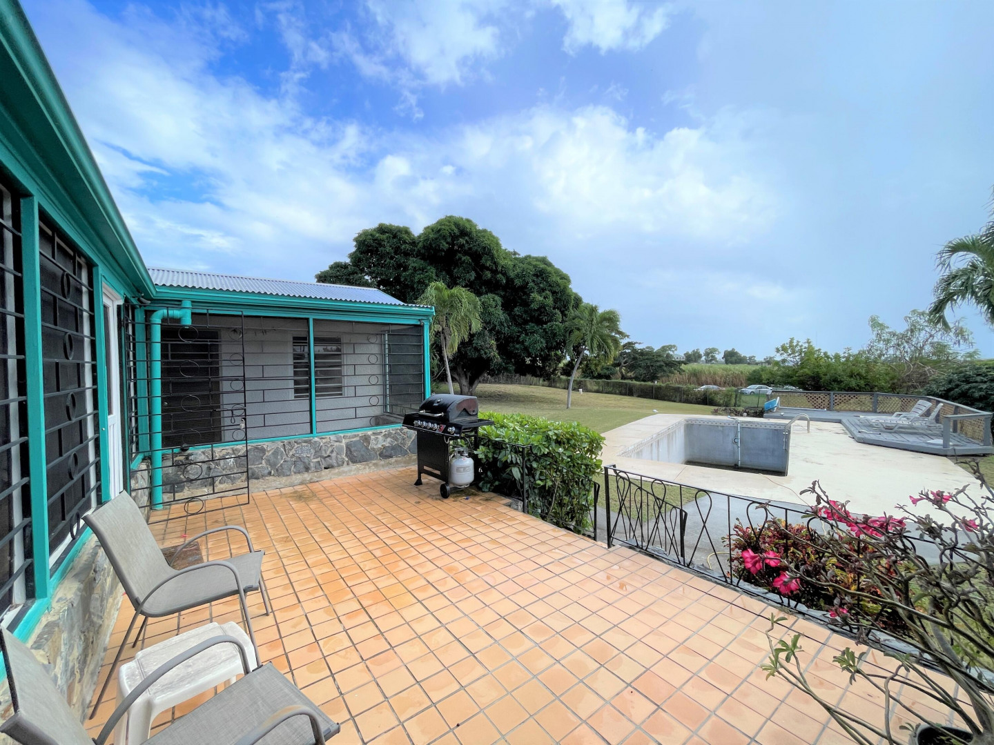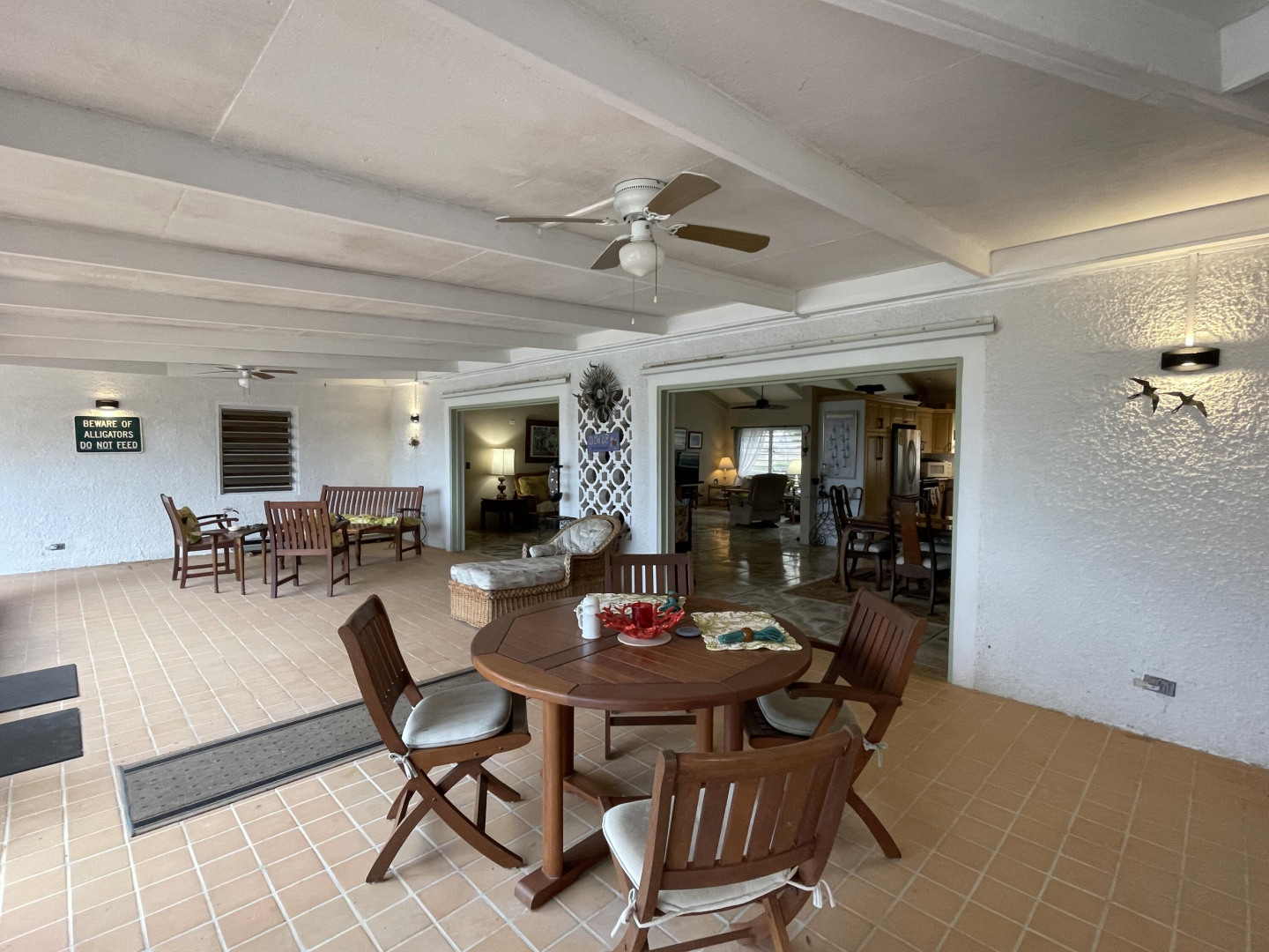 Large open living spaces make this lovely home comfortable and inviting. Located in the Prosperity neighborhood across the road from Rainbow Beach, the nice, fenced yard, pool and sea view offer lots of options for those who love the water and enjoy the beautiful West End beaches. Inside, the large veranda has been screened and secured to be fully appreciated as living space. Vaulted ceilings and fans throughout complement the cool sea breezes. Four bedrooms offer flexibility. Plenty space for a large family, or enjoy the sea view from the large master bedroom and convert extra bedrooms into office, studio or play space. Tool shed, solar hot water, security bars in windows, two cisterns, fruit trees, and a large whole house generator add to the comfort and security of this beautiful home.