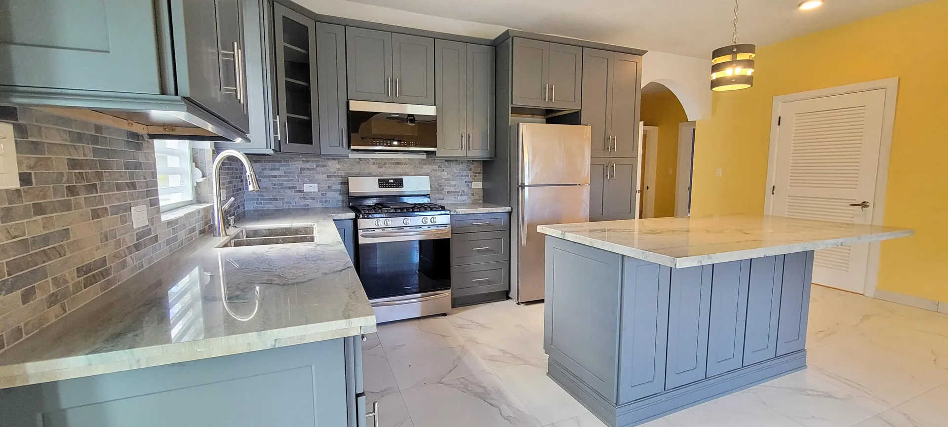 This BRAND NEW - never been lived in airy downstairs home - 3 bedrooms and 2 bathrooms. The kitchen is equipped with stainless steel appliances including a dishwasher. A tiled backsplash and granite counter tops with island leads to the open concept living/dining area. Primary bedroom has ensuite bath and luxurious touches. Ceiling fans throughout the house (total of 6) and split AC's in bedrooms. There is plenty of storage and a laundry room. Property management done by builder/owner. Other details include curtain rods on each window; tile moulding on the floors, beautiful lighting, built in toiletry storage in showers; electric outlets in kitchen island. Beautiful arches, decorative walls, cooling breezes. Concrete driveway and parking slab at the rear of the building.