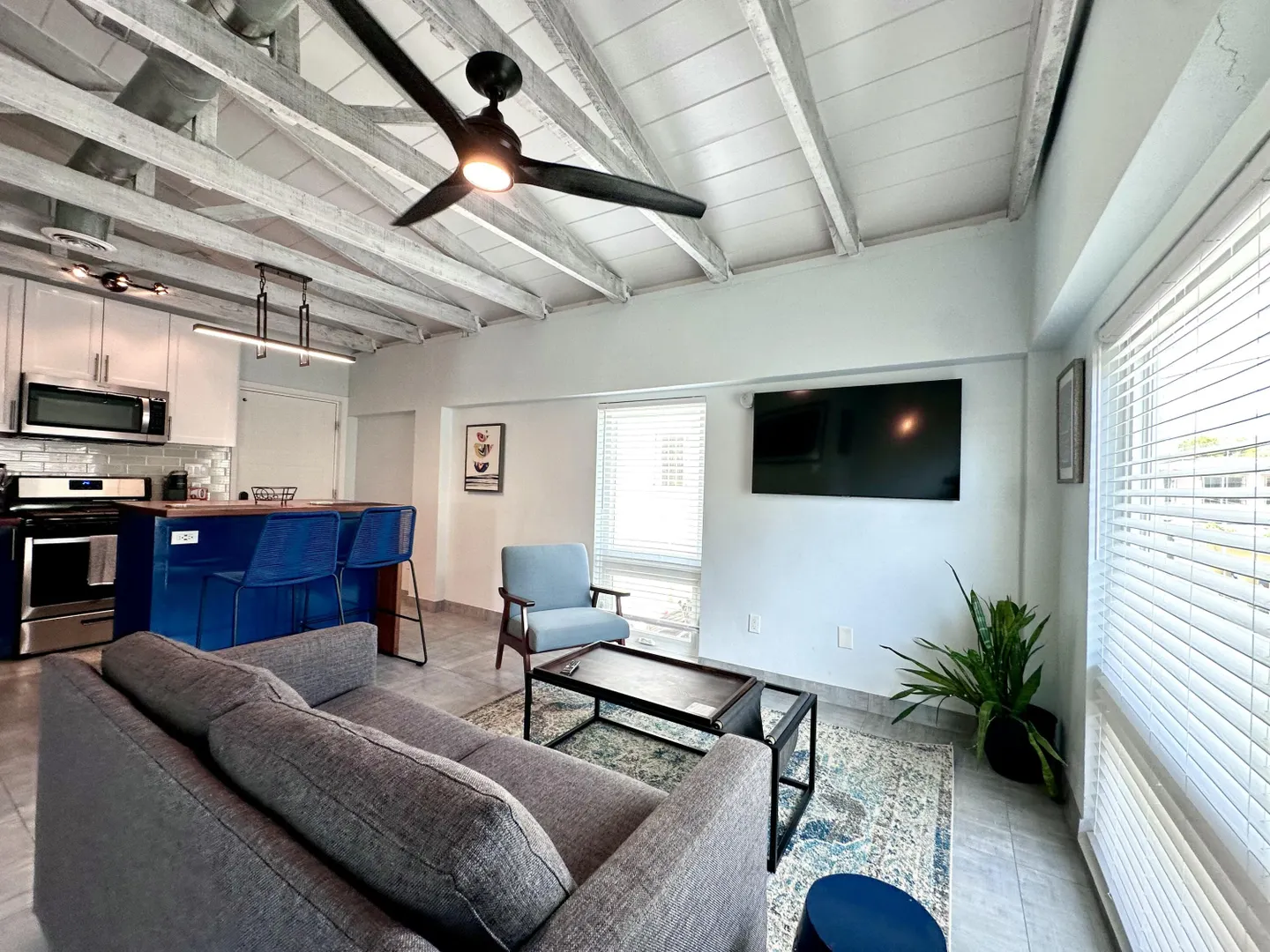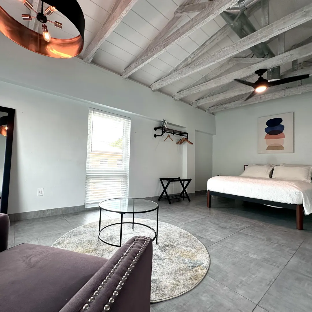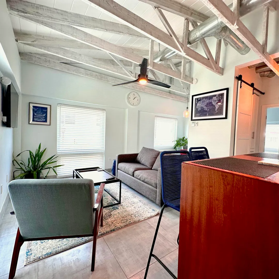 1-Bedroom/1-Bath upper-level apartment with a sea view in the heart of Christiansted Town. Unit is fully furnished with updated kitchen, private home office nook, central A/C, flat screen Smart TV, washer/dryer, WiFi, monthly pest control, & trash pick up. Private parking is available for Tenants. Unit is above a modern work space & cafe which features great breakfast, lunch, coffee, tea, and smoothies as well as private, enclosed work spaces with desks perfect for remote work. Dinner is available at the downstairs restaurant which also features a Beergarden & cocktail/wine bar. Unit is cozy and provides both quiet privacy with updated windows and central A/C and convenience just outside. Walking distance to restaurants, bars, stores, groceries, banks, & a public park.