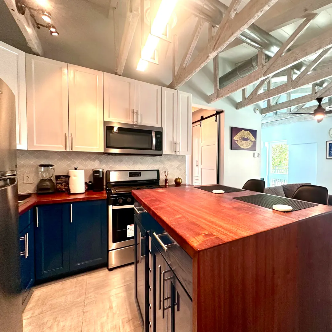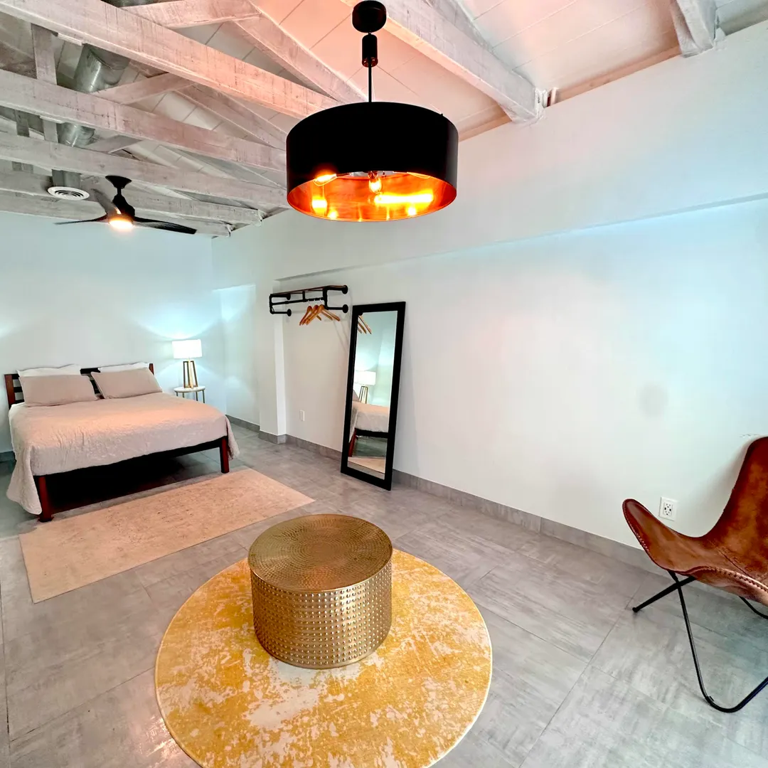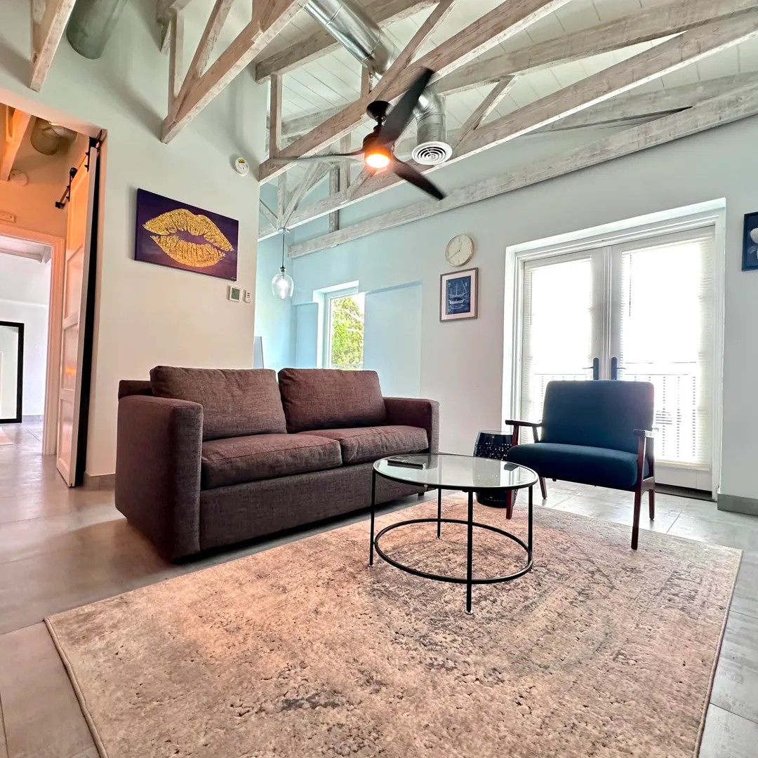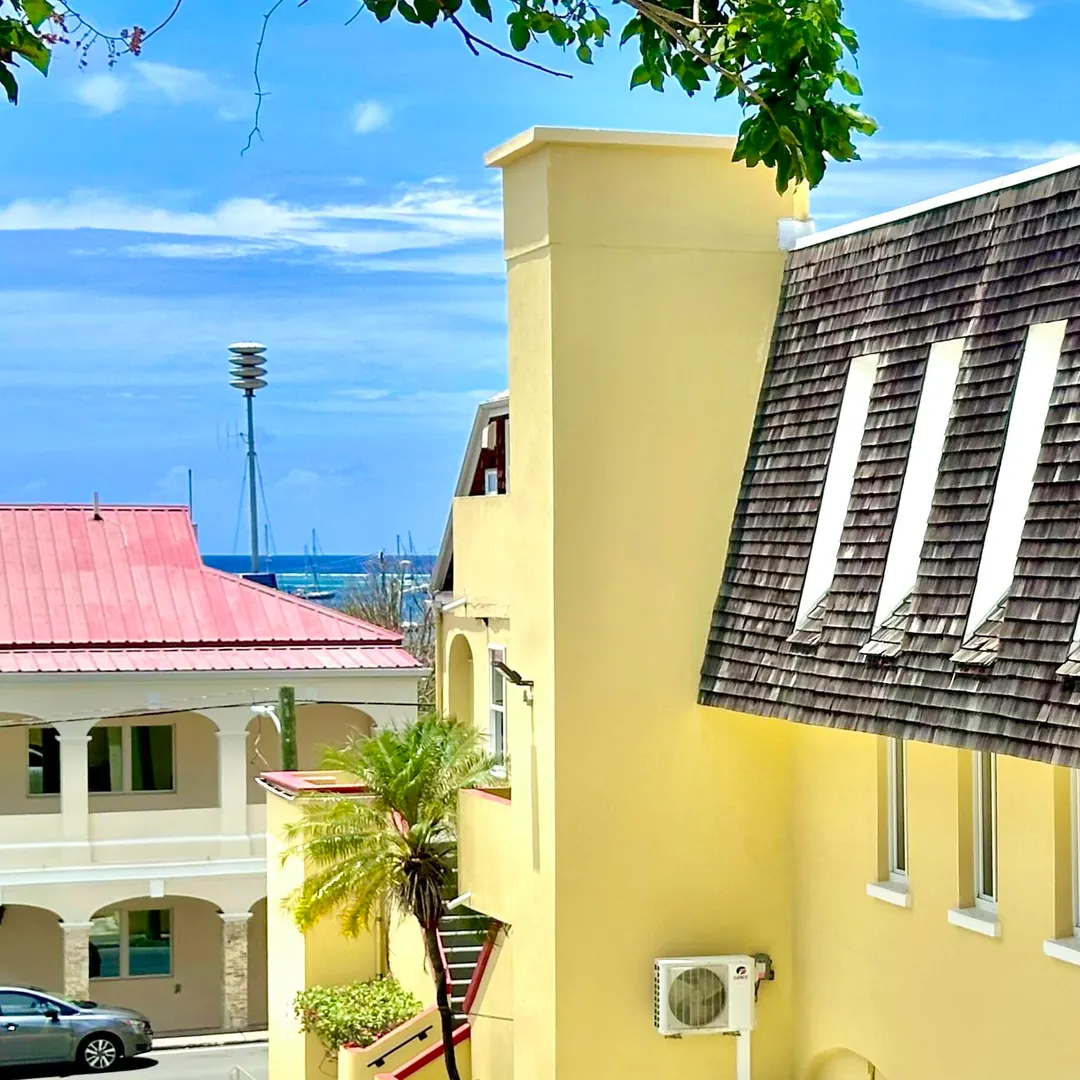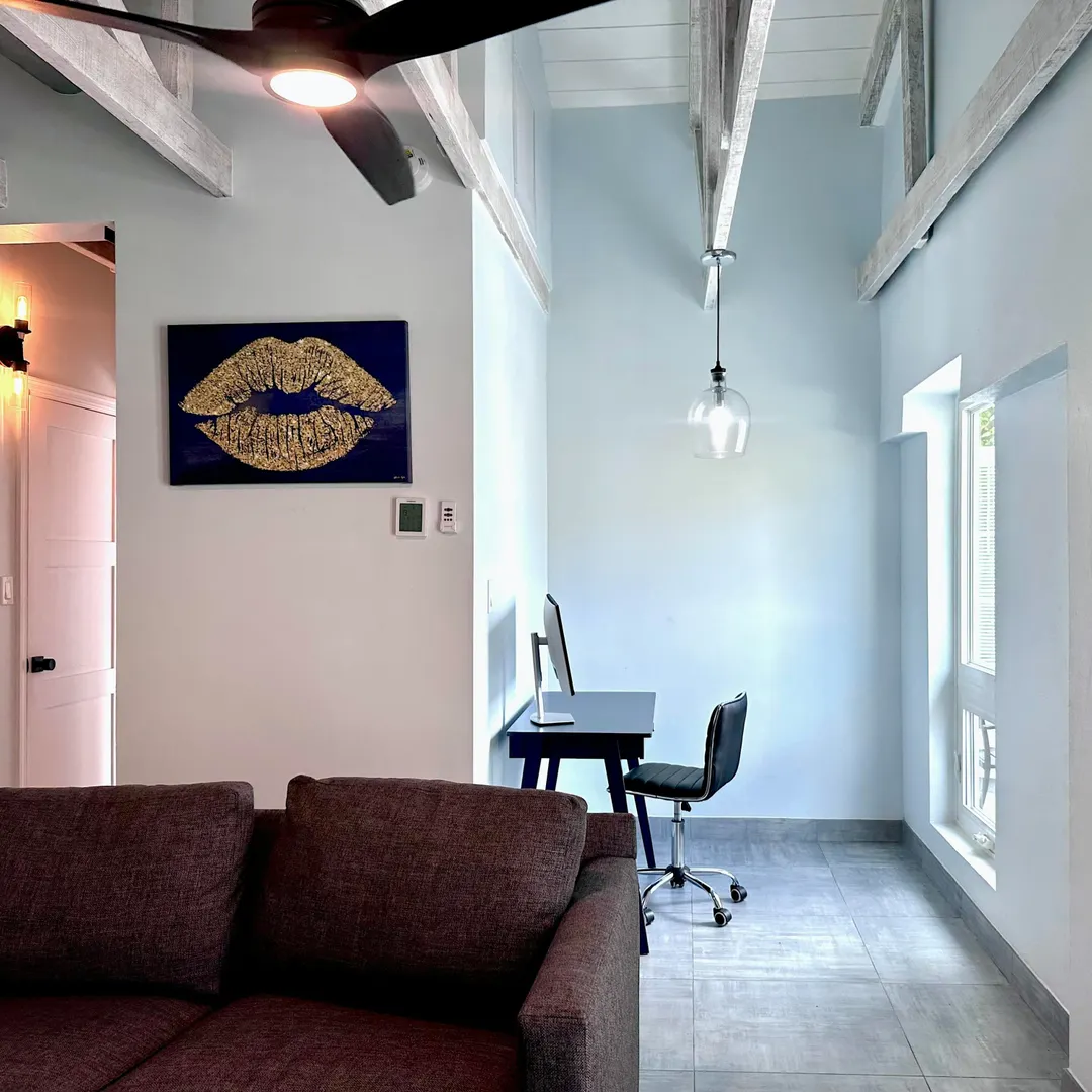 1-Bedroom/1-Bath upper-level apartment with a sea view in the heart of Christiansted Town. Unit is fully furnished with updated kitchen, private home office nook with desk, central A/C, flat screen Smart TV, washer/dryer, WiFi, monthly pest control, & trash pick up. Tenant pays utilities & a $50/Mo water fee. Private parking is available for Tenants. Unit is above a modern work space & cafe which features great breakfast, lunch, coffee, tea, & smoothies as well as private, enclosed work spaces with desks perfect for remote work. Dinner is available at the downstairs restaurant which also features a Biergarten & cocktail/wine bar. Unit is cozy and provides both quiet privacy with updated windows and central A/C. Walking distance to restaurants, bars, stores, groceries, banks, & a public p